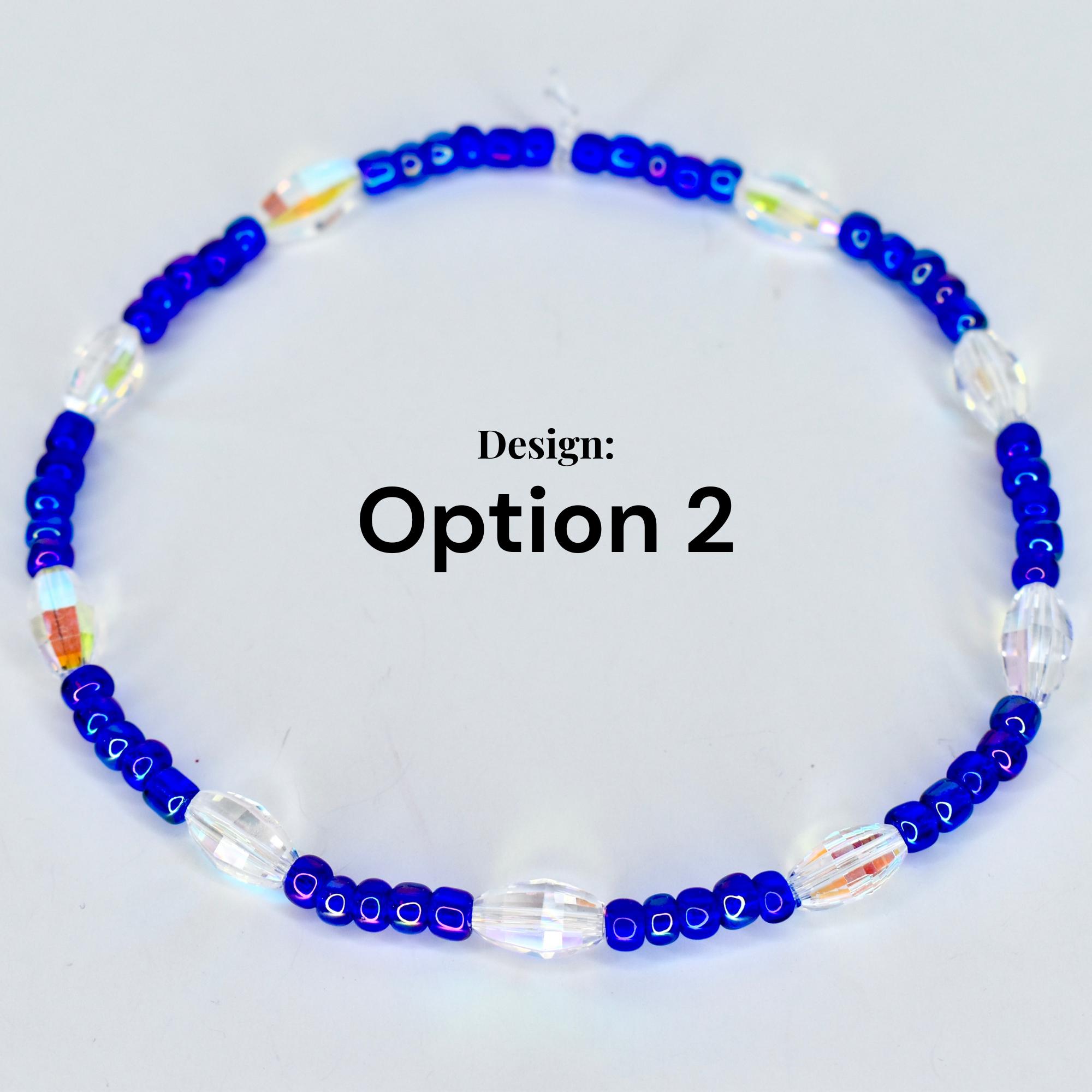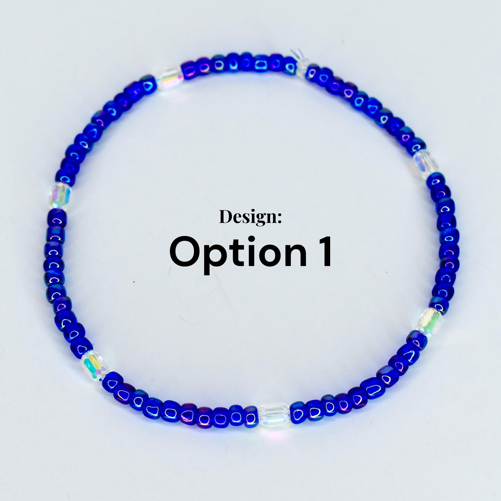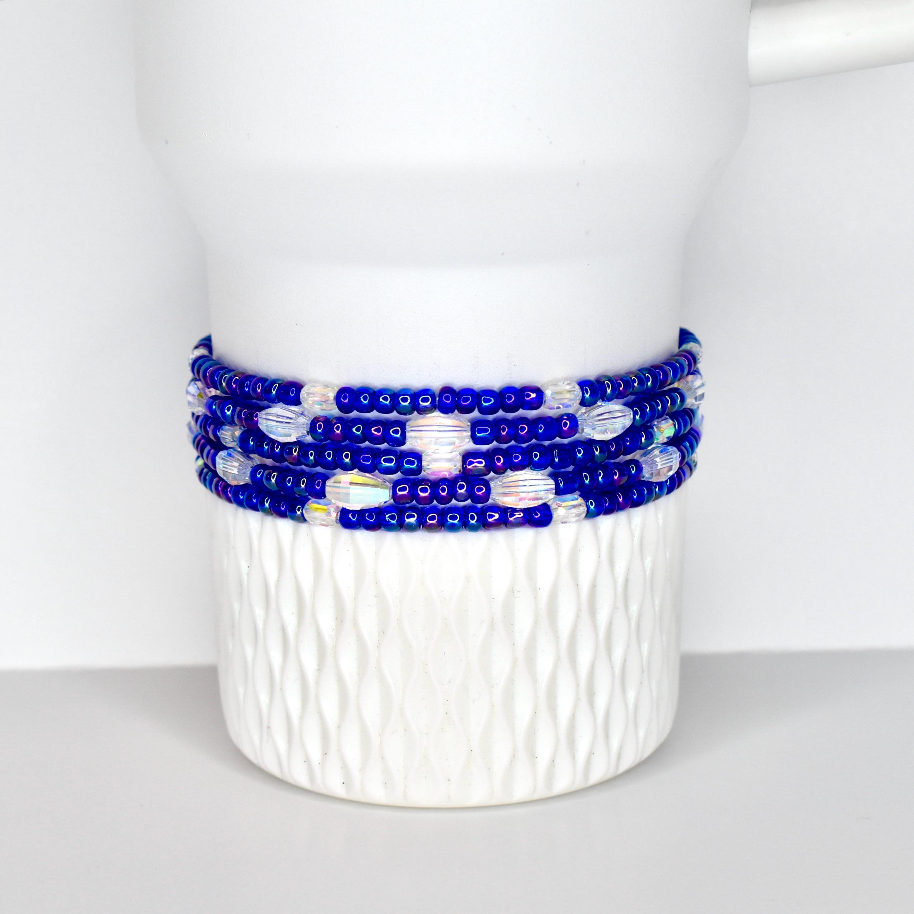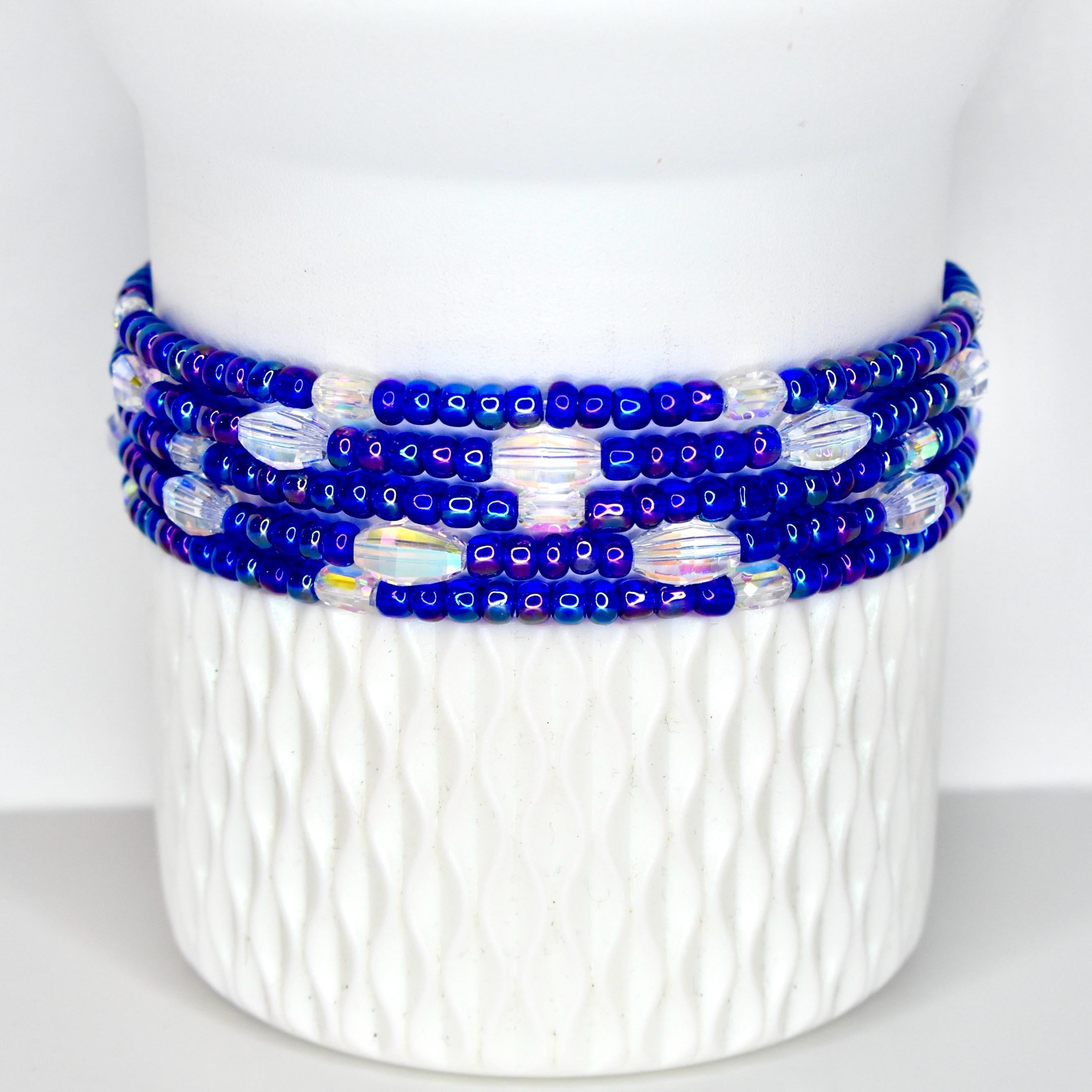 This handcrafted stretch bracelet features royal blue iridescent seed beads alternating with sparkling faceted AB crystal oval accents that catch light from every angle. The crystal beads flash rainbow — blue, purple, gold — thanks to their AB coating, making this bracelet as eye-catching on your favorite tumbler as it is on your wrist.