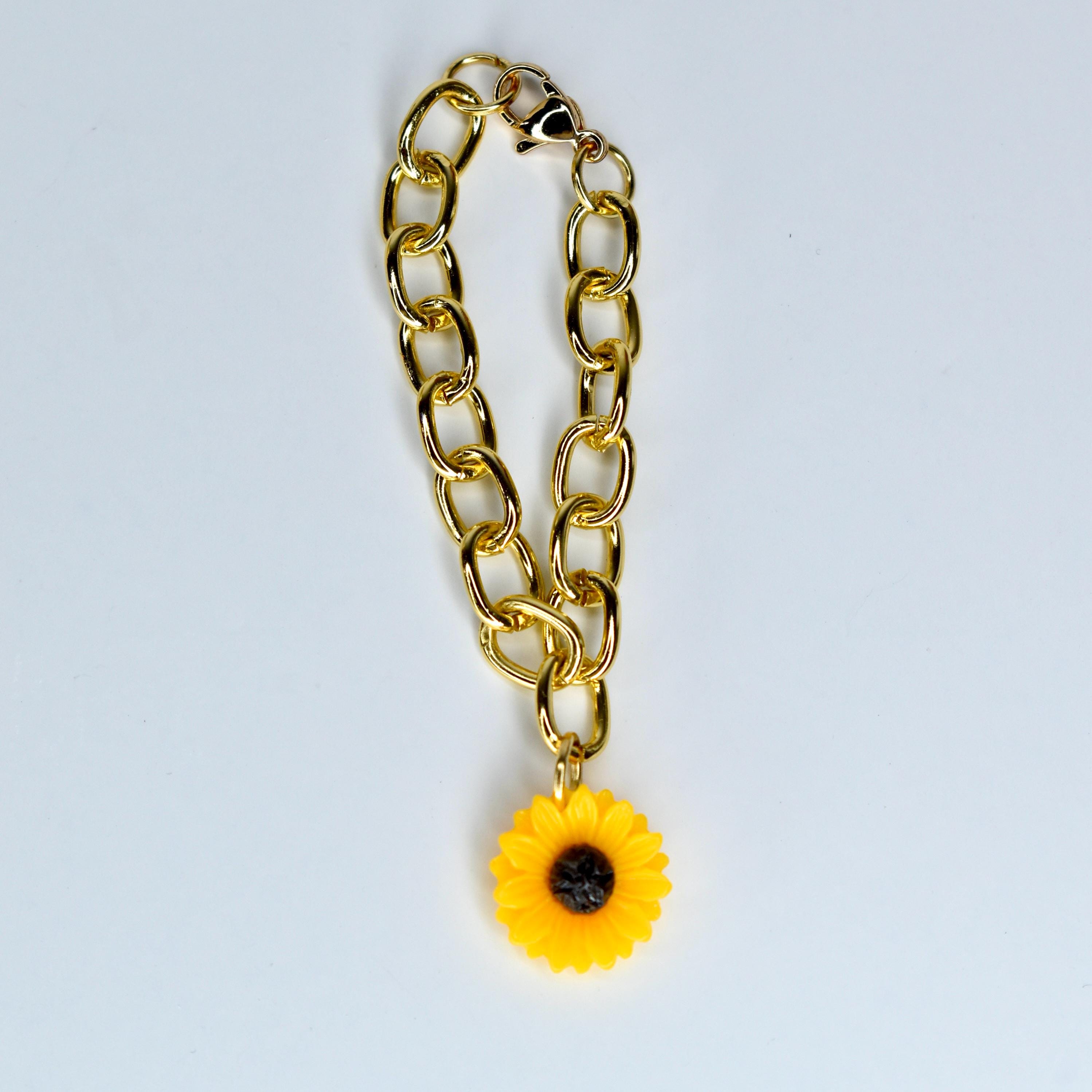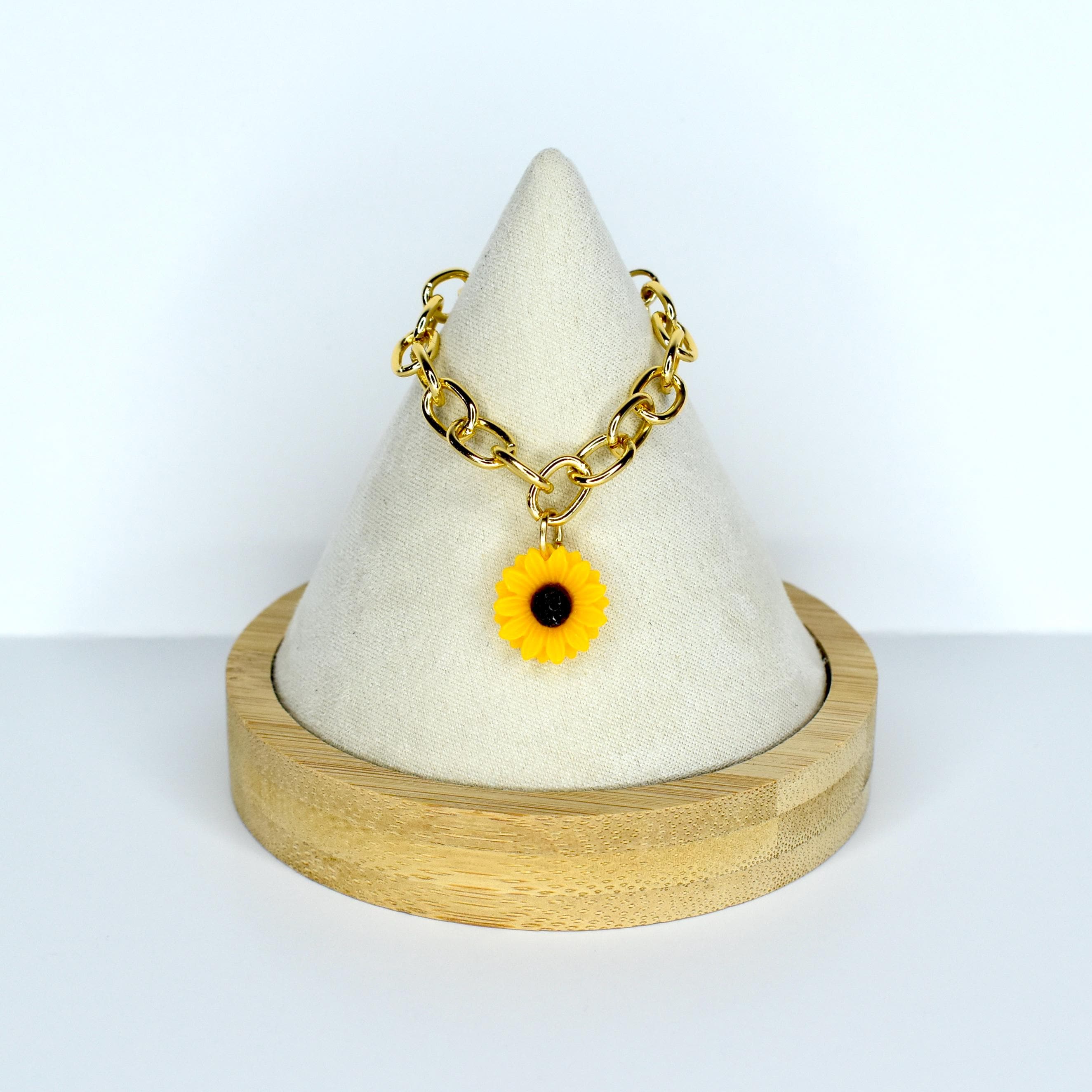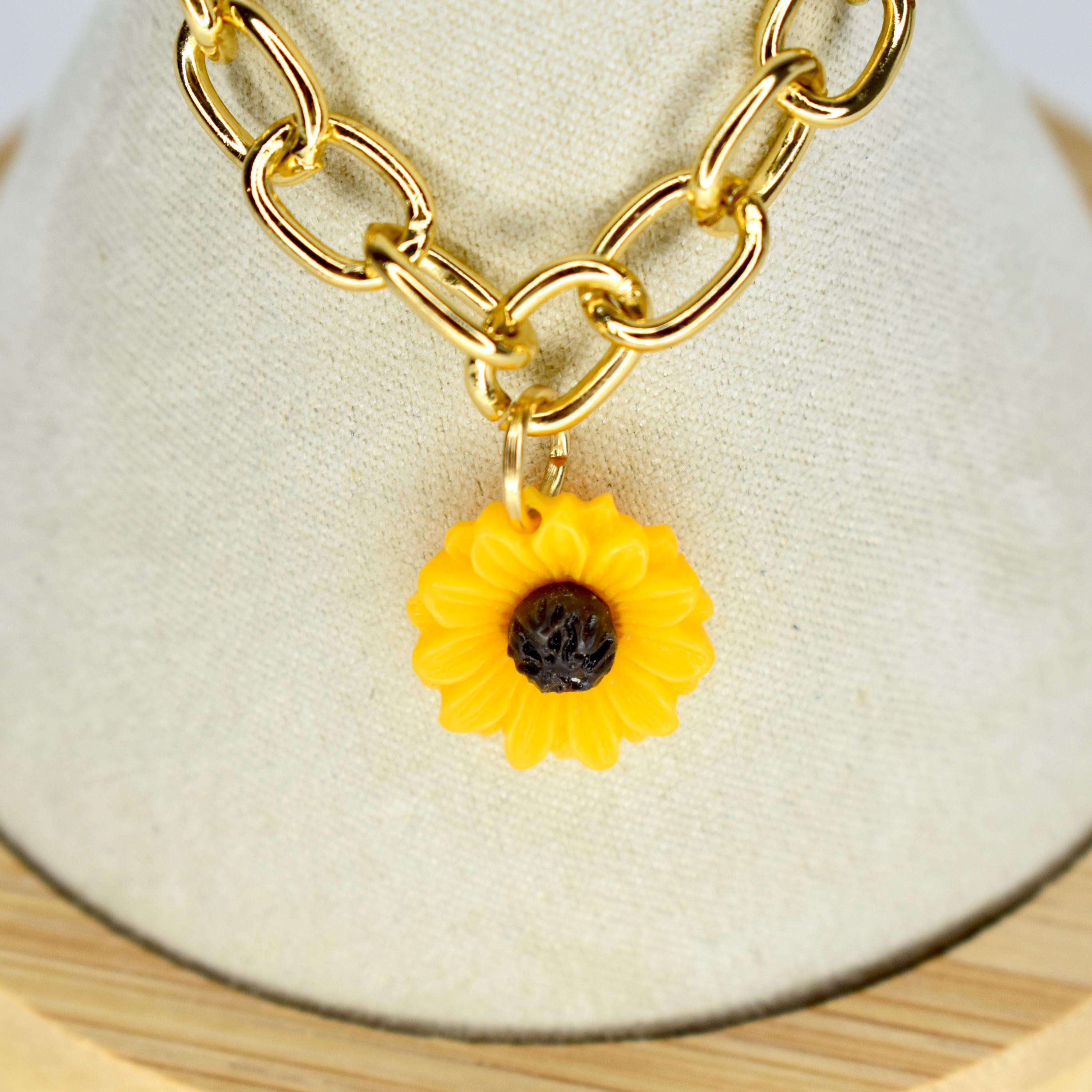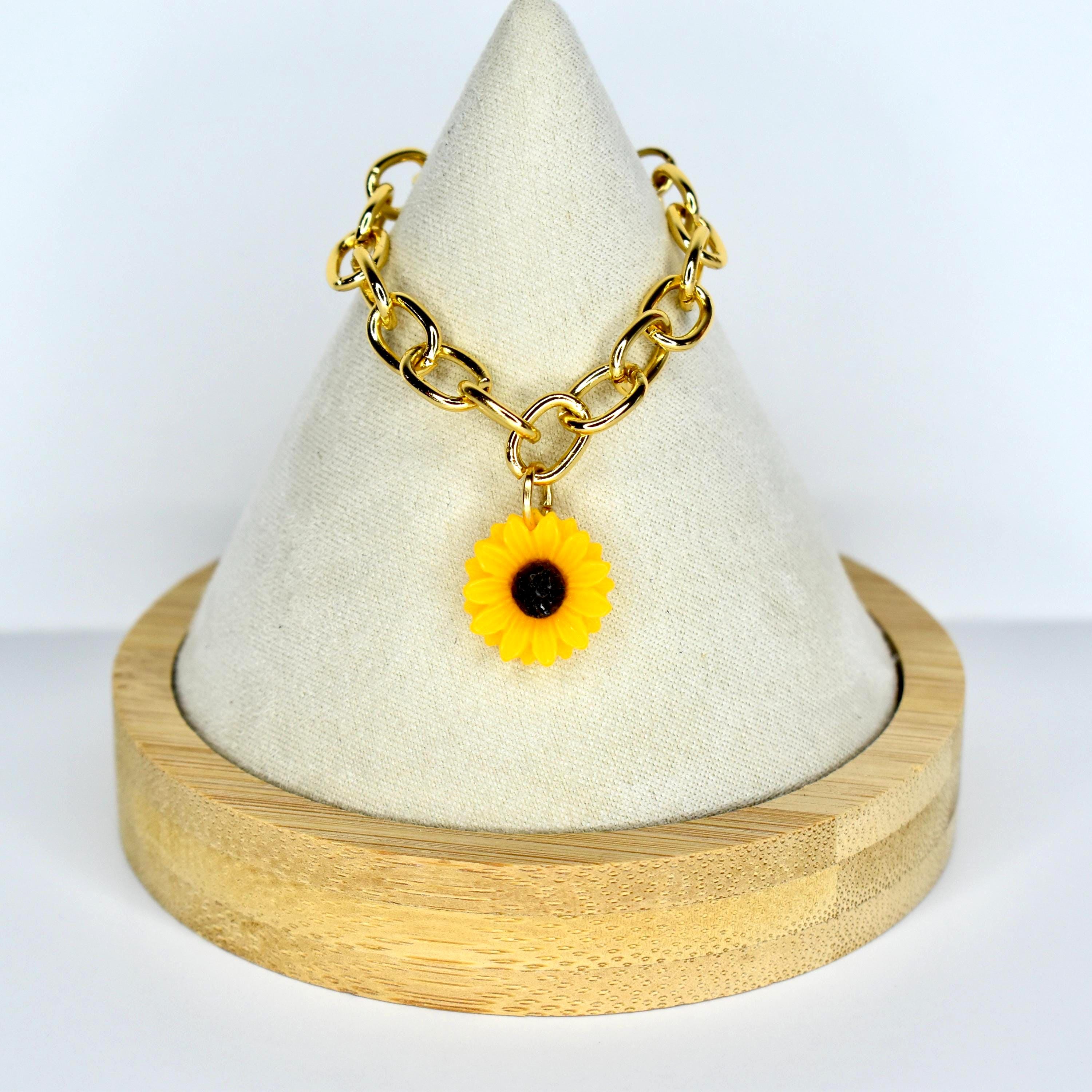 Bring a little sunshine to your collectible monster doll's look with this chunky gold chain mini necklace featuring an adorable resin sunflower charm! The oversized gold oval chain links give this piece a bold, fashion-forward energy while the cheerful yellow sunflower pendant keeps it sweet and playful.