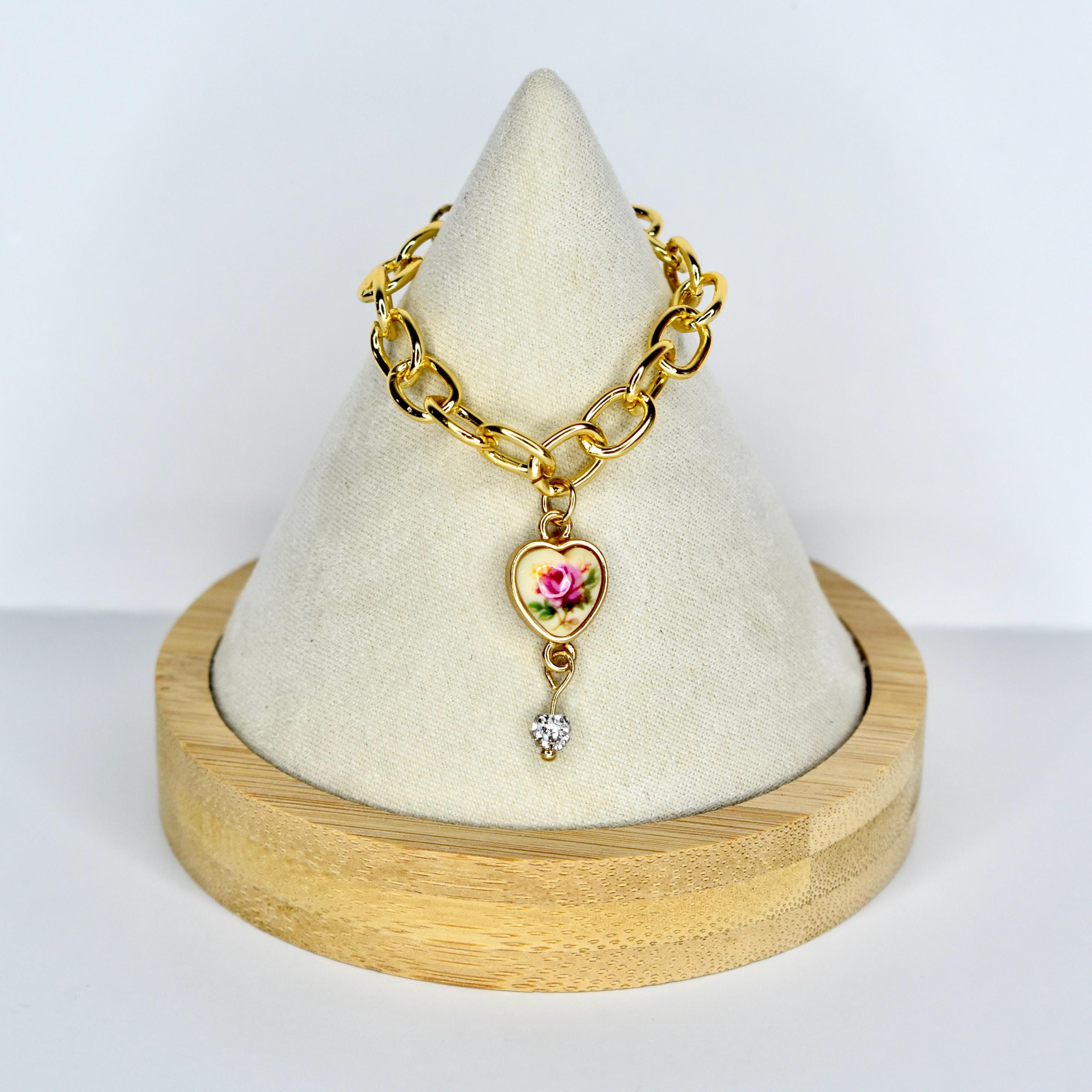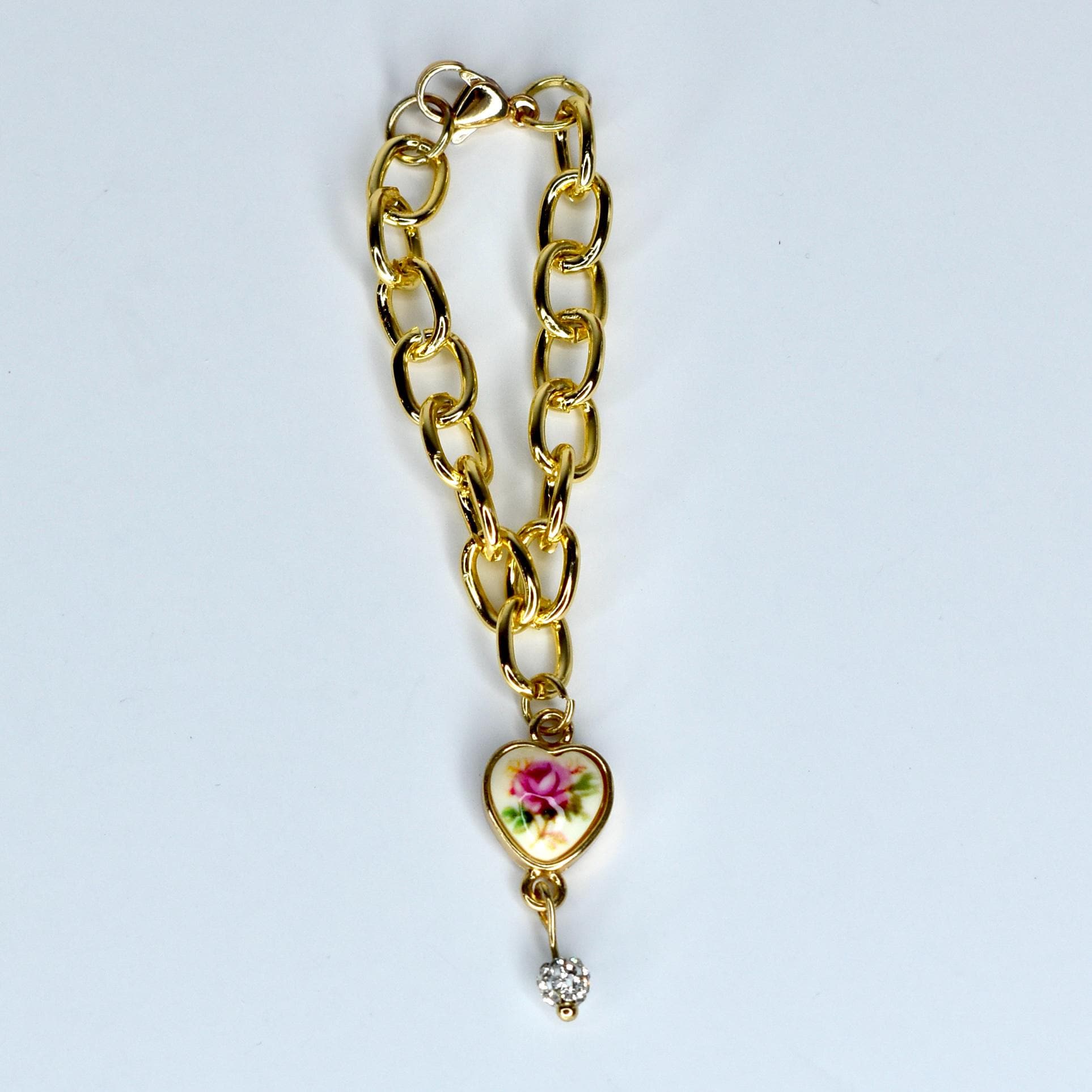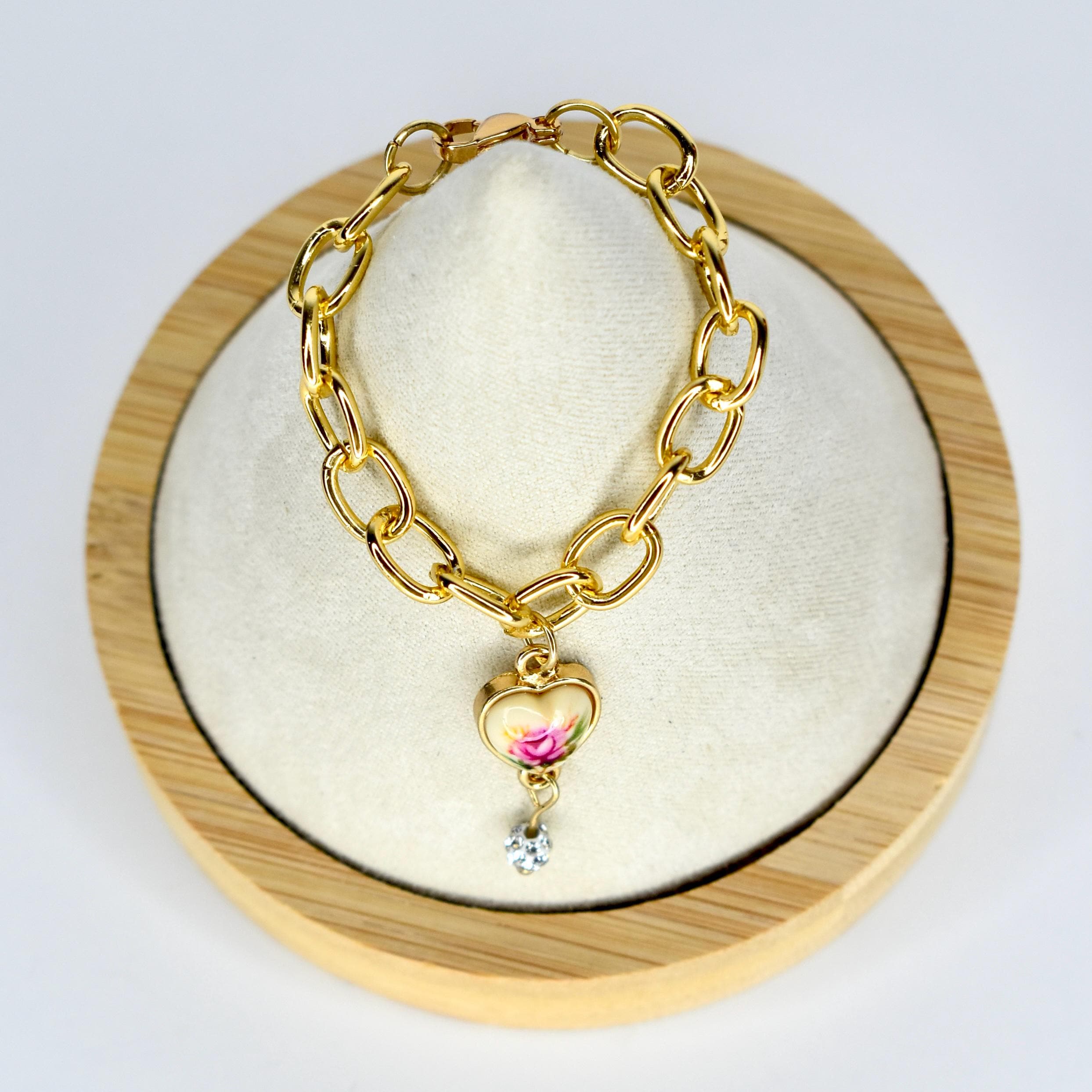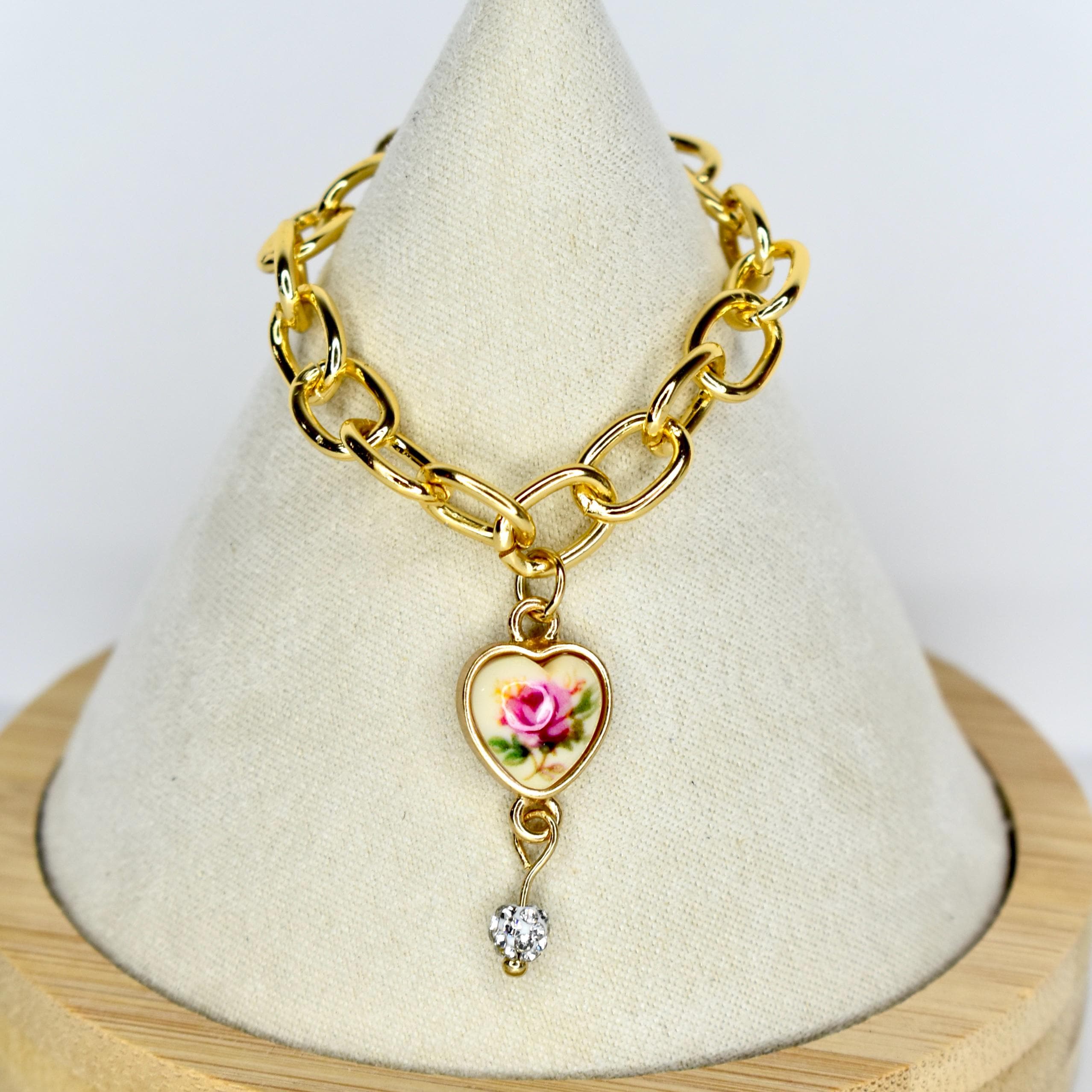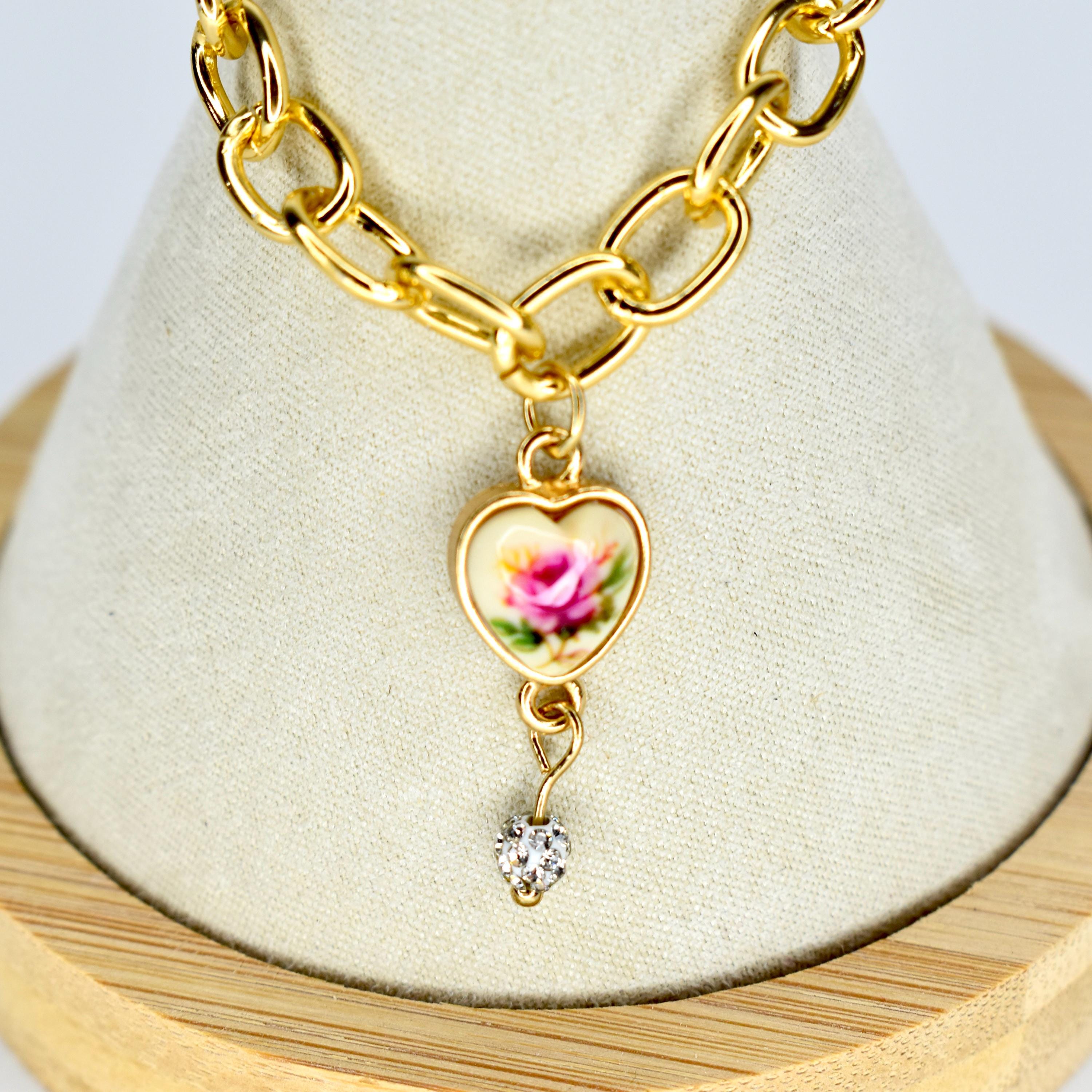 This mini necklace is giving vintage romance and old-world elegance. A bold chunky gold chain is paired with a delicate heart pendant featuring a painted pink rose on a cream background, finished with a dangling crystal droplet beneath — the combination is nothing short of breathtaking.