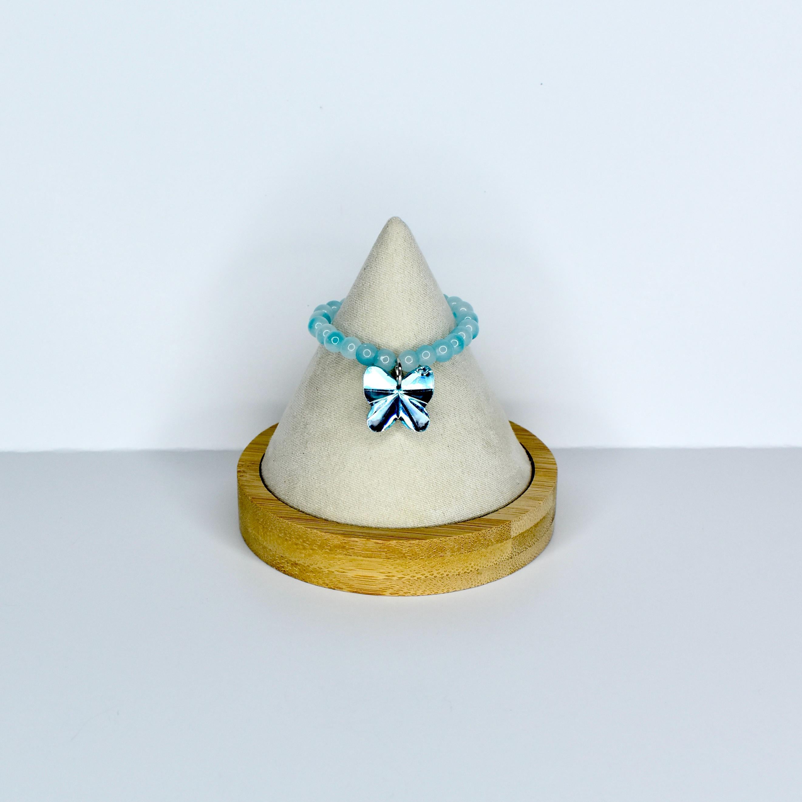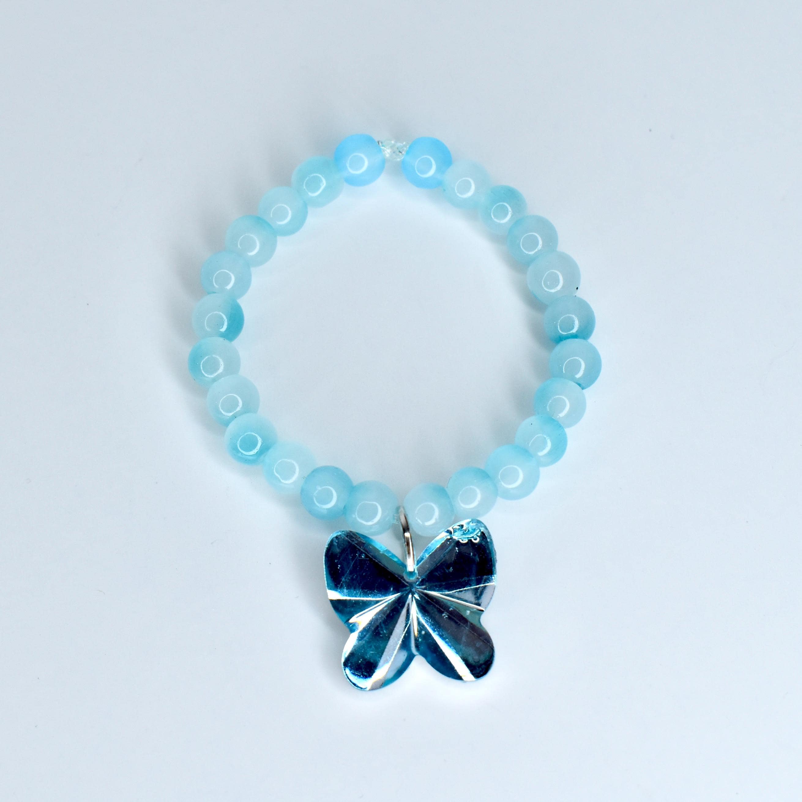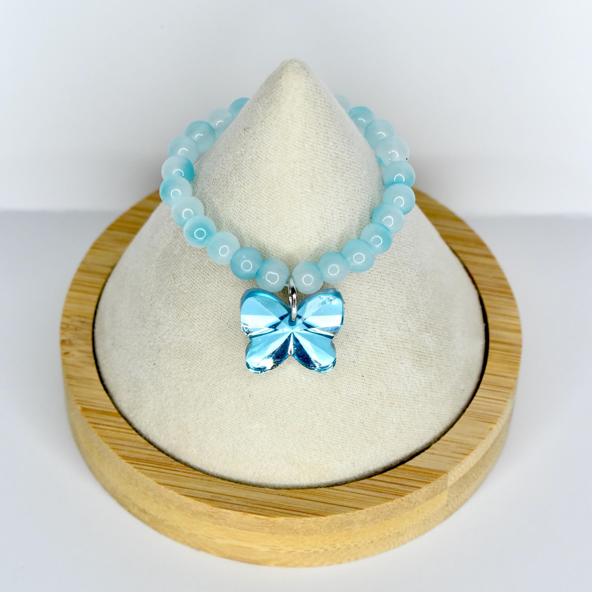 Soft, serene and absolutely ethereal — this baby blue frosted bead doll necklace with a bold silver butterfly charm is a standout piece for any collectible monster doll display. The matte aqua blue beads have a smooth, chalky finish that creates a beautiful contrast against the chunky, faceted silver butterfly pendant.