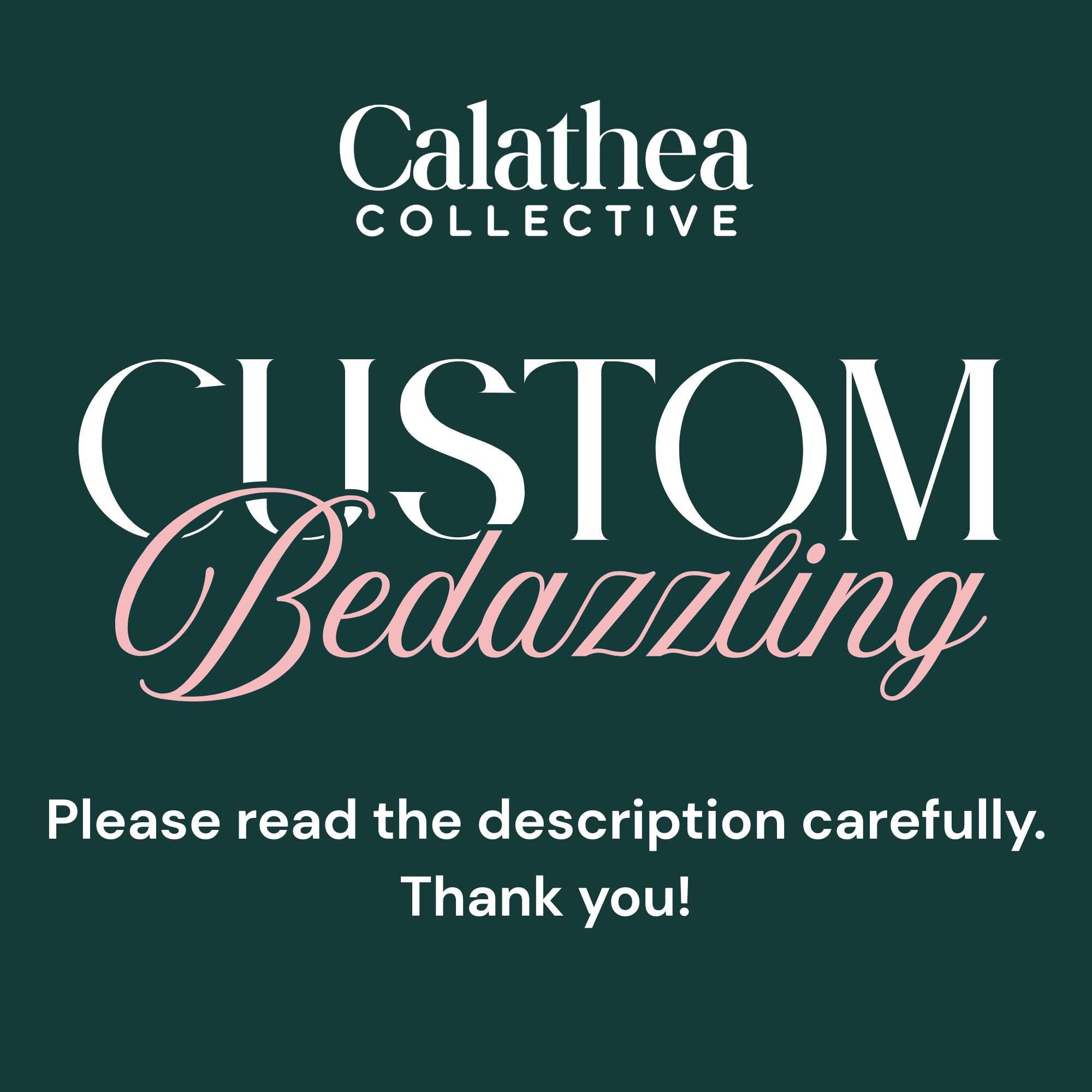 This is a mail-in bedazzling service by Calathea Collective — a one-woman studio with 1,000+ custom orders fulfilled across 47 states. Your bag is in good hands.
