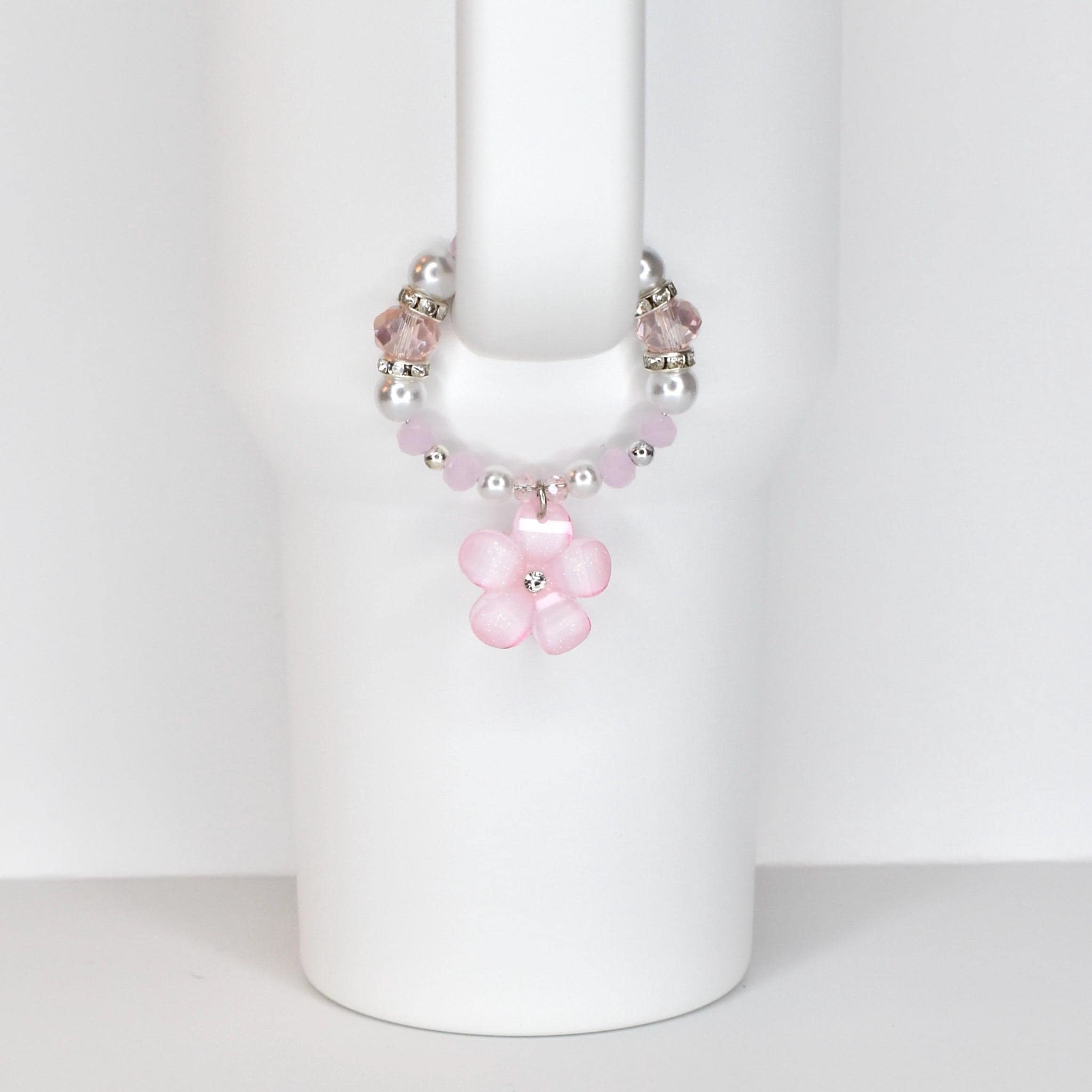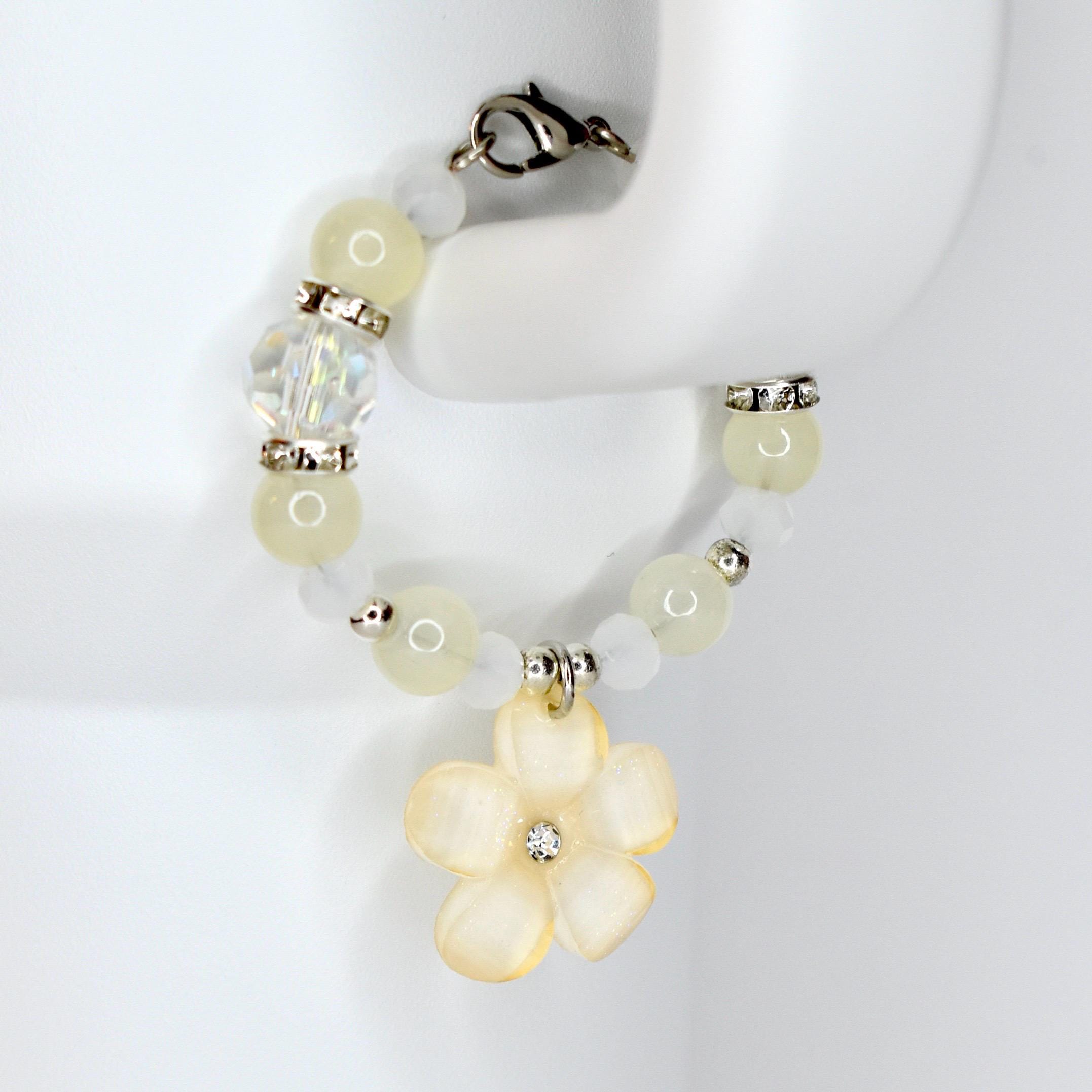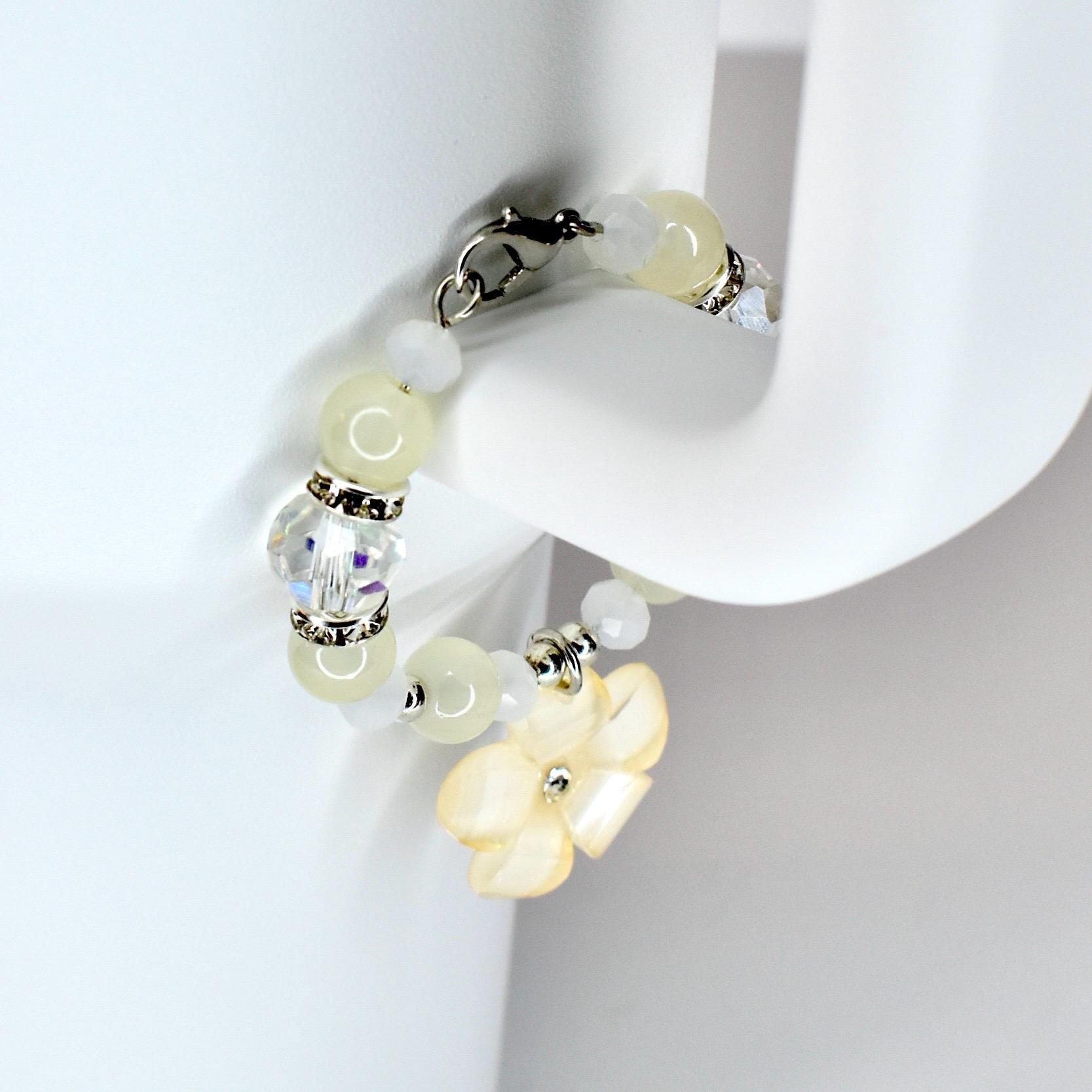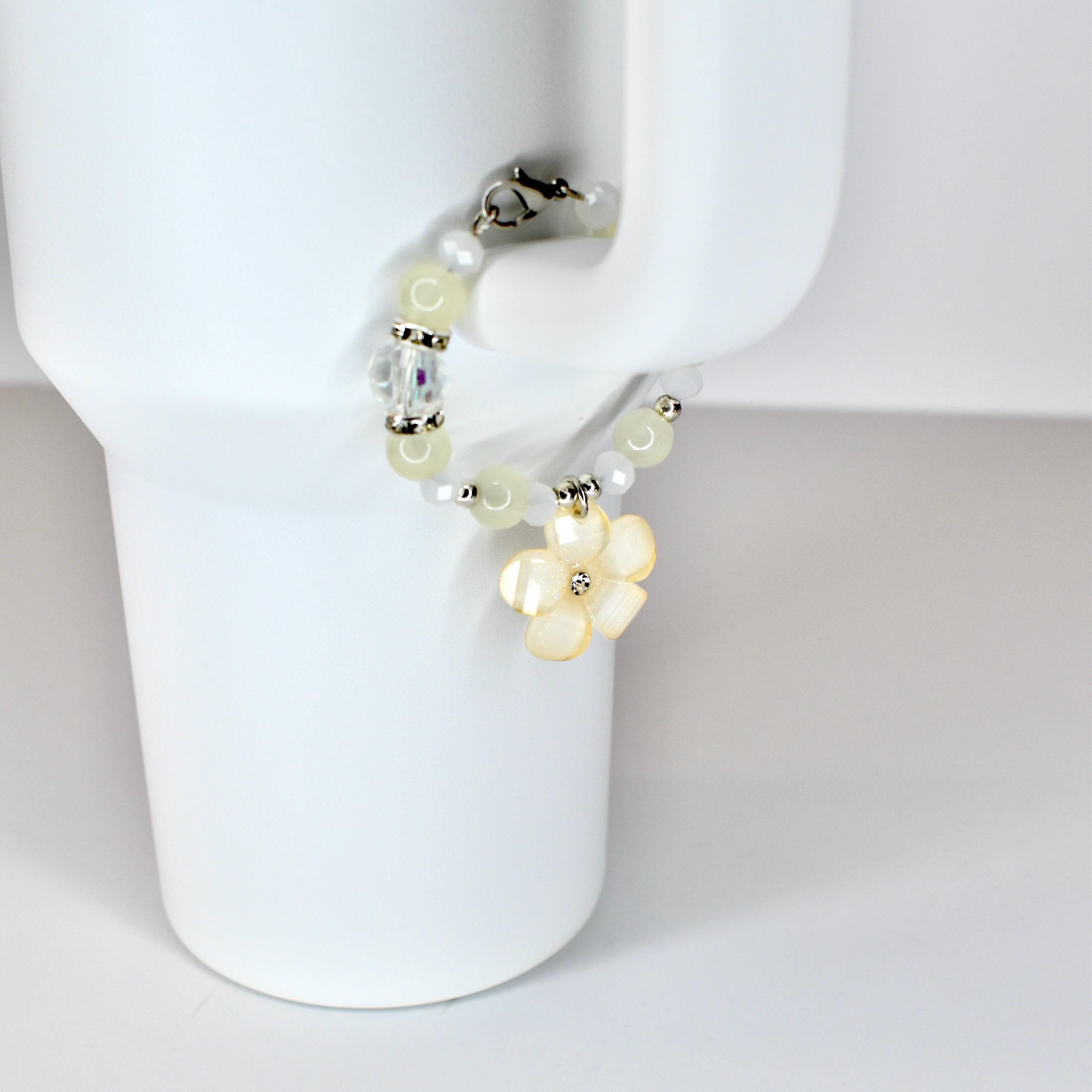 Handmade beaded tumbler handle bracelet featuring a mother-of-pearl flower pendant, crystal beads, pearl accents and rhinestone spacers. Attaches easily with a lobster claw clasp. Available in blush pink, butter yellow and sage green.