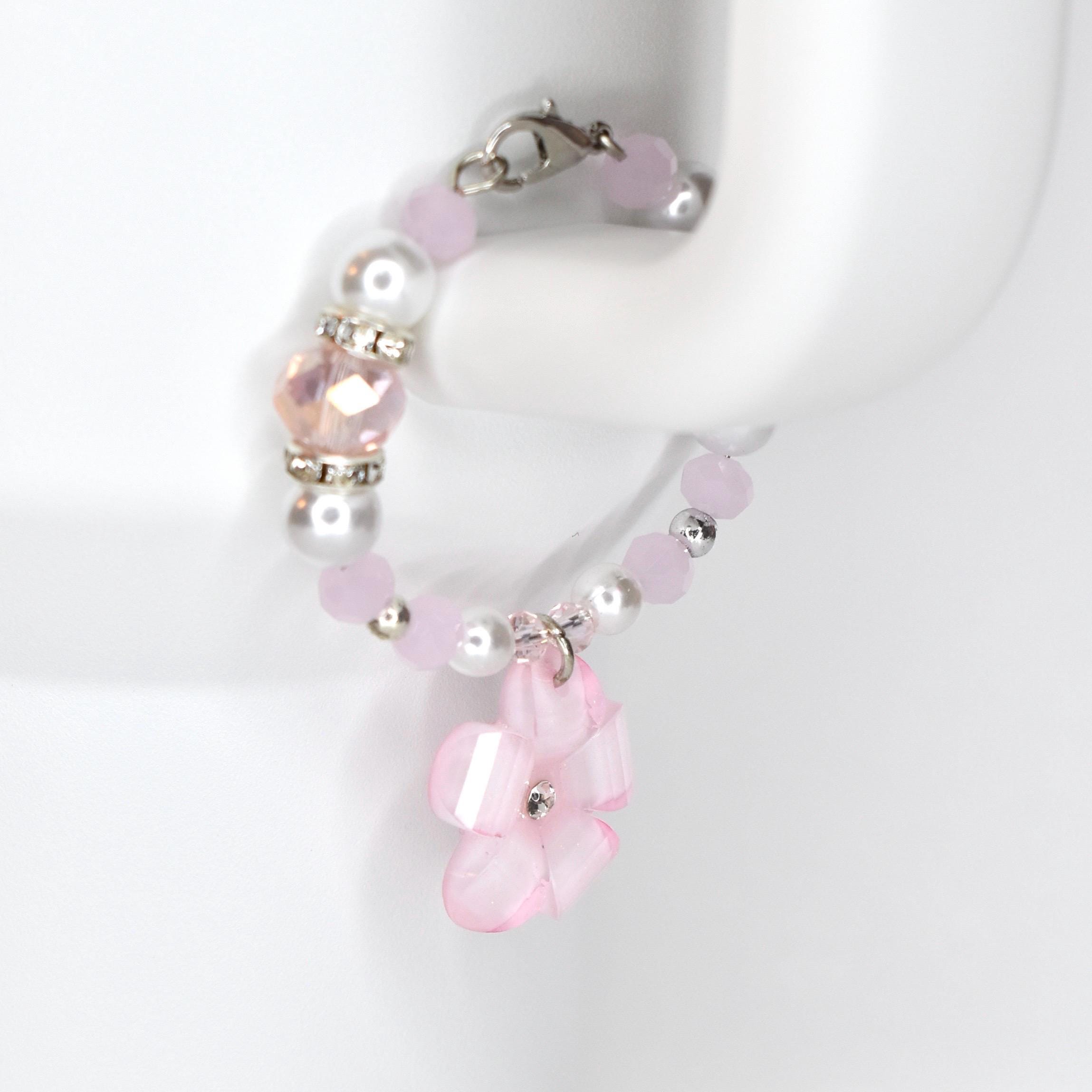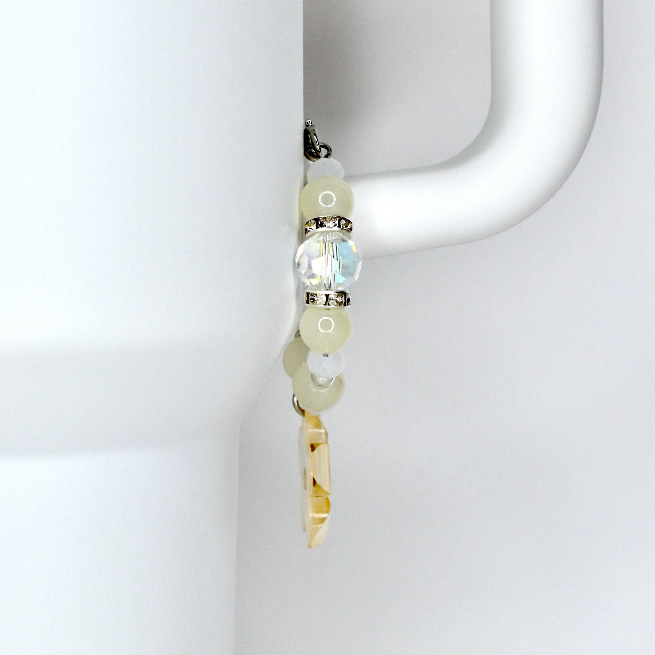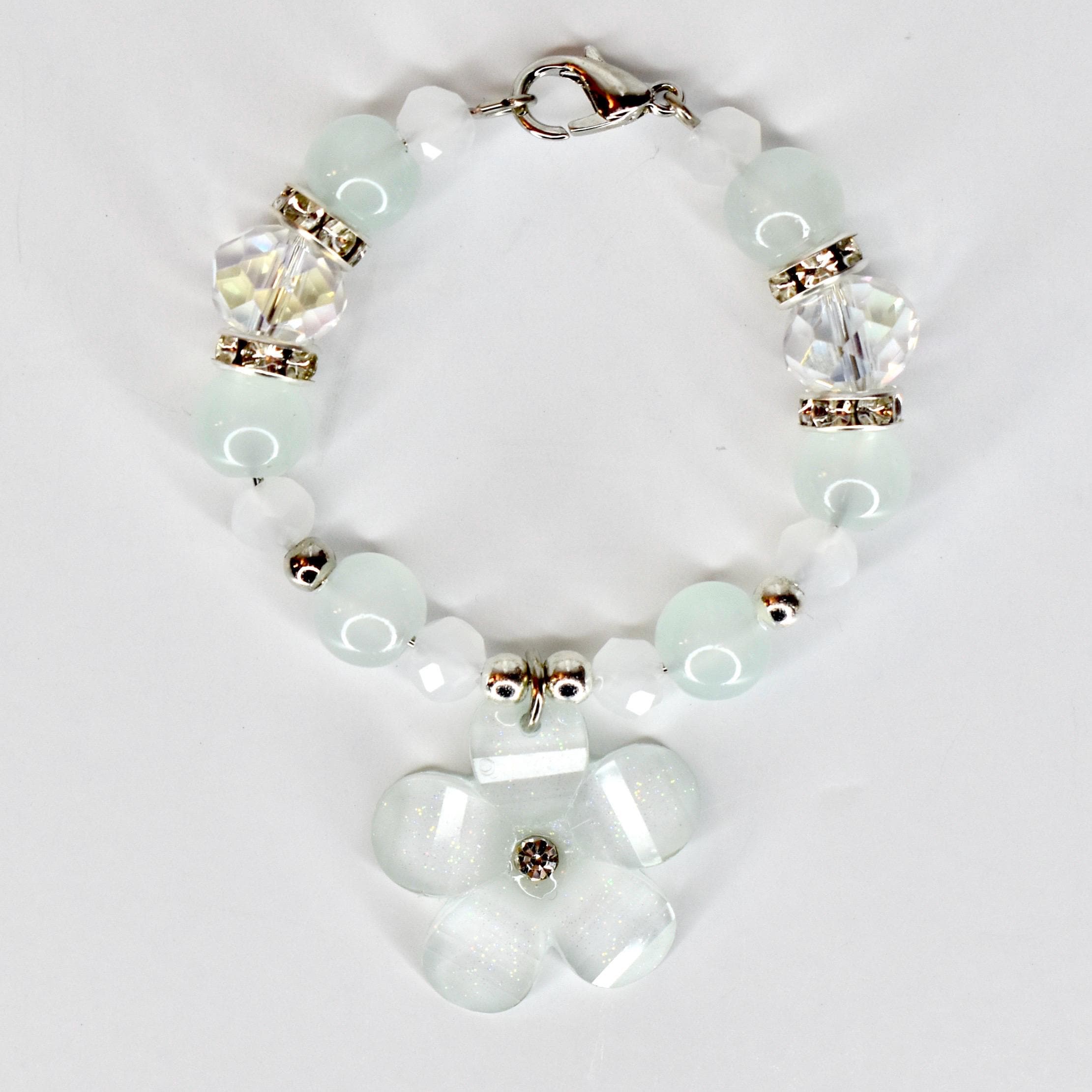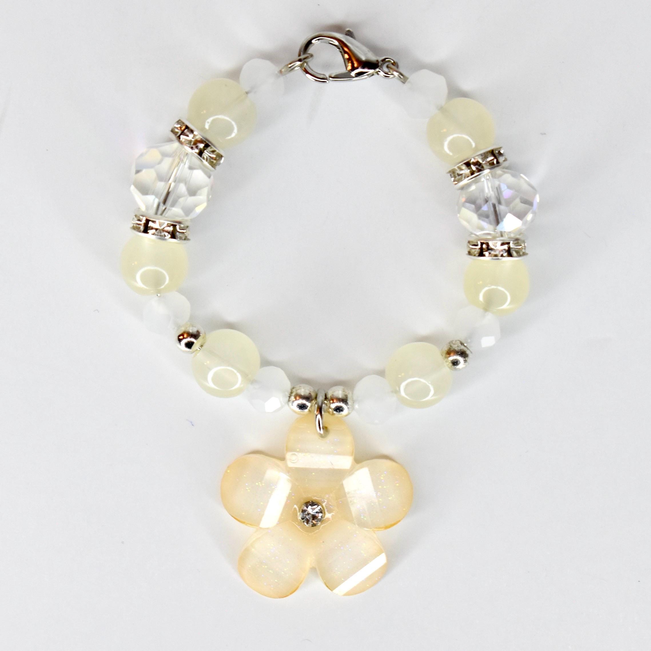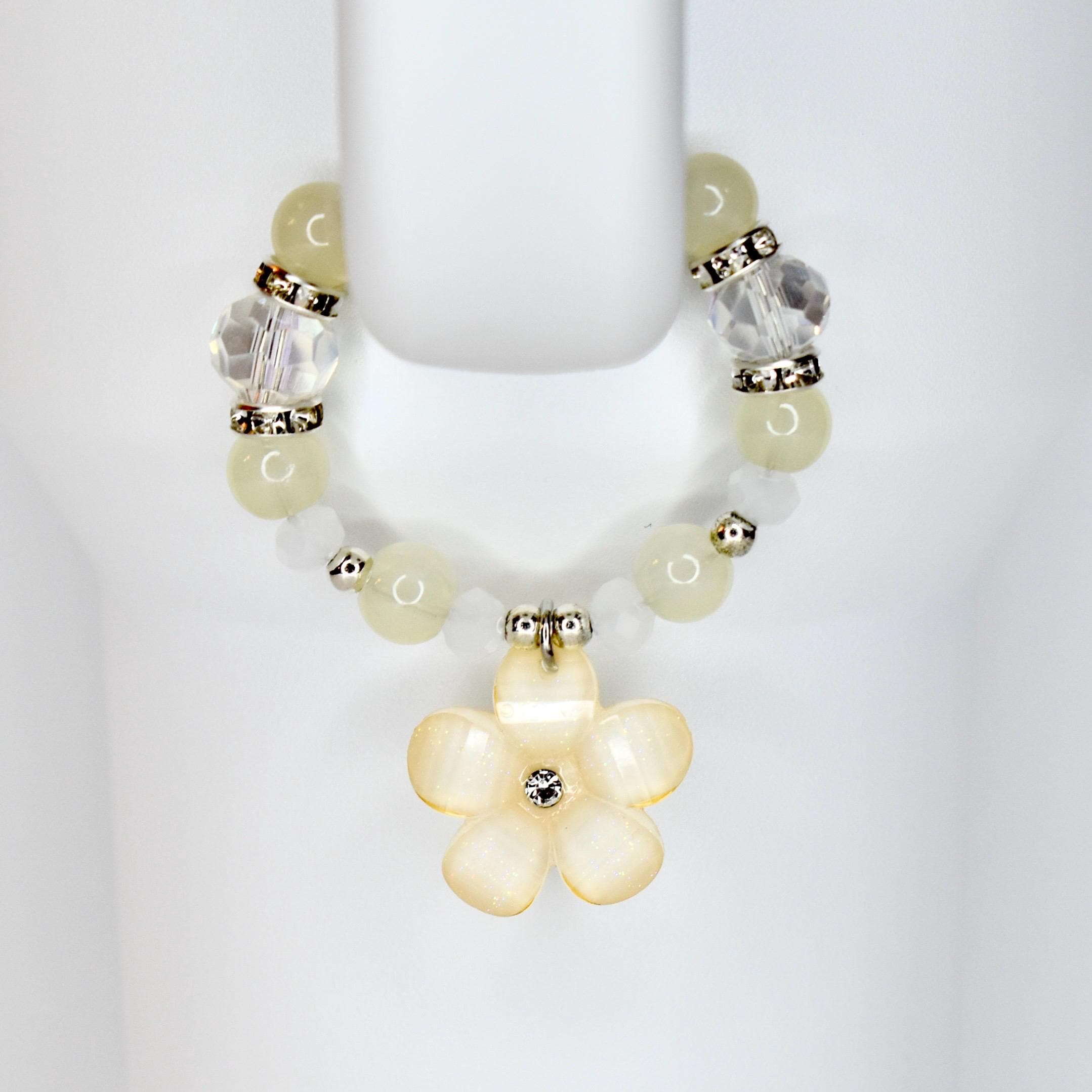 Handmade beaded tumbler handle bracelet featuring a mother-of-pearl flower pendant, crystal beads, pearl accents and rhinestone spacers. Attaches easily with a lobster claw clasp. Available in blush pink, butter yellow and sage green.