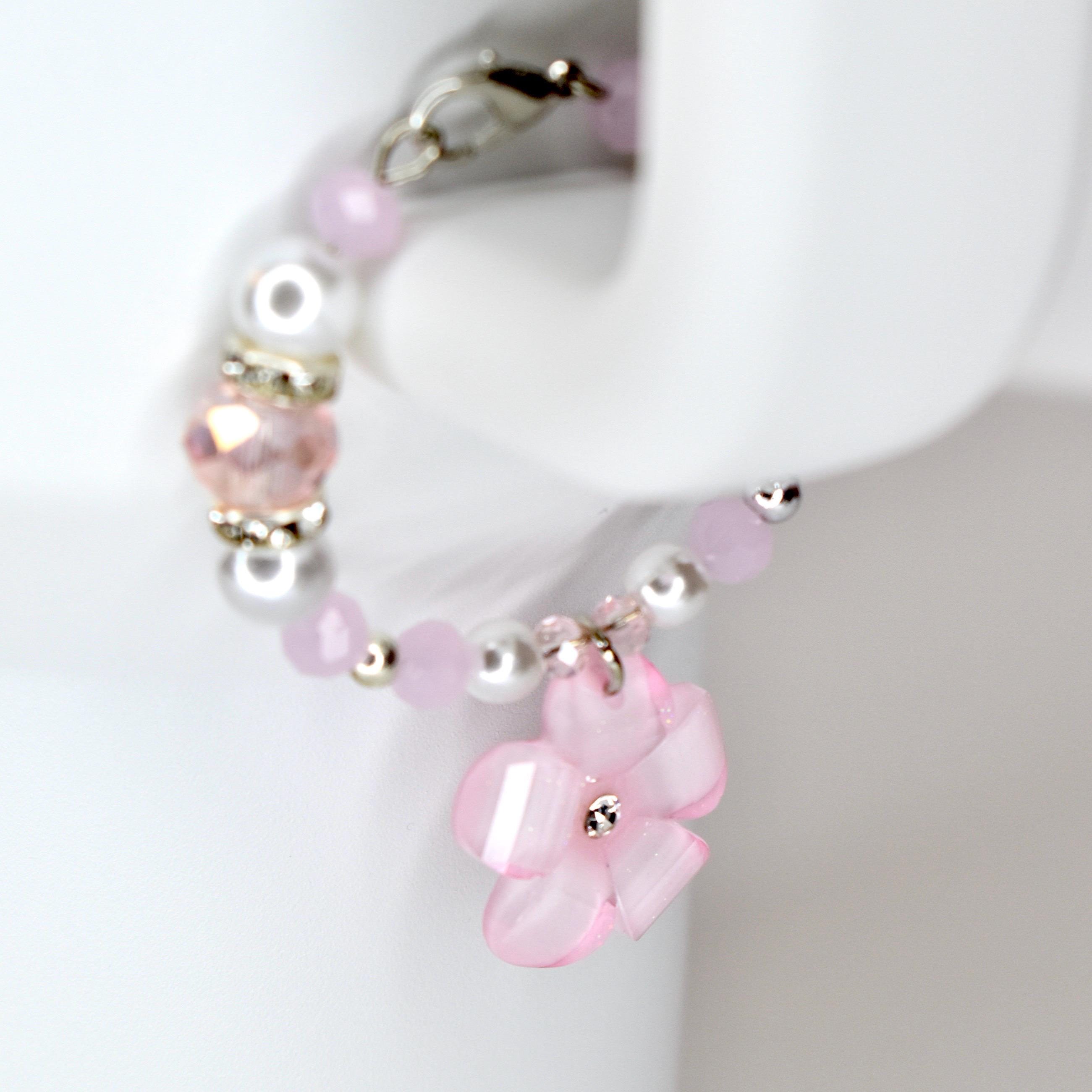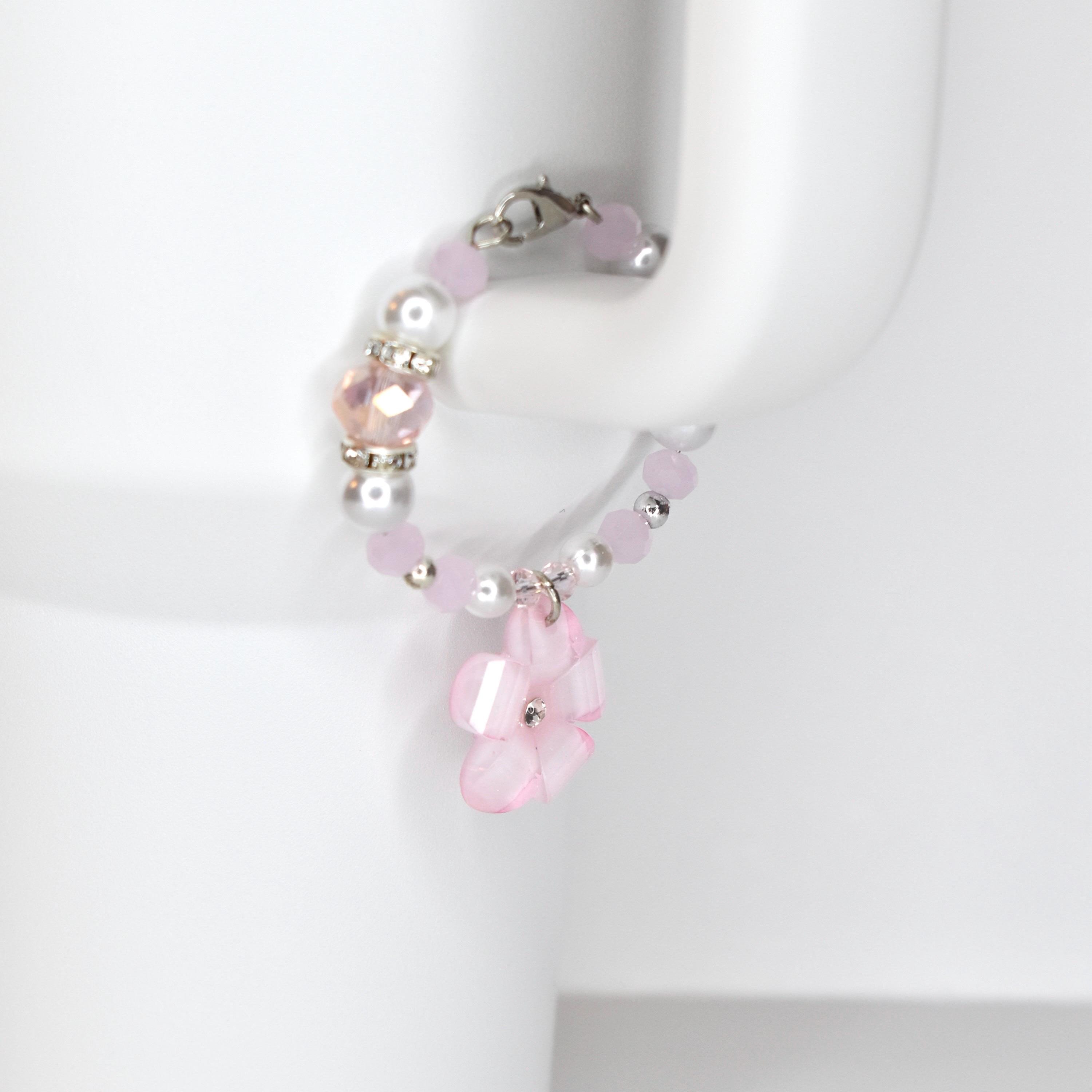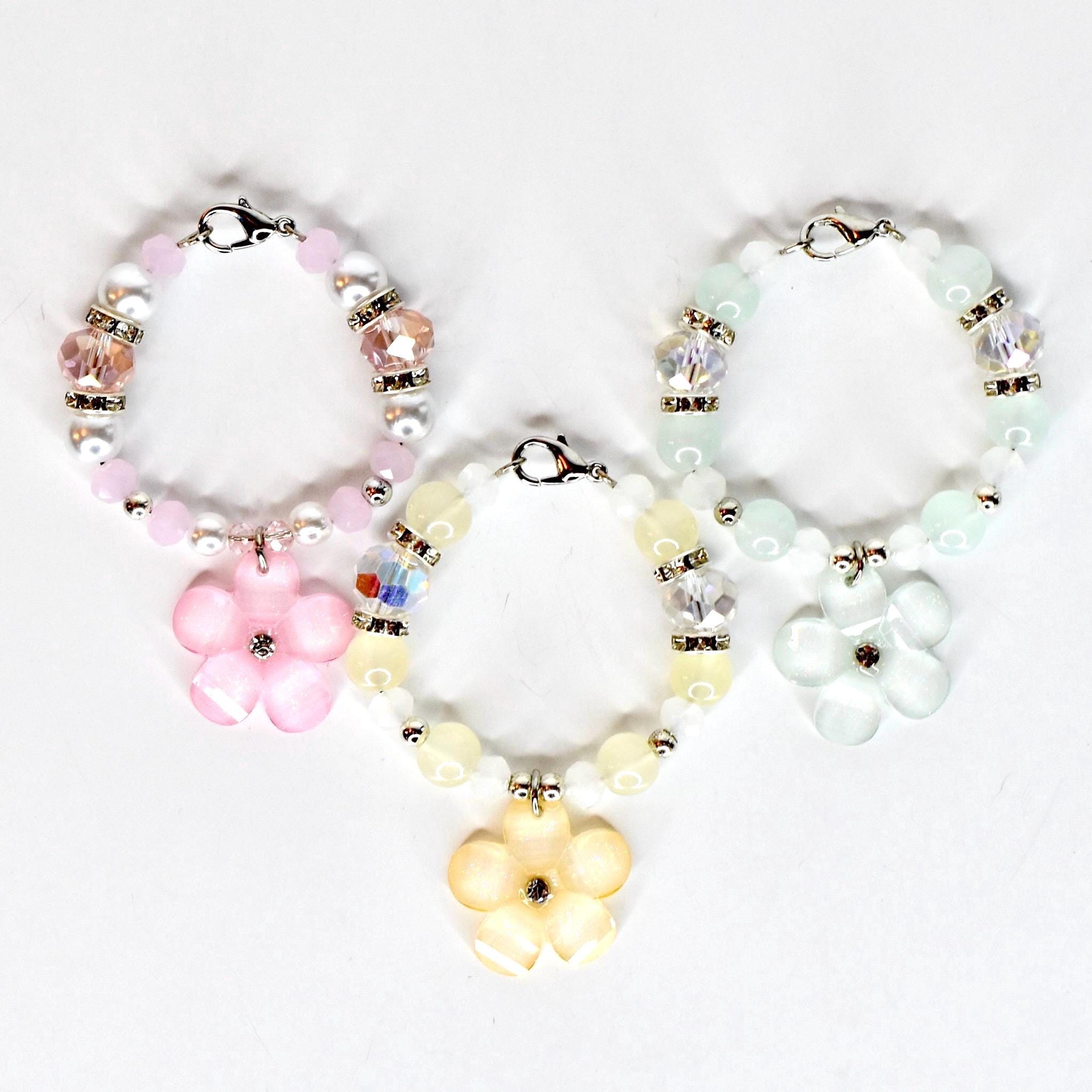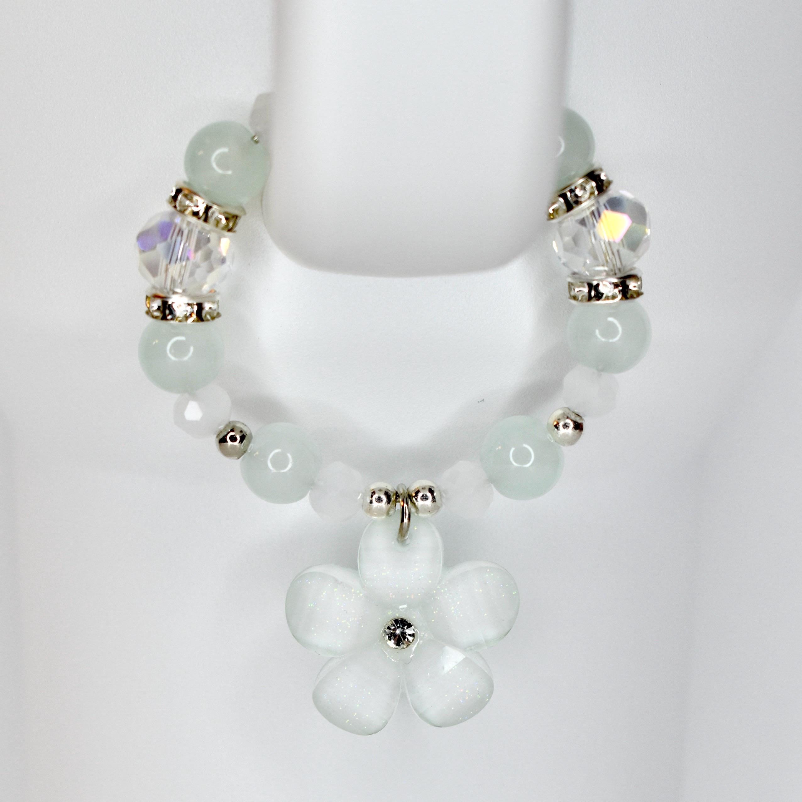 Handmade beaded tumbler handle bracelet featuring a mother-of-pearl flower pendant, crystal beads, pearl accents and rhinestone spacers. Attaches easily with a lobster claw clasp. Available in blush pink, butter yellow and sage green.