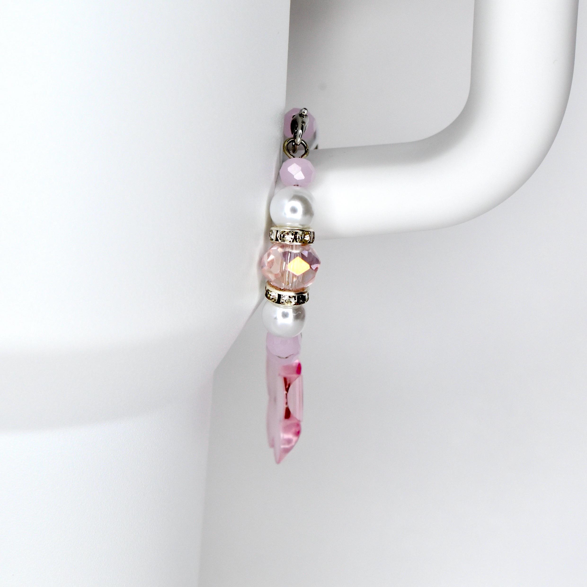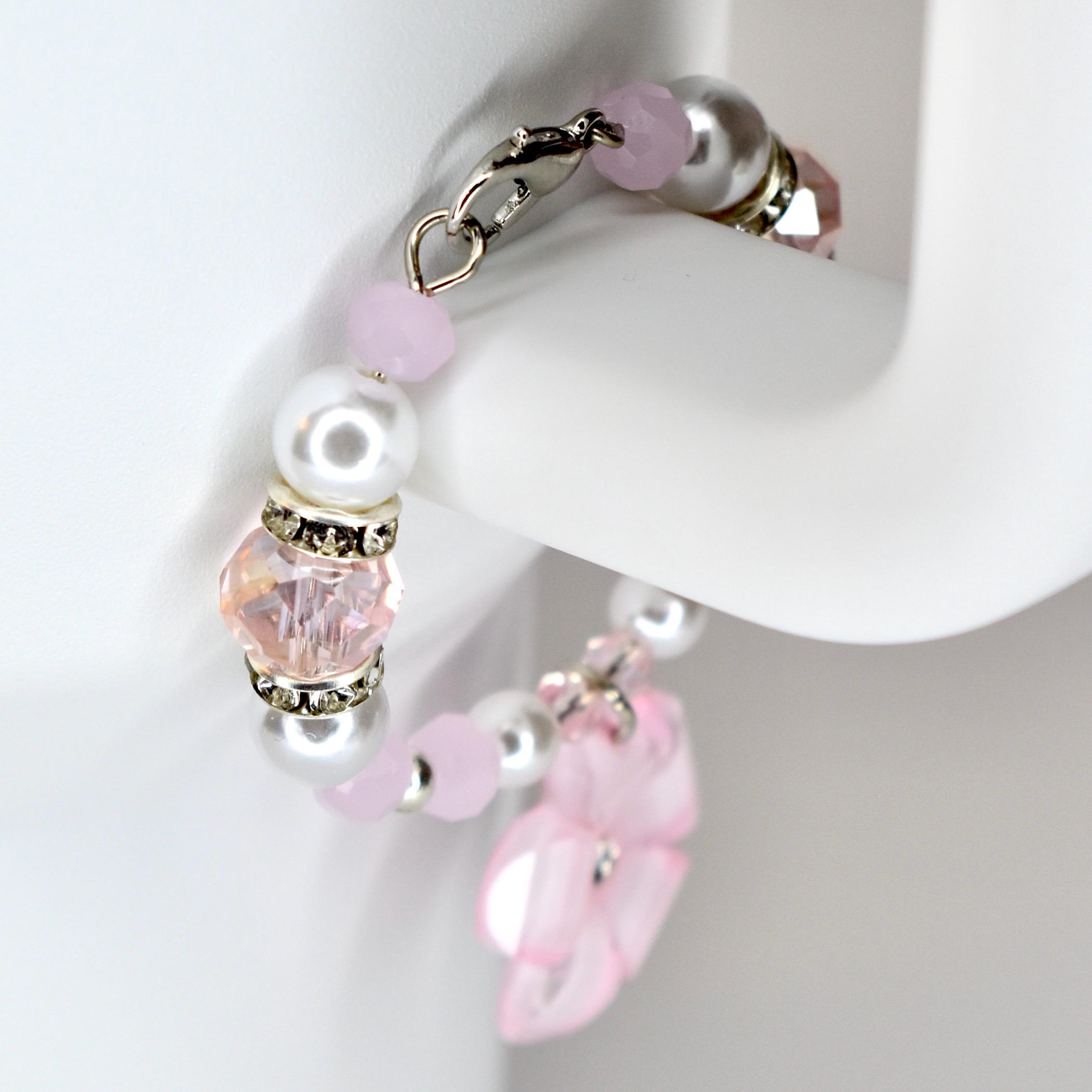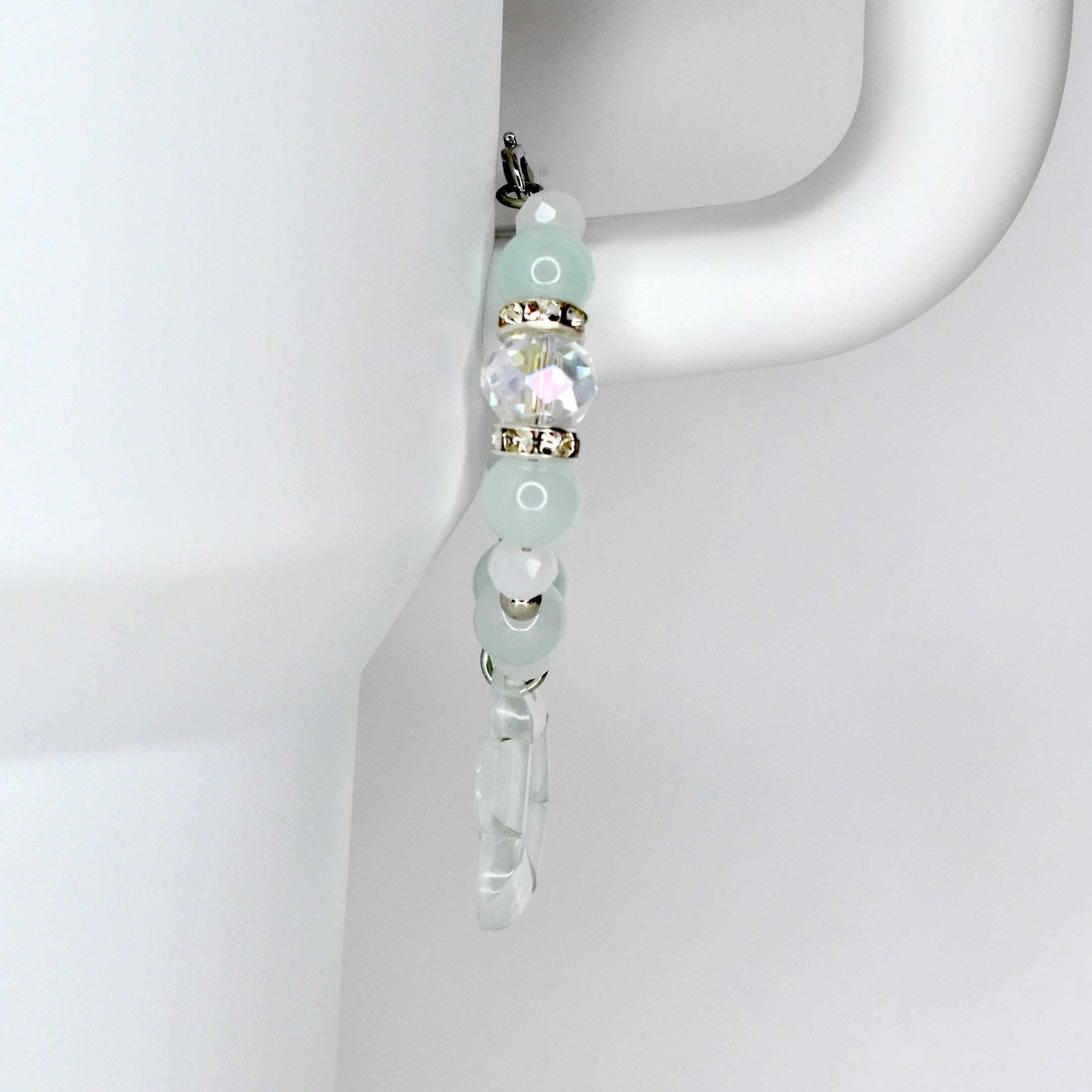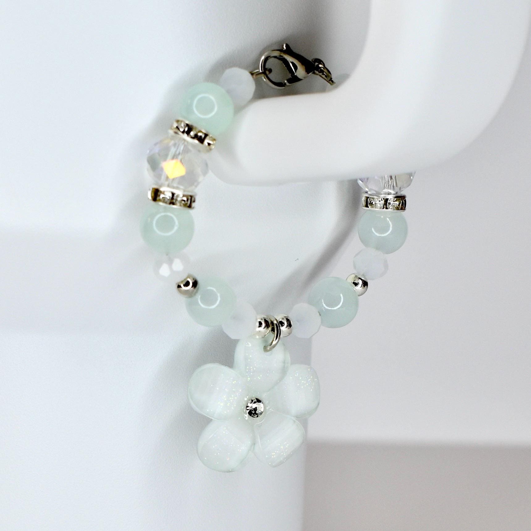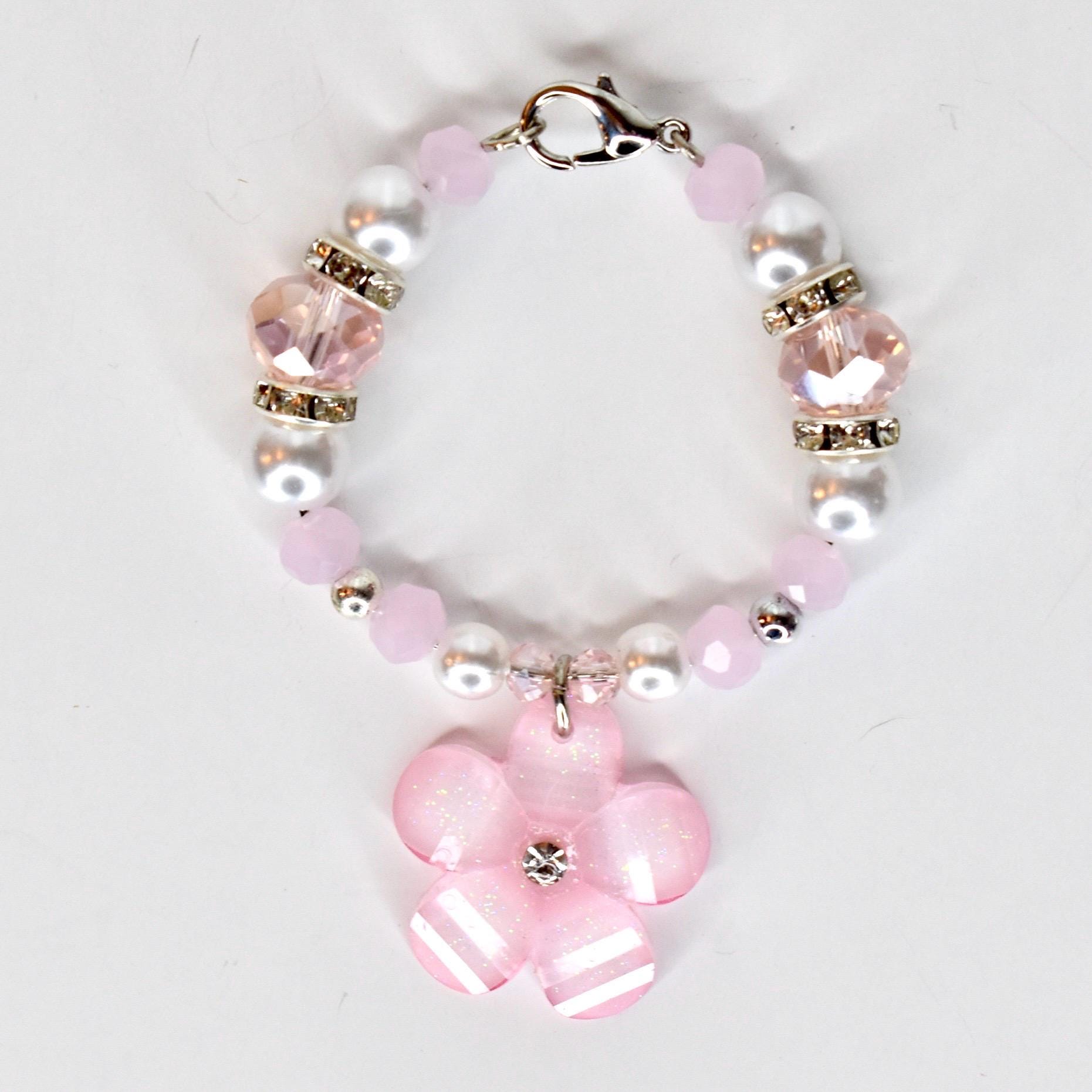 Handmade beaded tumbler handle bracelet featuring a mother-of-pearl flower pendant, crystal beads, pearl accents and rhinestone spacers. Attaches easily with a lobster claw clasp. Available in blush pink, butter yellow and sage green.