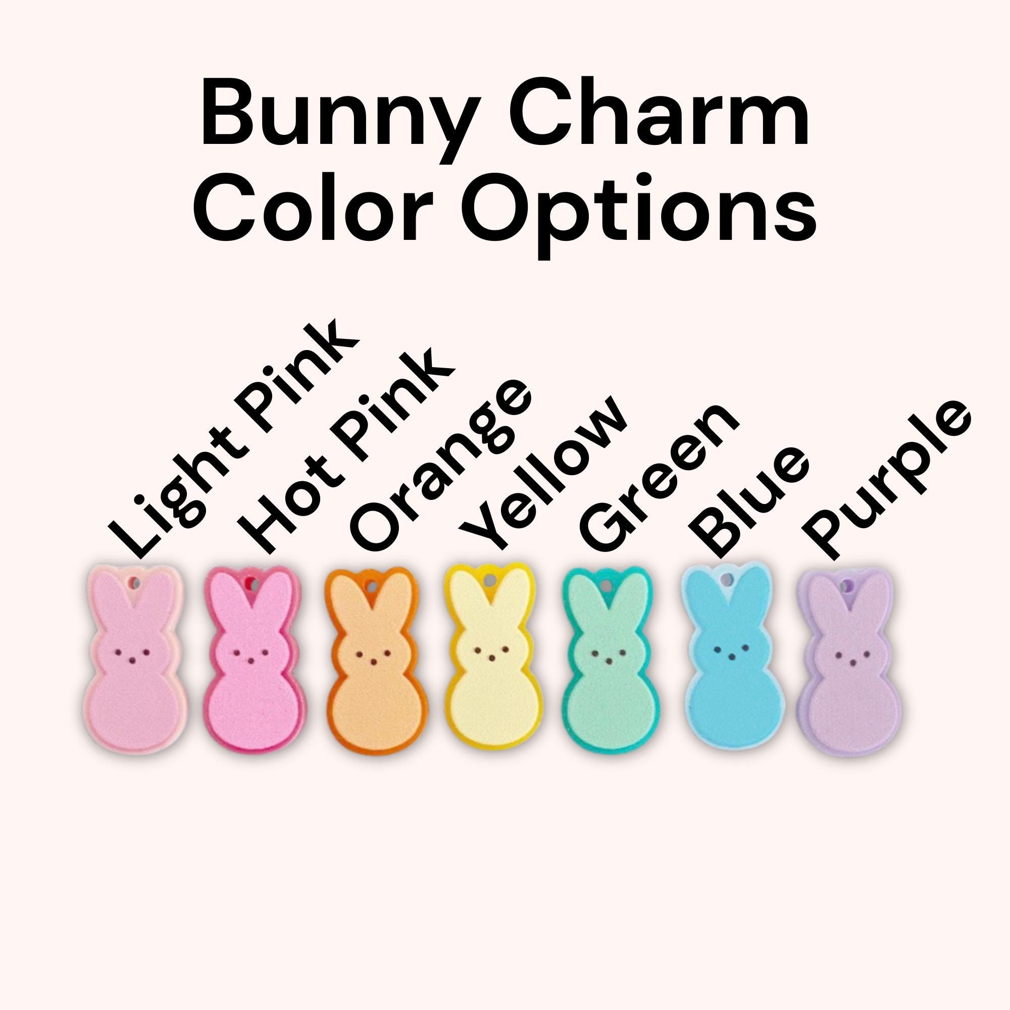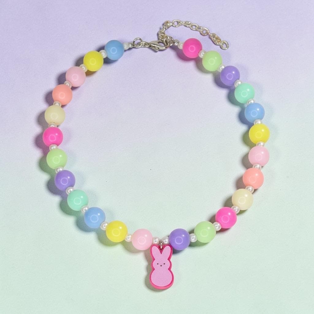 A handmade pastel beaded necklace with a pink PEEPS bunny charm, silver lobster clasp closure and a 2” extender chain for a customizable fit.