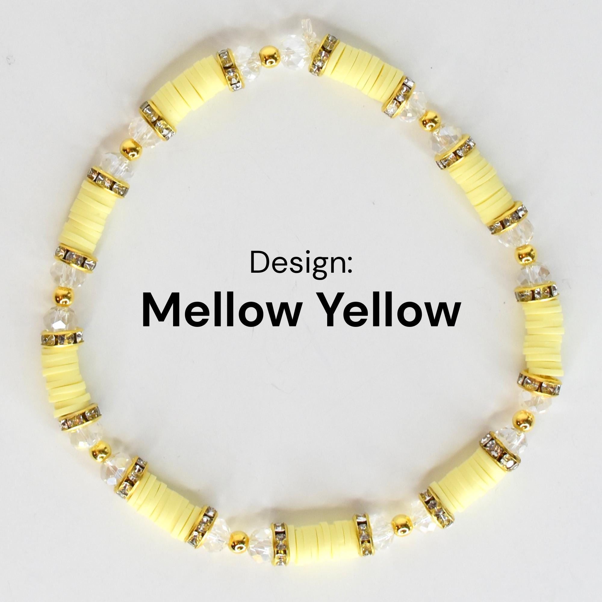 • Soft yellow polymer clay heishi disc bracelet with rhinestone rondelle accents