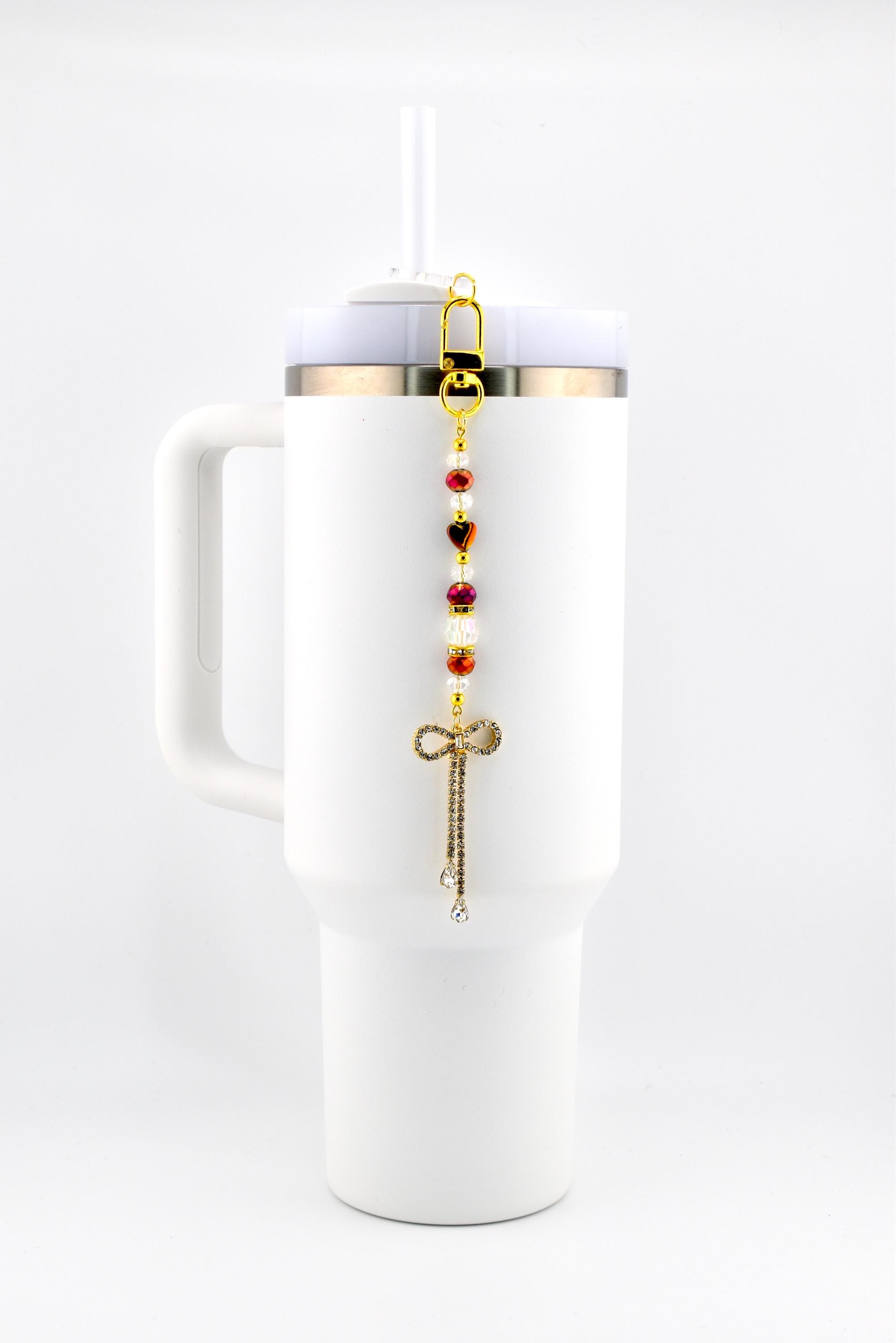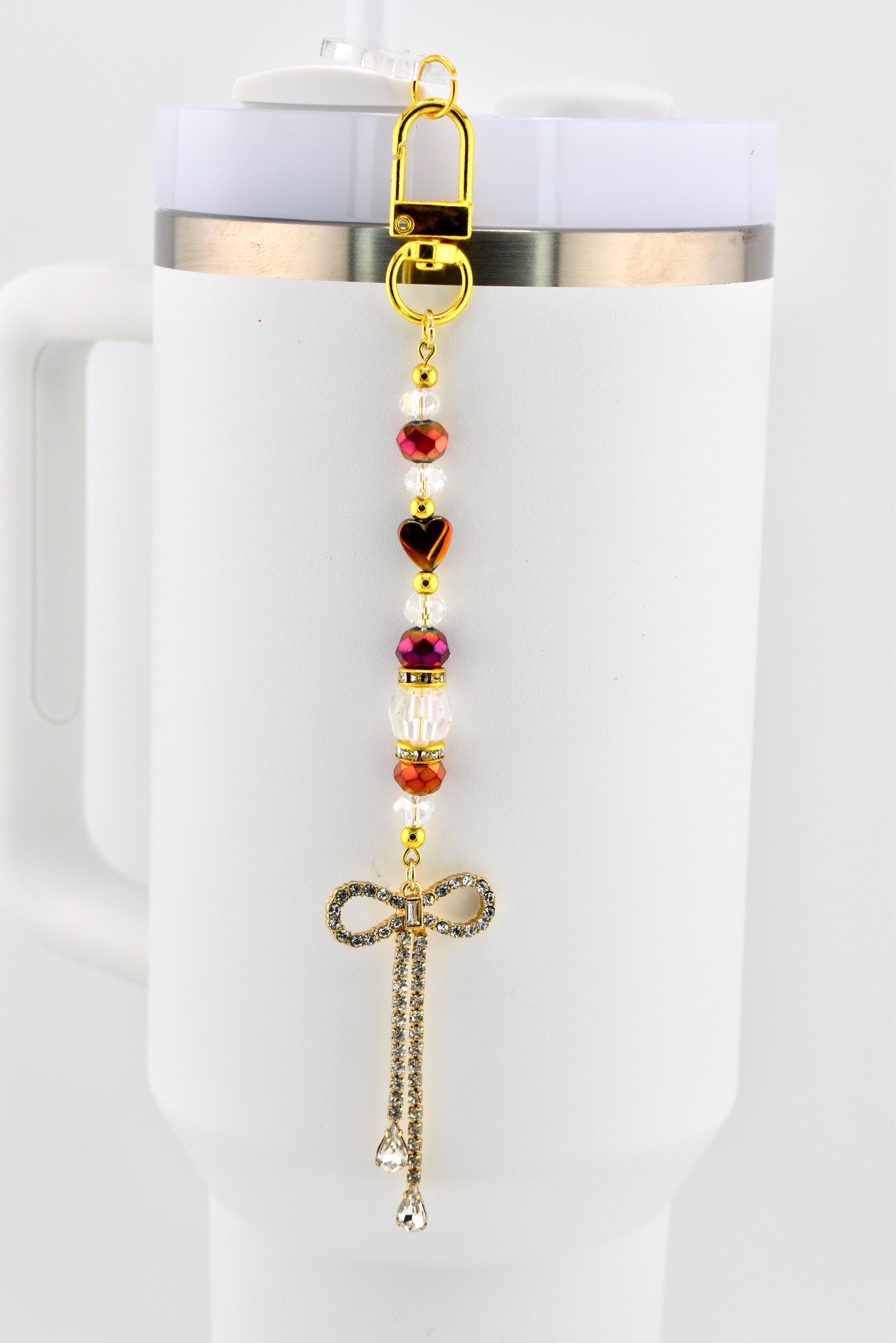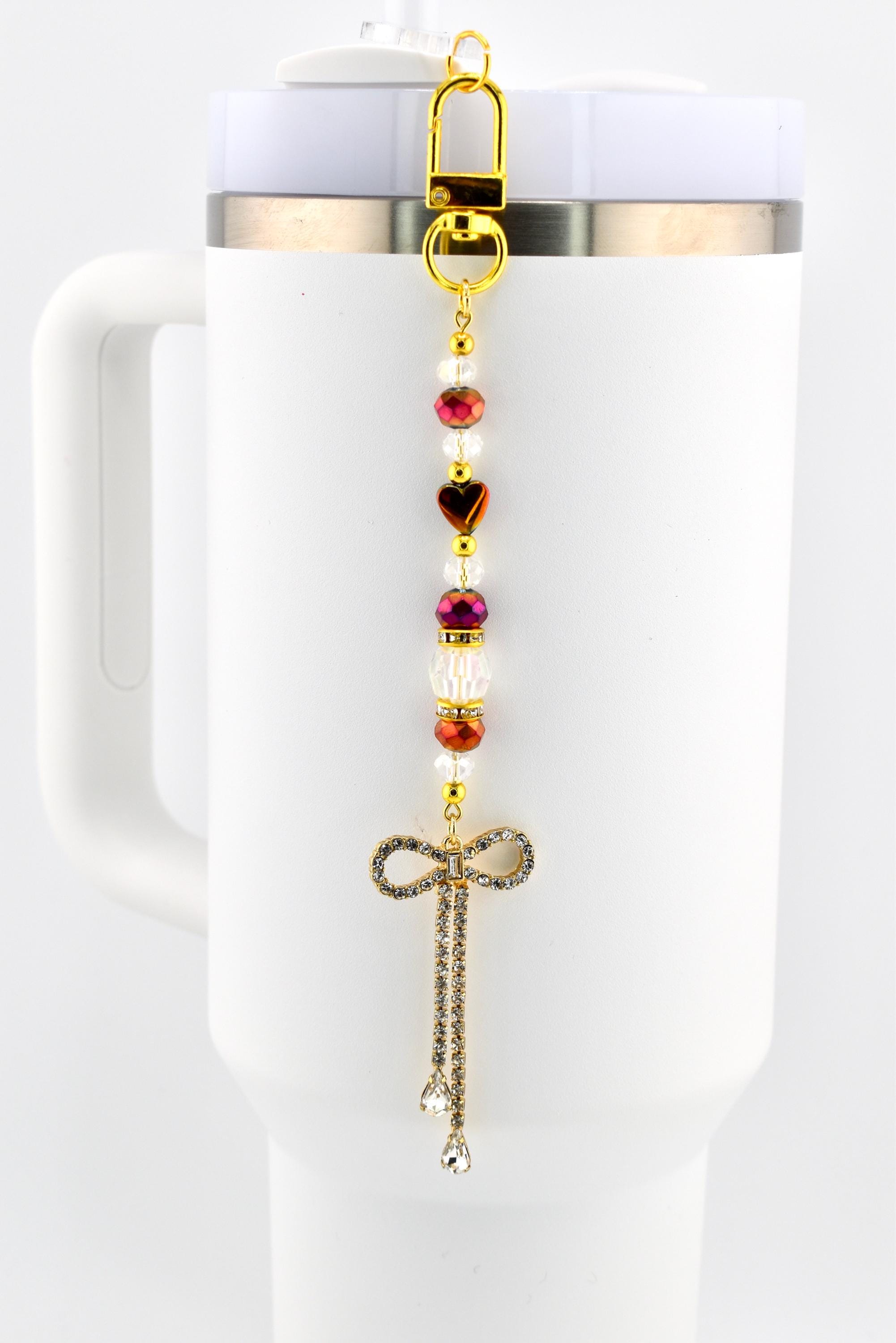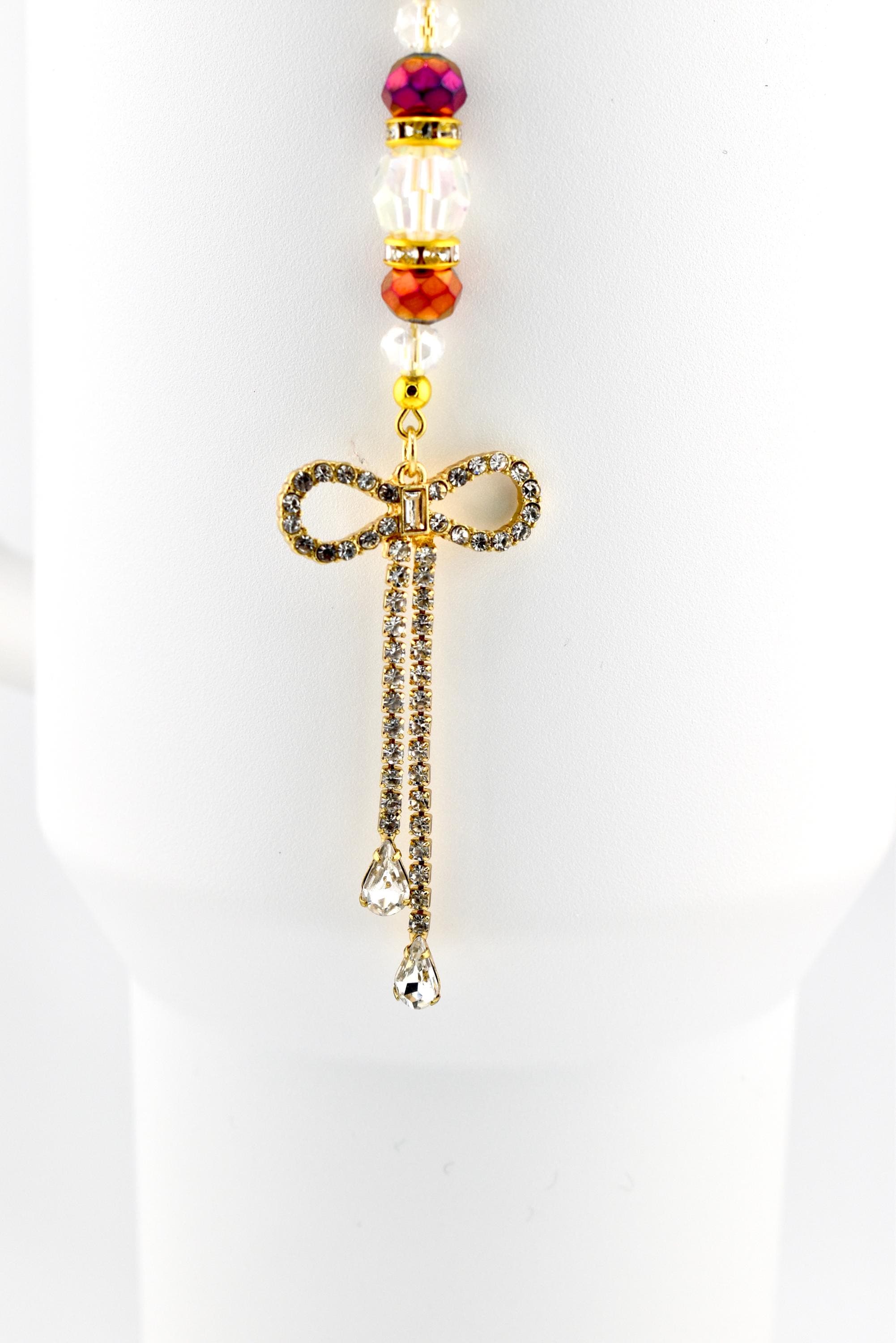 Introducing the Scarlet Bow — a handmade beaded tumbler charm that clips right onto your straw topper and instantly elevates your everyday carry. Deep crimson crystals, a red enamel heart bead, luminous clear crackle glass and gold rhinestone rondelles lead the eye down to a show-stopping pave rhinestone bow pendant with cascading crystal-tipped tassels.