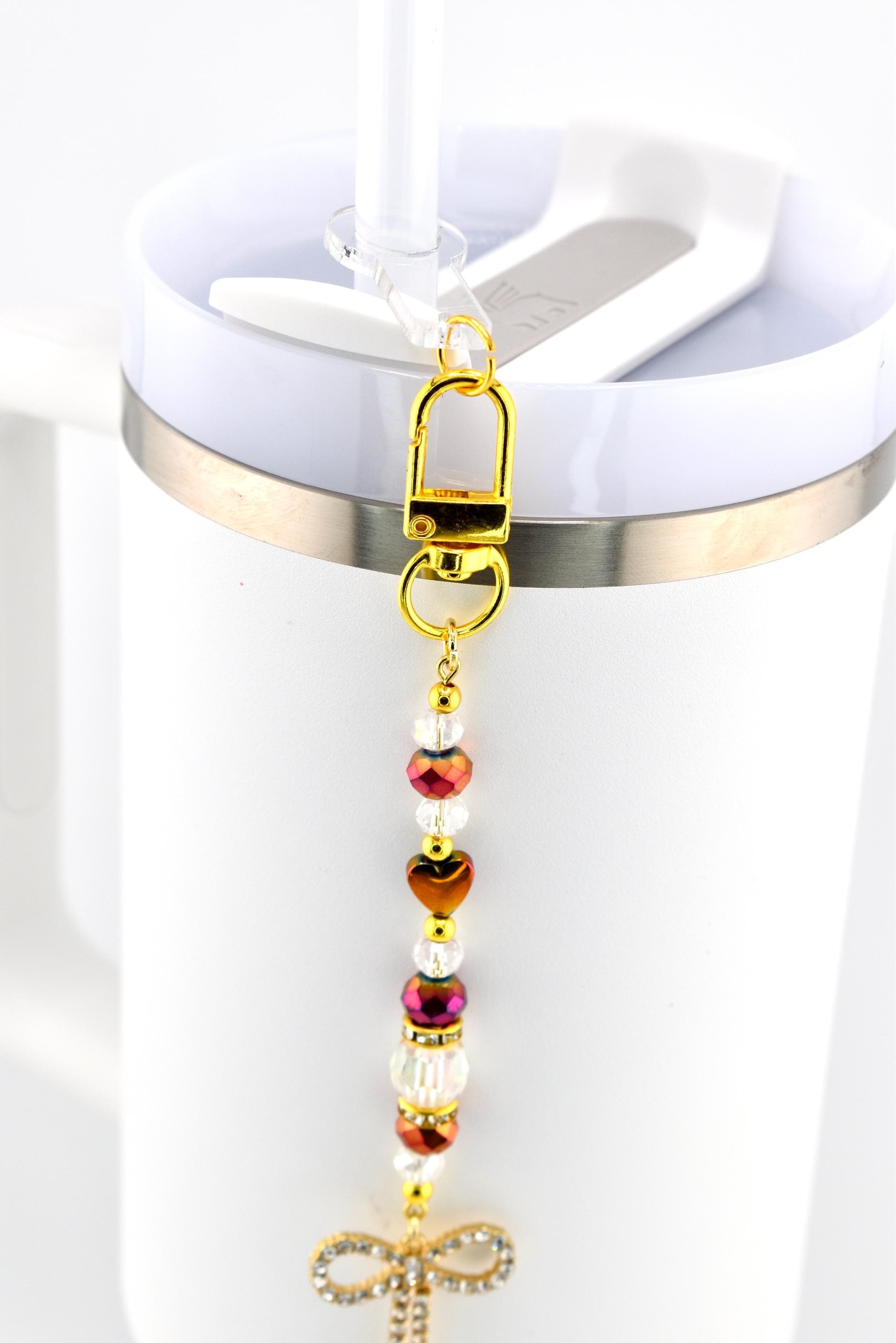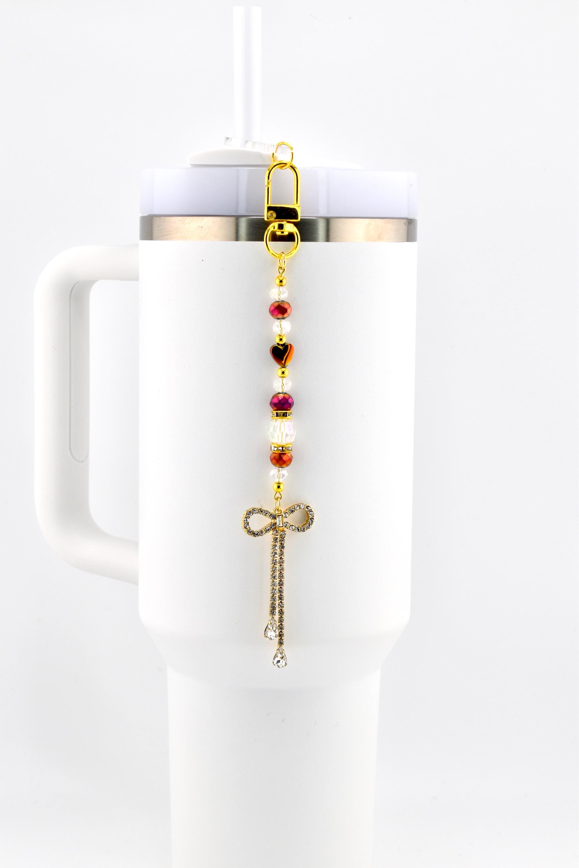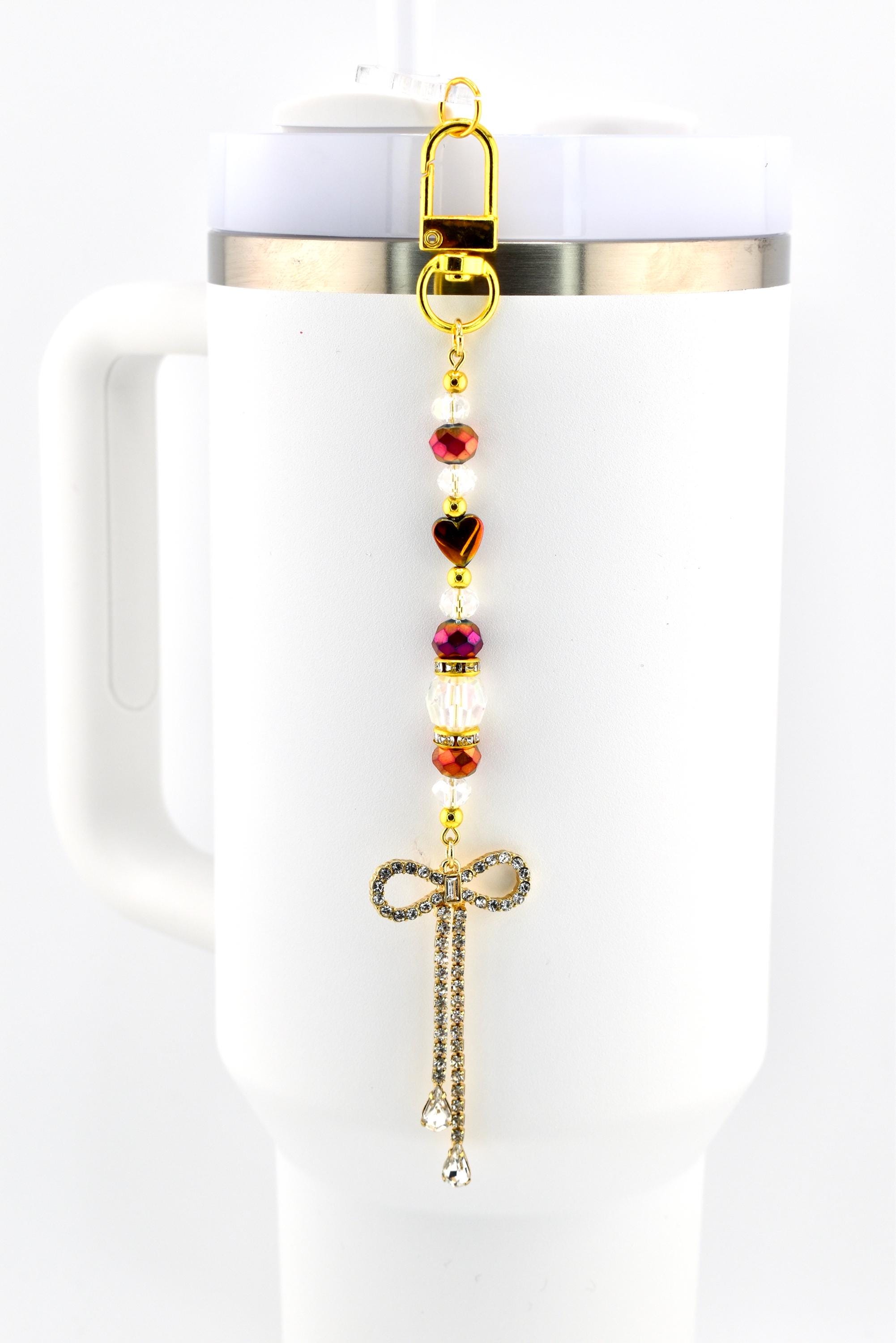 Introducing the Scarlet Bow — a handmade beaded tumbler charm that clips right onto your straw topper and instantly elevates your everyday carry. Deep crimson crystals, a red enamel heart bead, luminous clear crackle glass and gold rhinestone rondelles lead the eye down to a show-stopping pave rhinestone bow pendant with cascading crystal-tipped tassels.