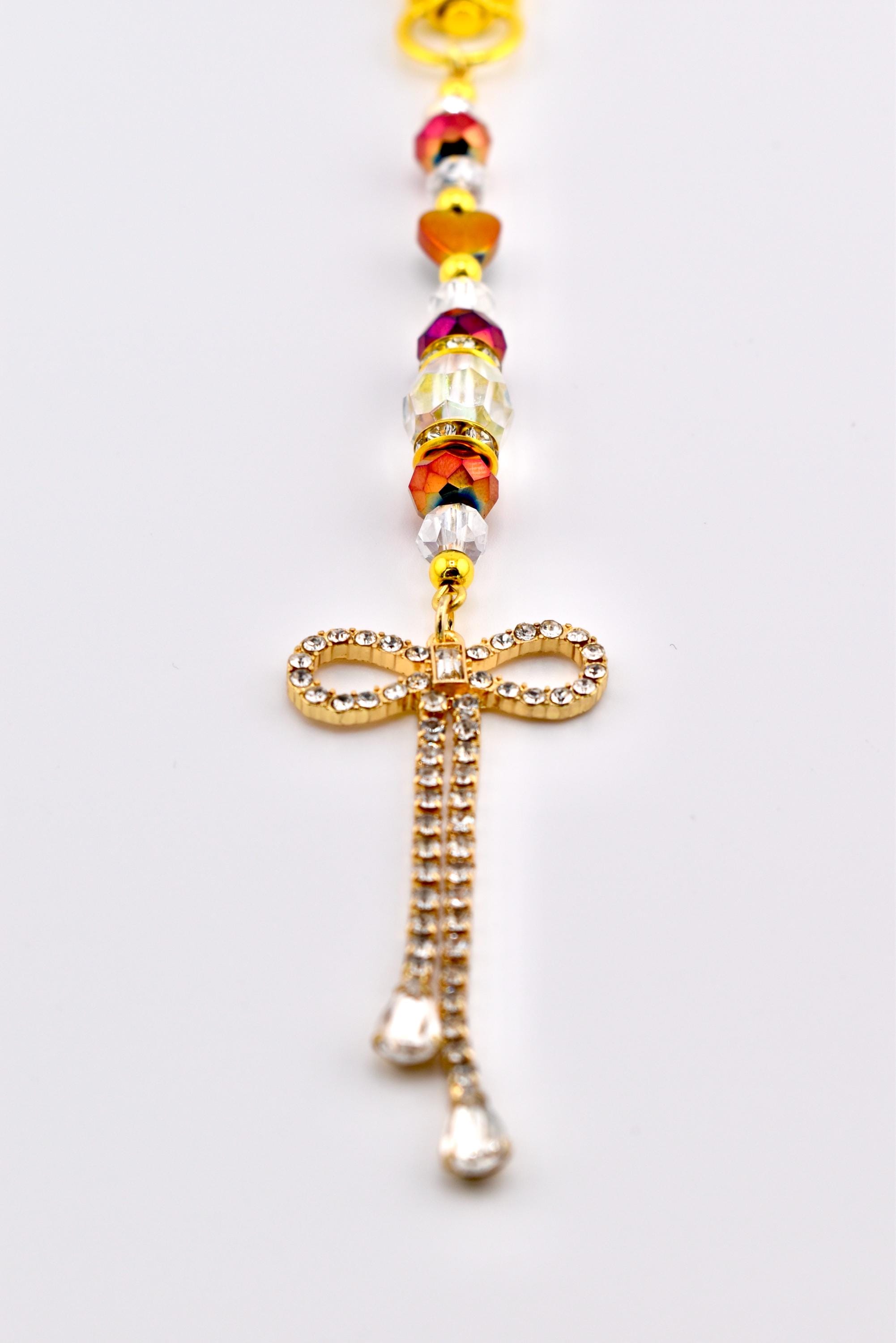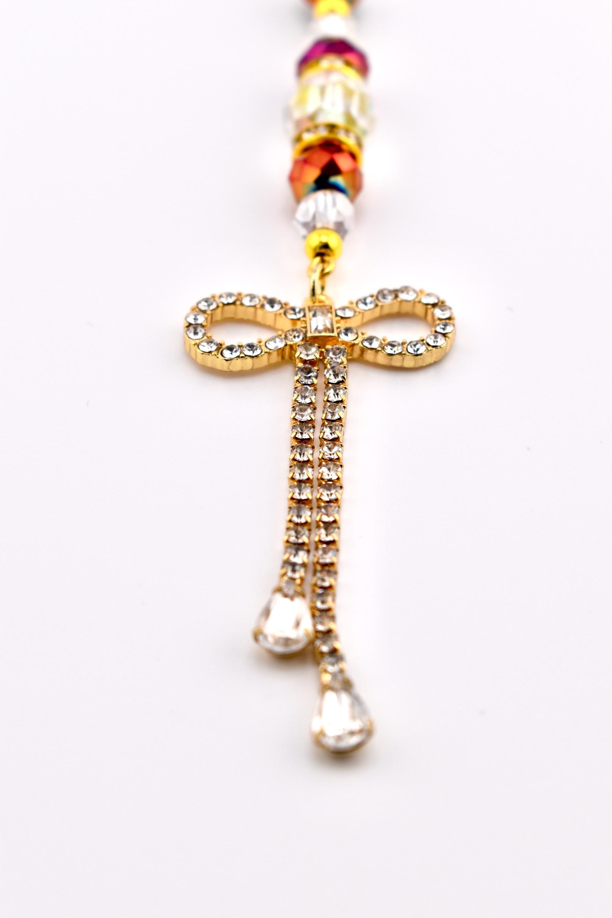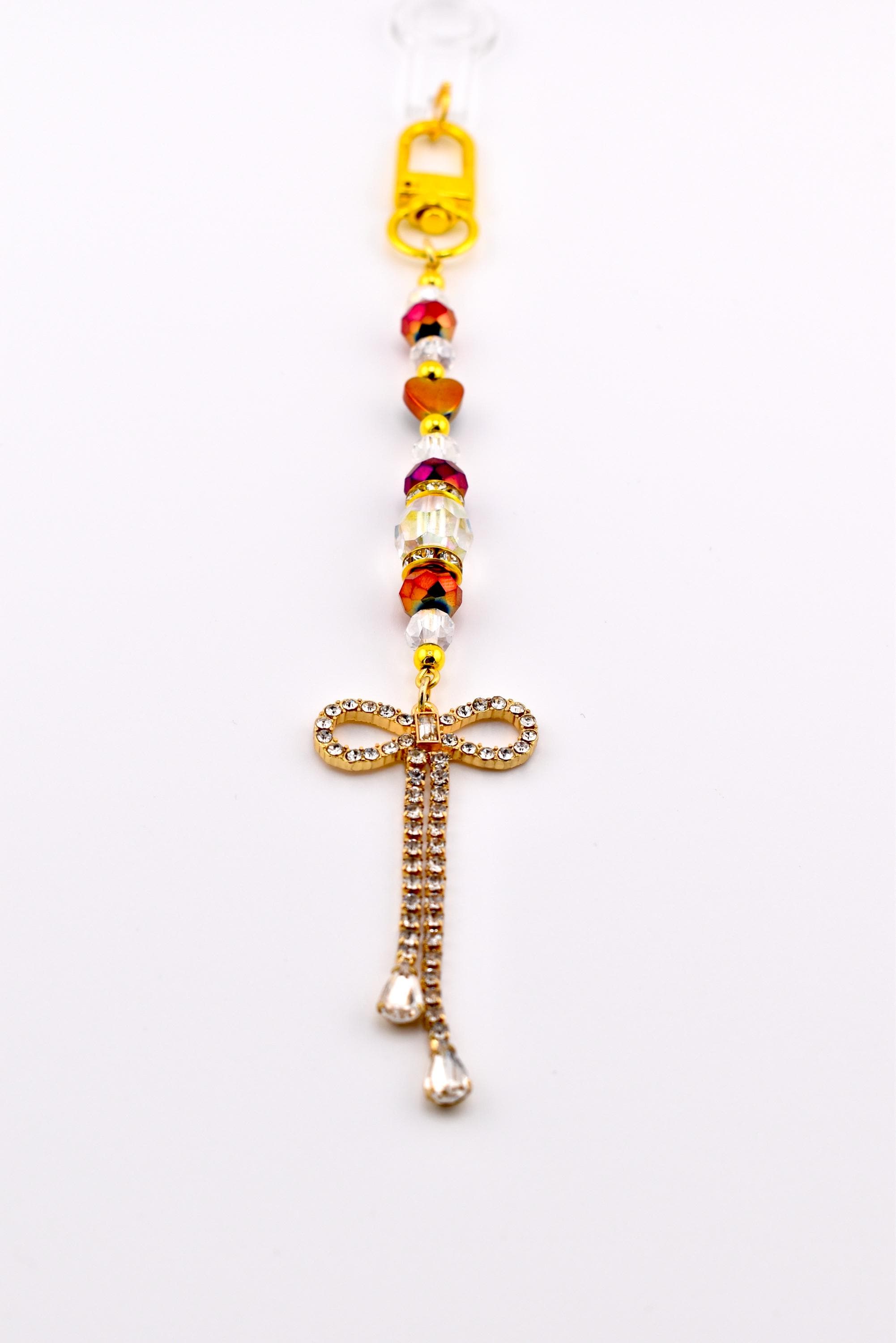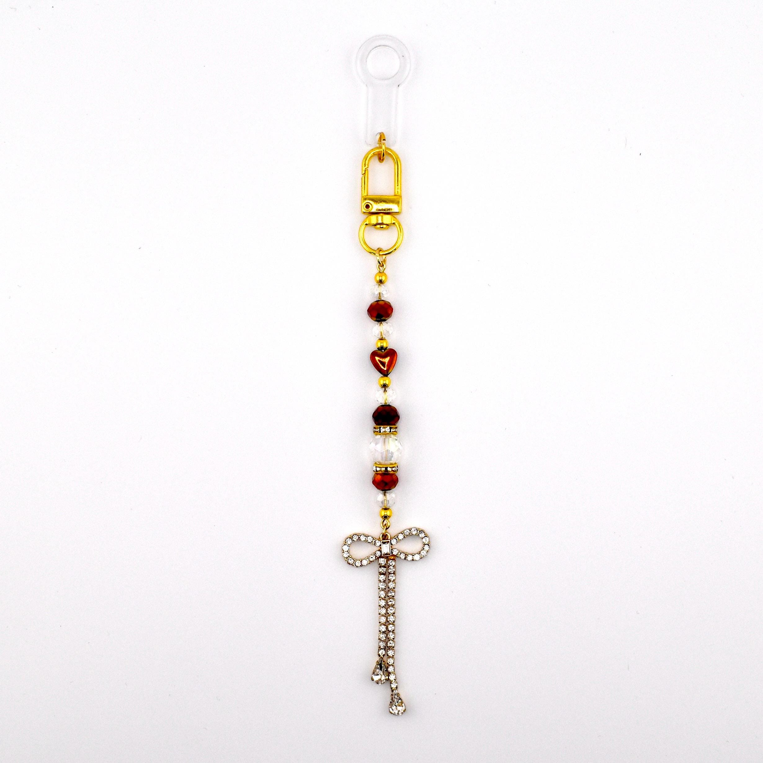 Introducing the Scarlet Bow — a handmade beaded tumbler charm that clips right onto your straw topper and instantly elevates your everyday carry. Deep crimson crystals, a red enamel heart bead, luminous clear crackle glass and gold rhinestone rondelles lead the eye down to a show-stopping pave rhinestone bow pendant with cascading crystal-tipped tassels.