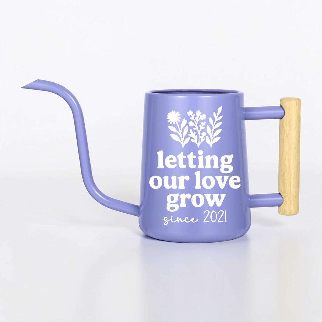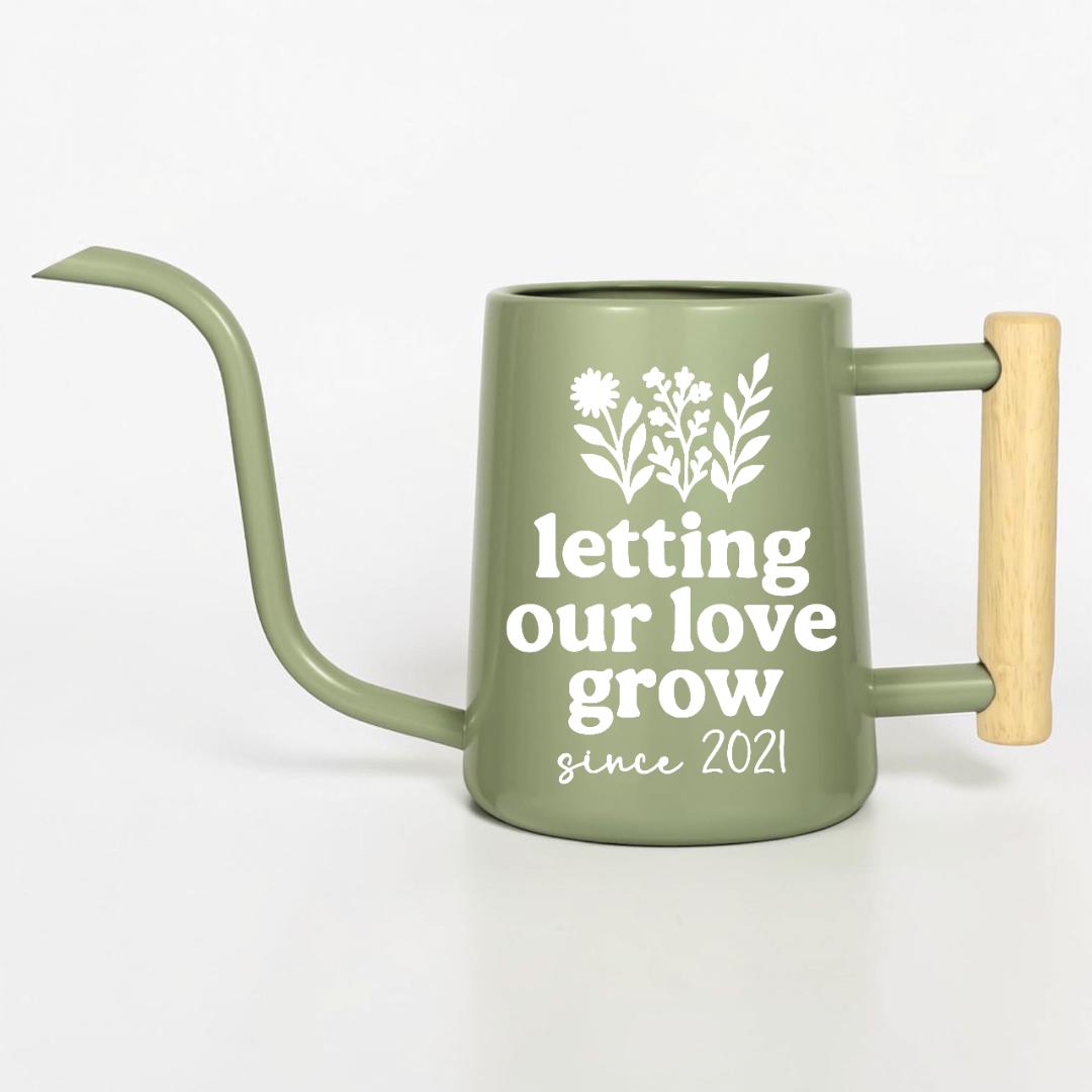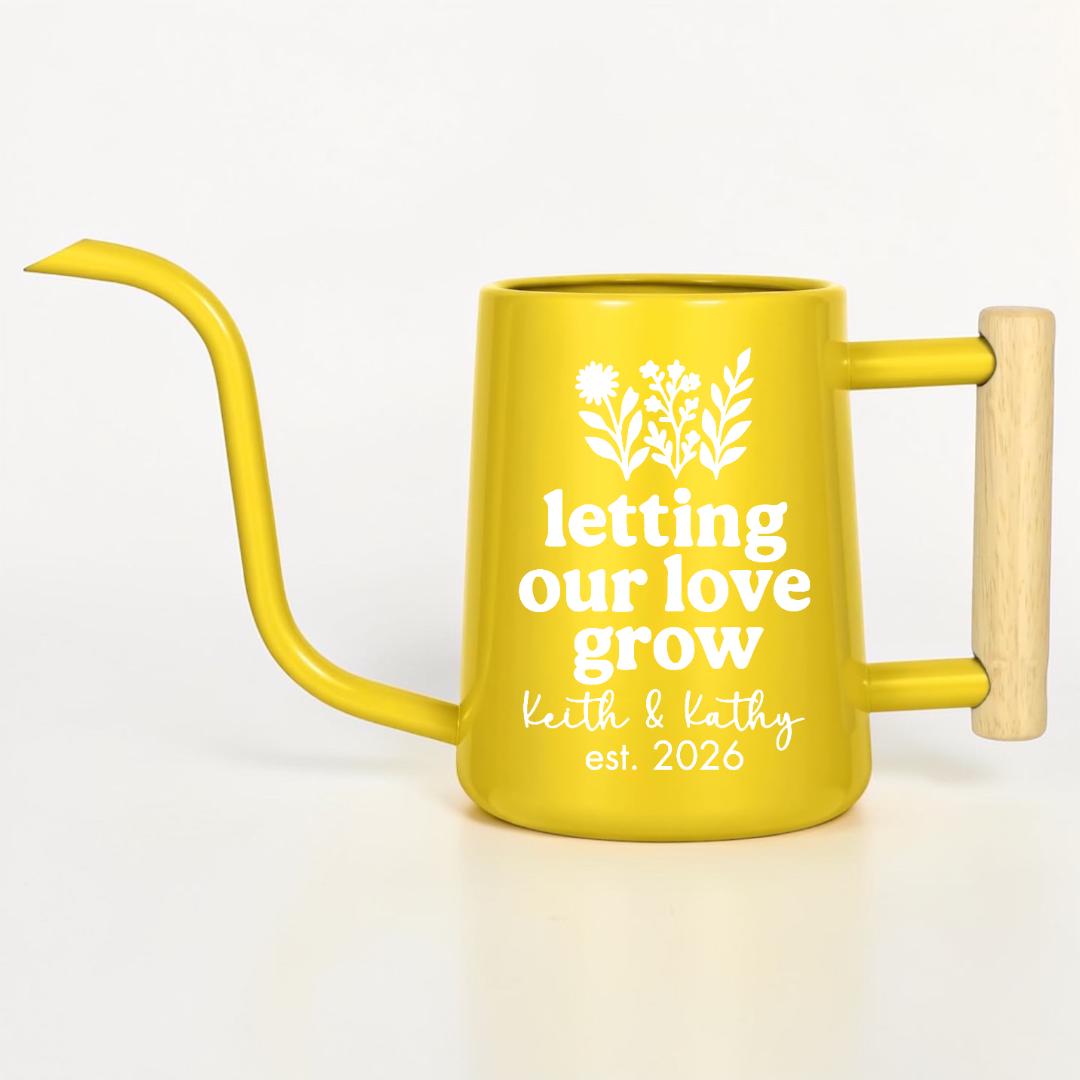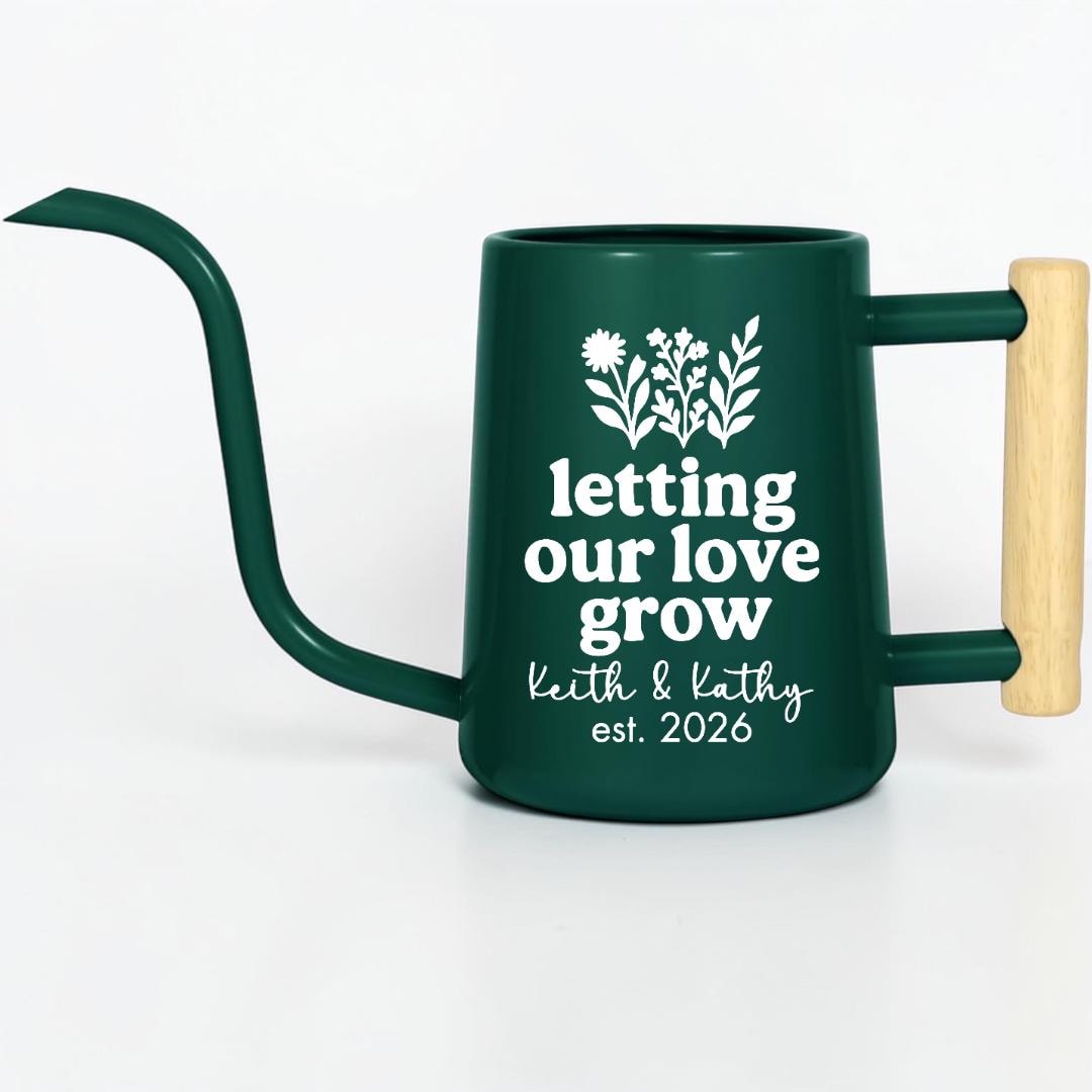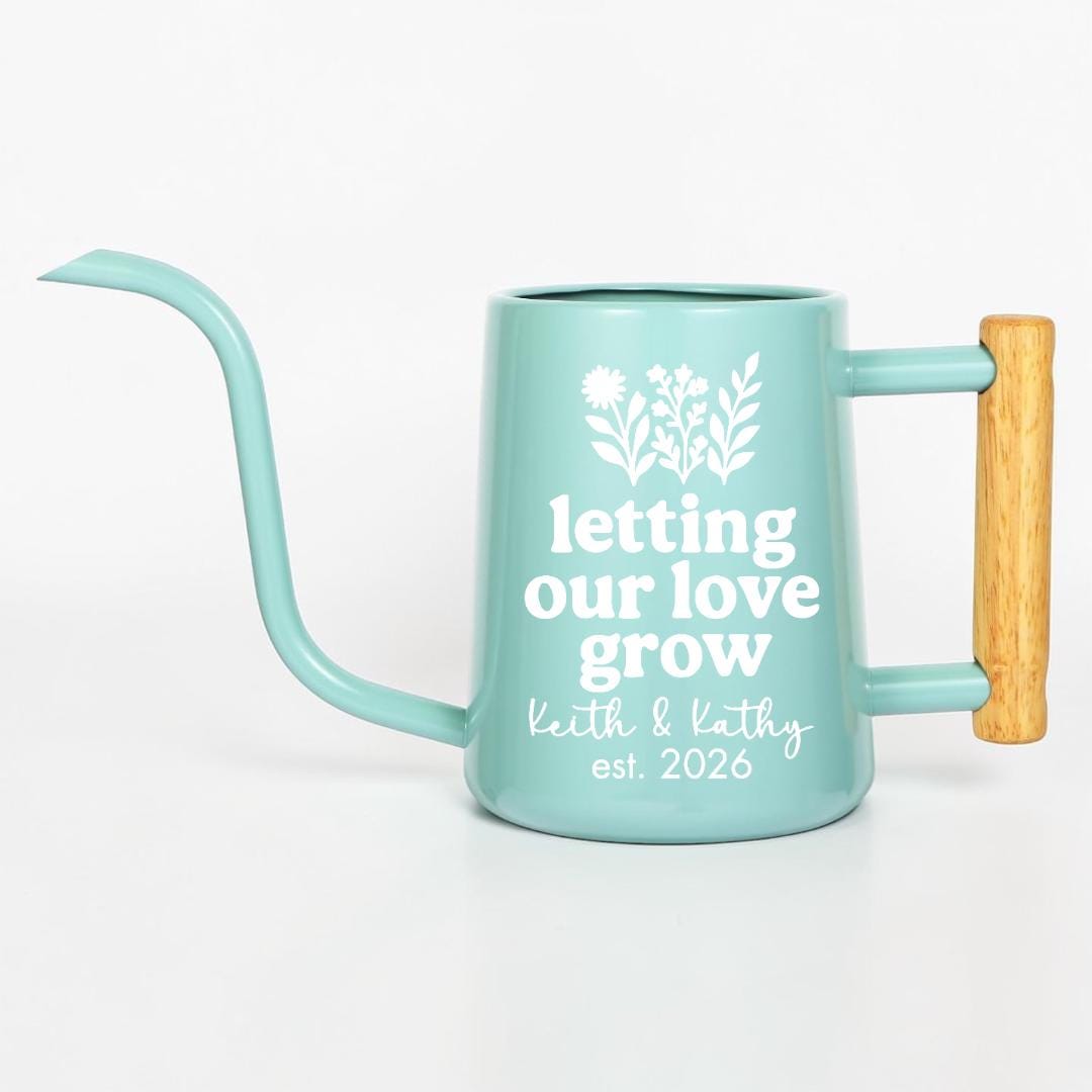 "Letting our love grow" is more than a saying — it's a lifestyle. This beautifully personalized gooseneck watering can is customized with the couple's names and their special date, making it one of those gifts that actually means something. With a bold botanical design, matte finish and warm wood-tone handle, it looks stunning on any windowsill, shelf or kitchen counter.