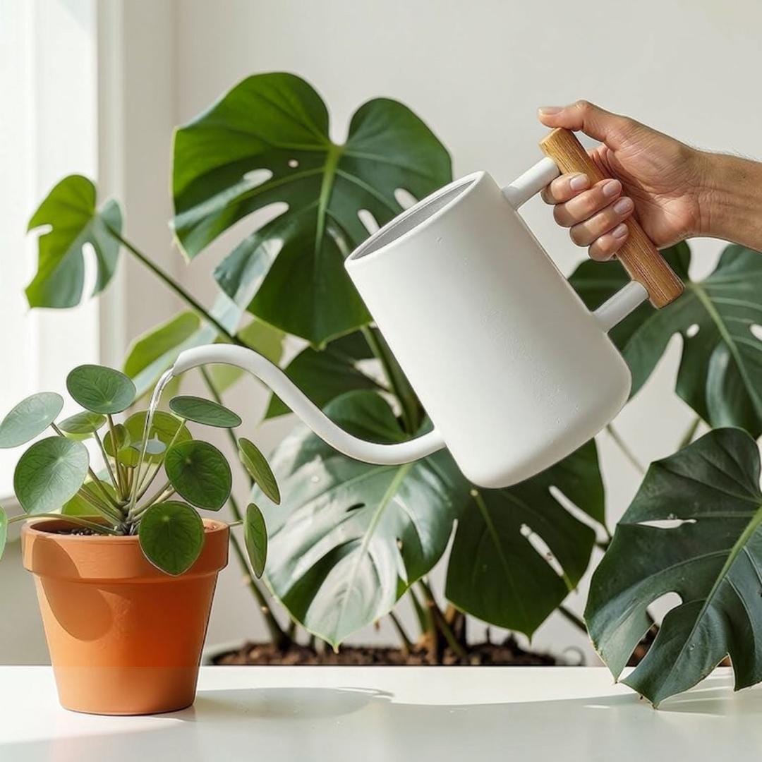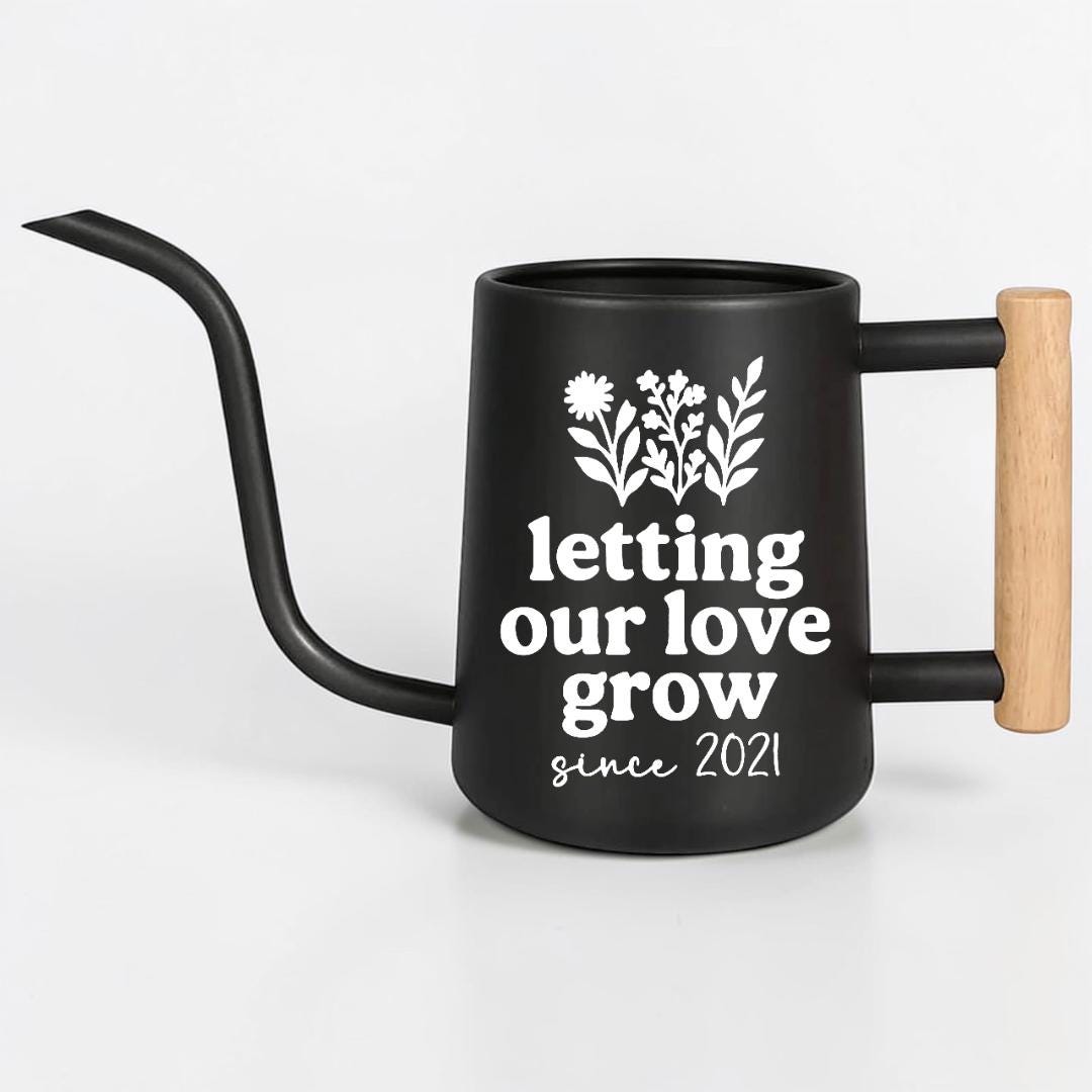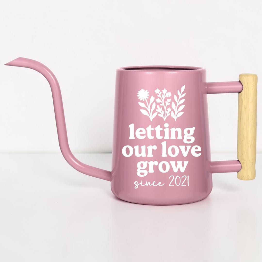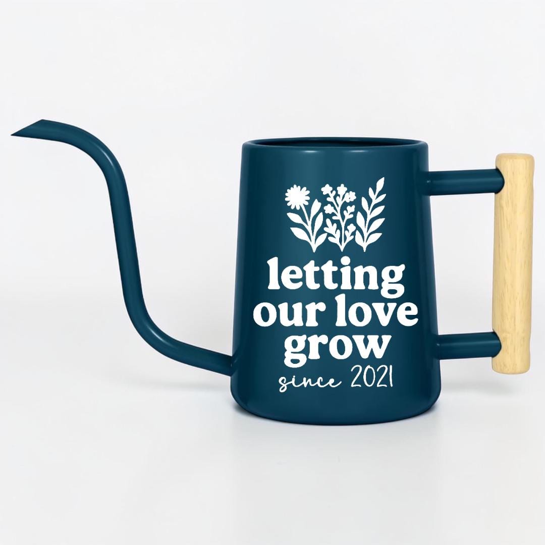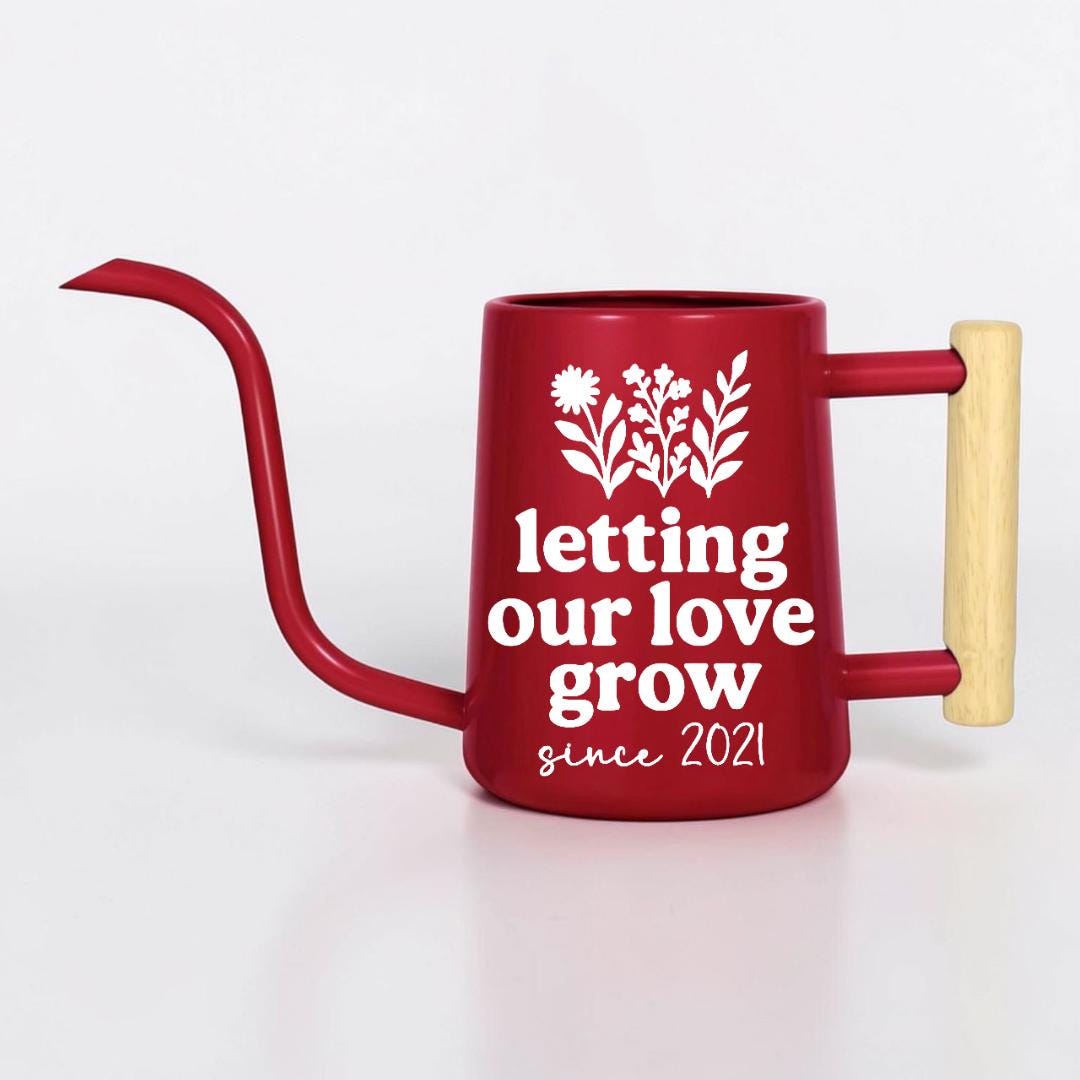 "Letting our love grow" is more than a saying — it's a lifestyle. This beautifully personalized gooseneck watering can is customized with the couple's names and their special date, making it one of those gifts that actually means something. With a bold botanical design, matte finish and warm wood-tone handle, it looks stunning on any windowsill, shelf or kitchen counter.