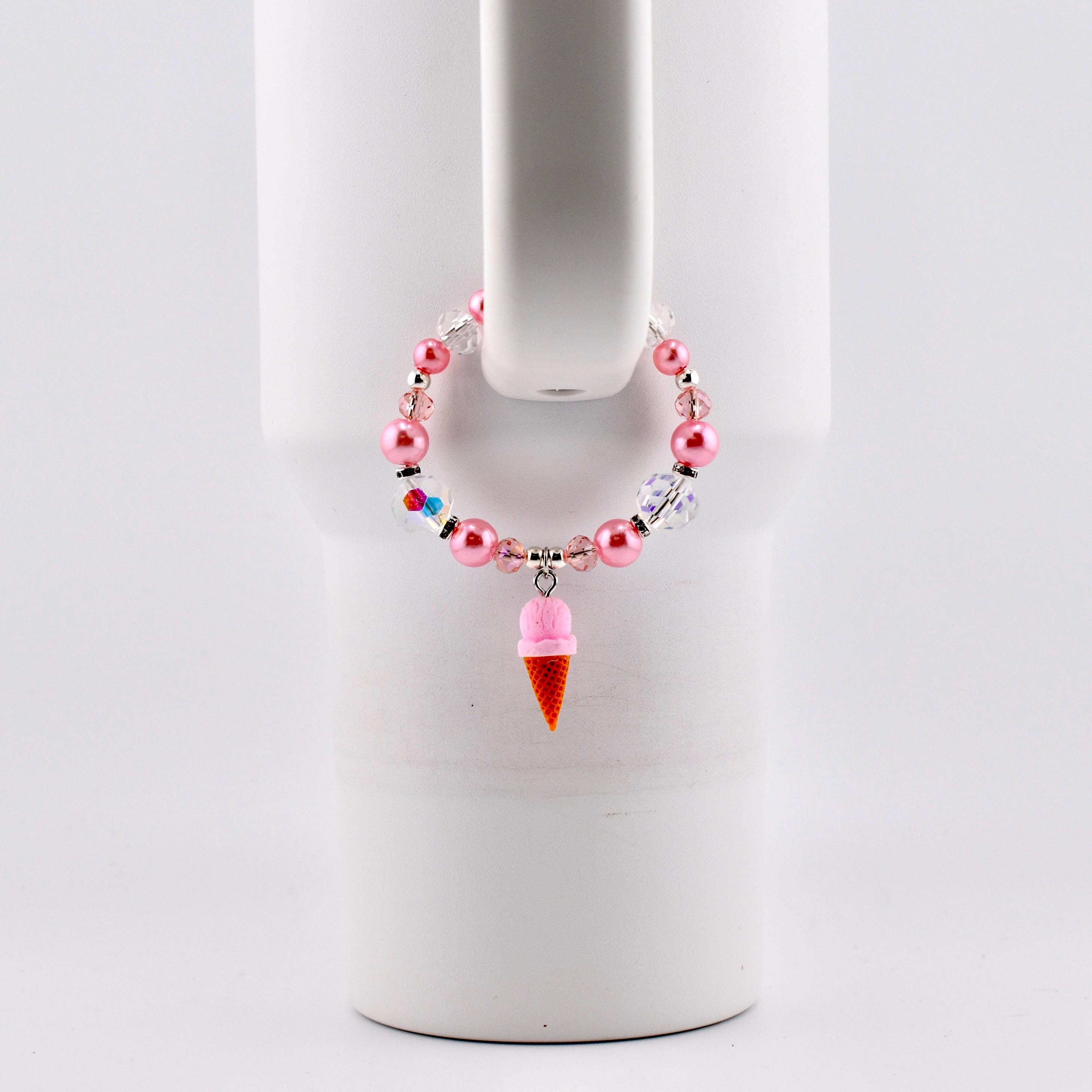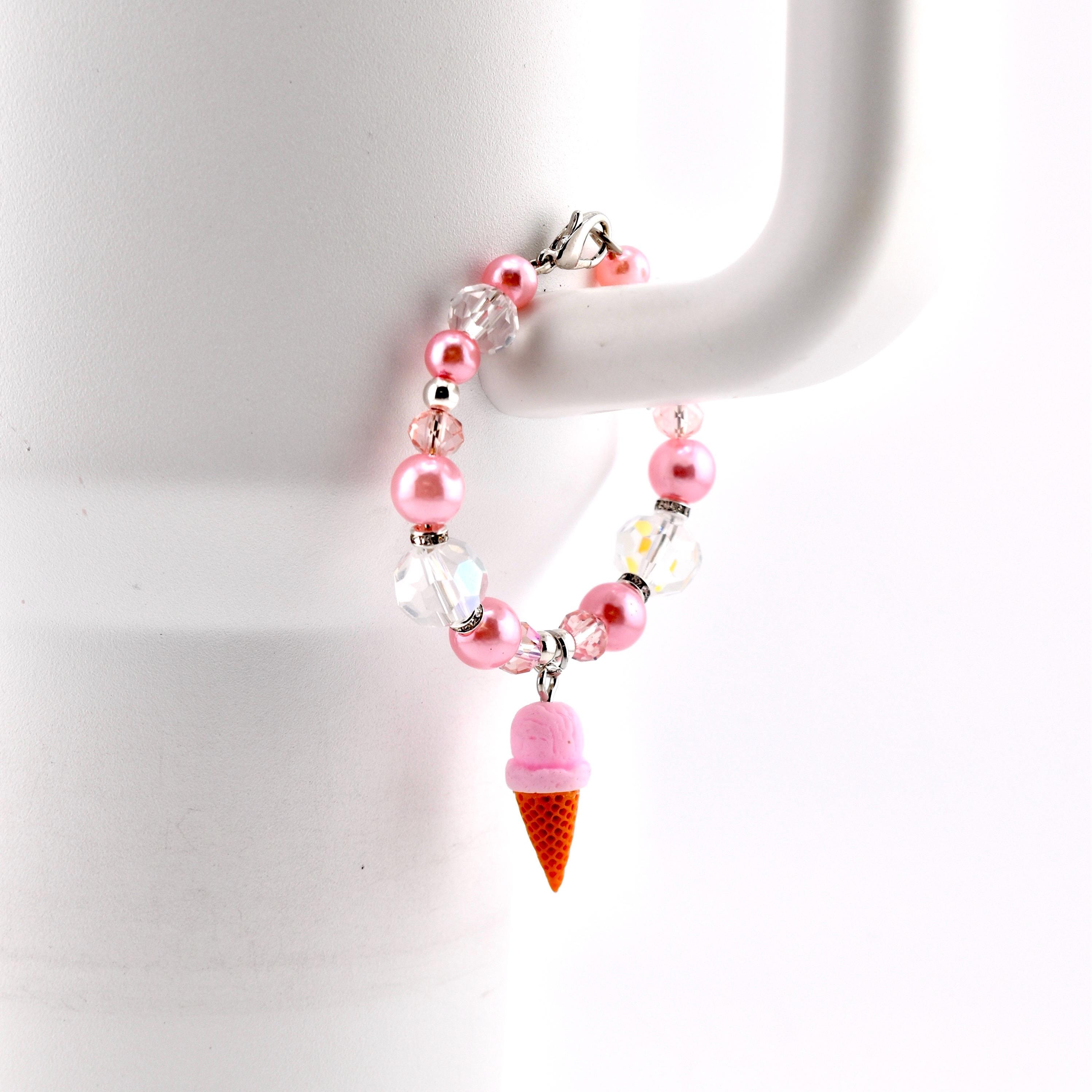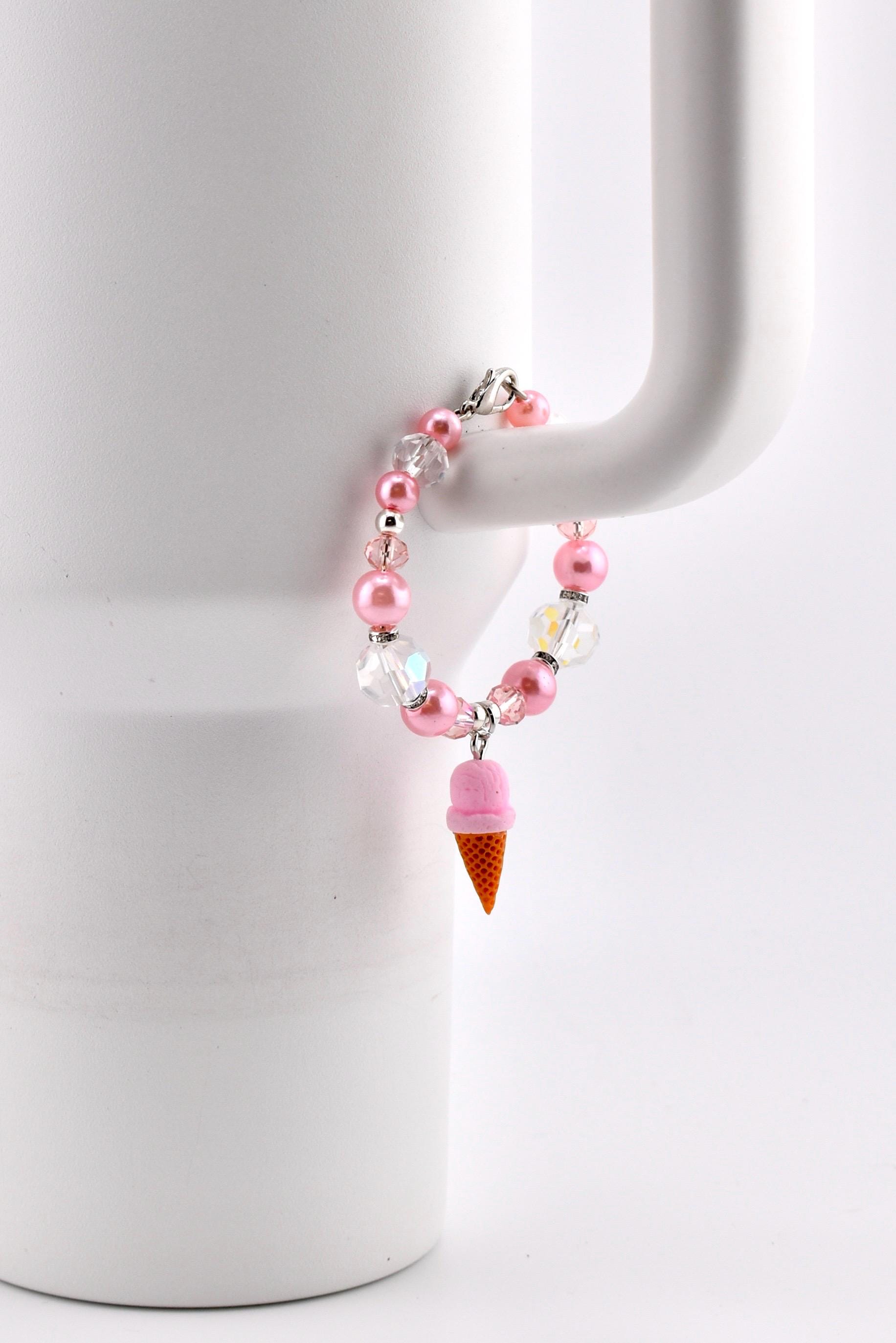 This handmade tumbler handle bracelet is the sweetest thing you’ll put on your cup all summer. A dreamy strawberry ice cream cone charm dangles from a strand of soft pink pearl beads, iridescent AB crystal beads and blush faceted glass beads, all accented with silver rhinestone rondelle spacers and a silver lobster clasp. It’s cute, it’s sparkly and it absolutely gives main character energy.