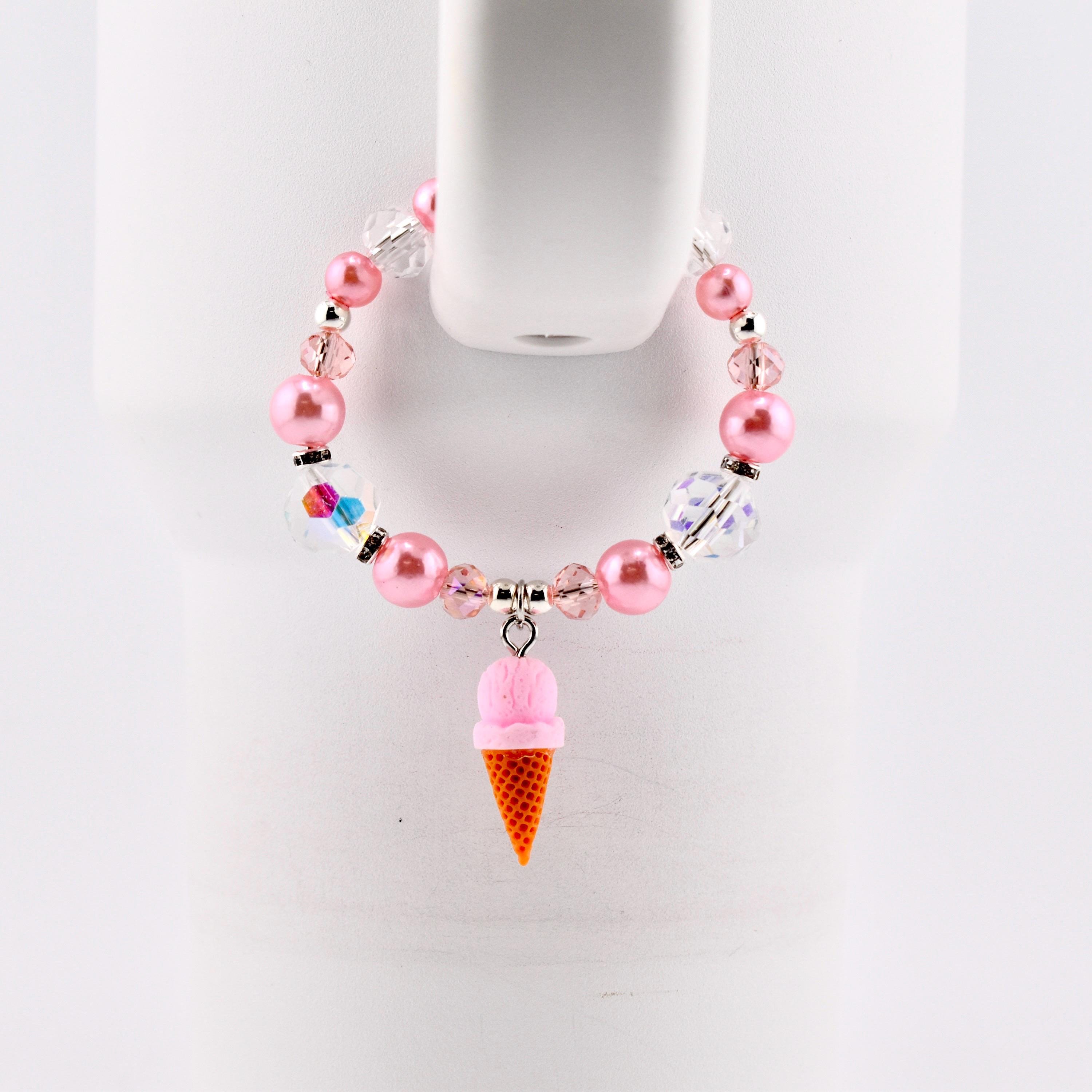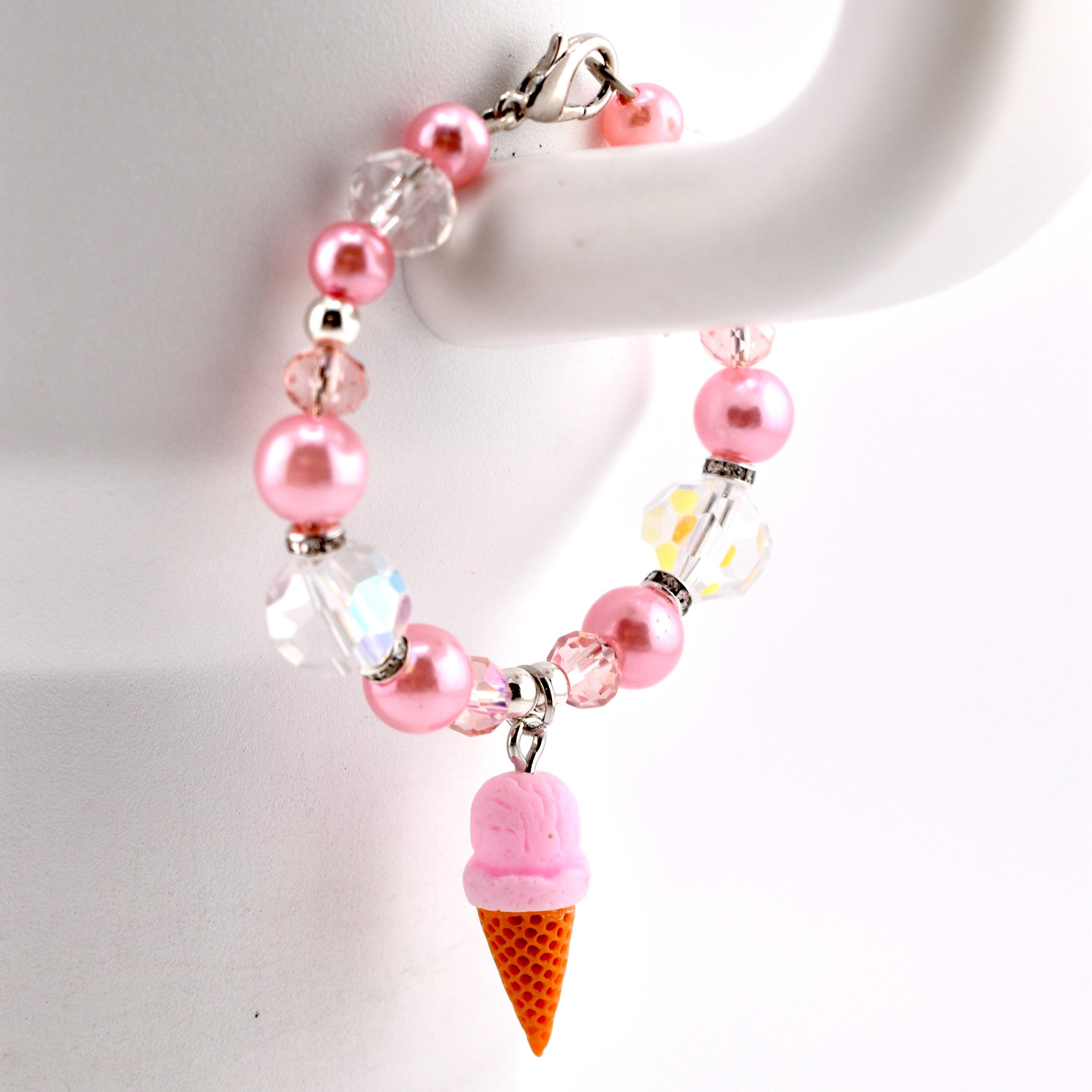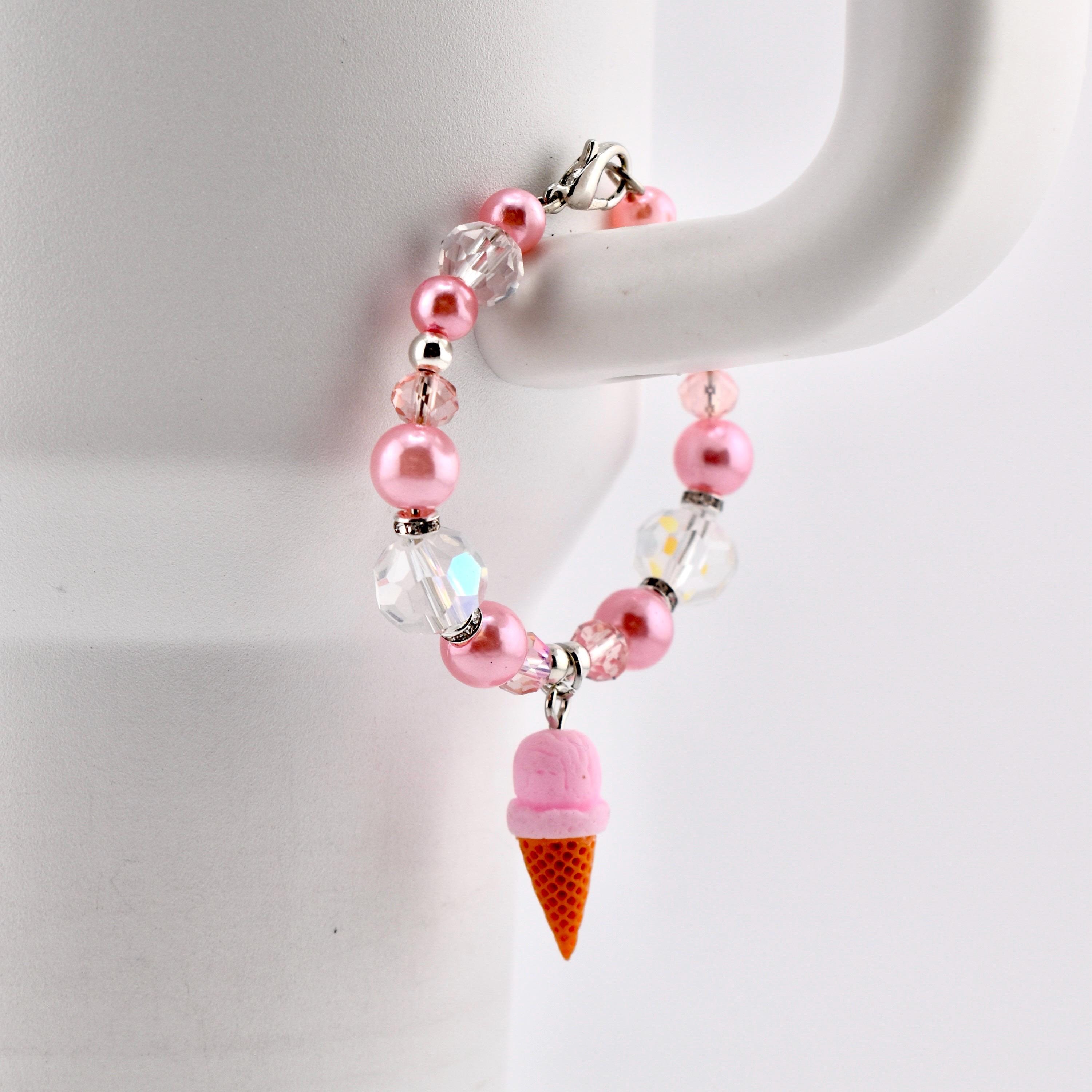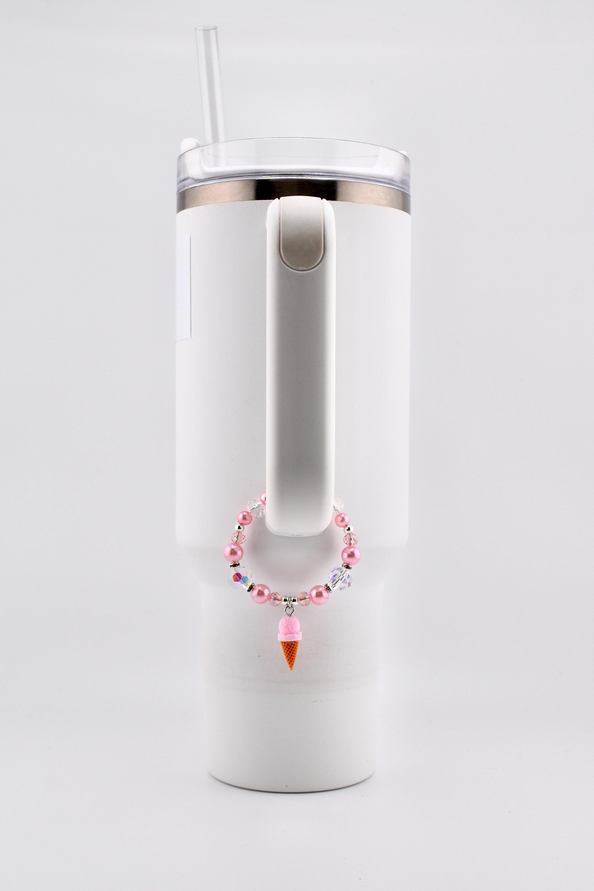 This handmade tumbler handle bracelet is the sweetest thing you’ll put on your cup all summer. A dreamy strawberry ice cream cone charm dangles from a strand of soft pink pearl beads, iridescent AB crystal beads and blush faceted glass beads, all accented with silver rhinestone rondelle spacers and a silver lobster clasp. It’s cute, it’s sparkly and it absolutely gives main character energy.
