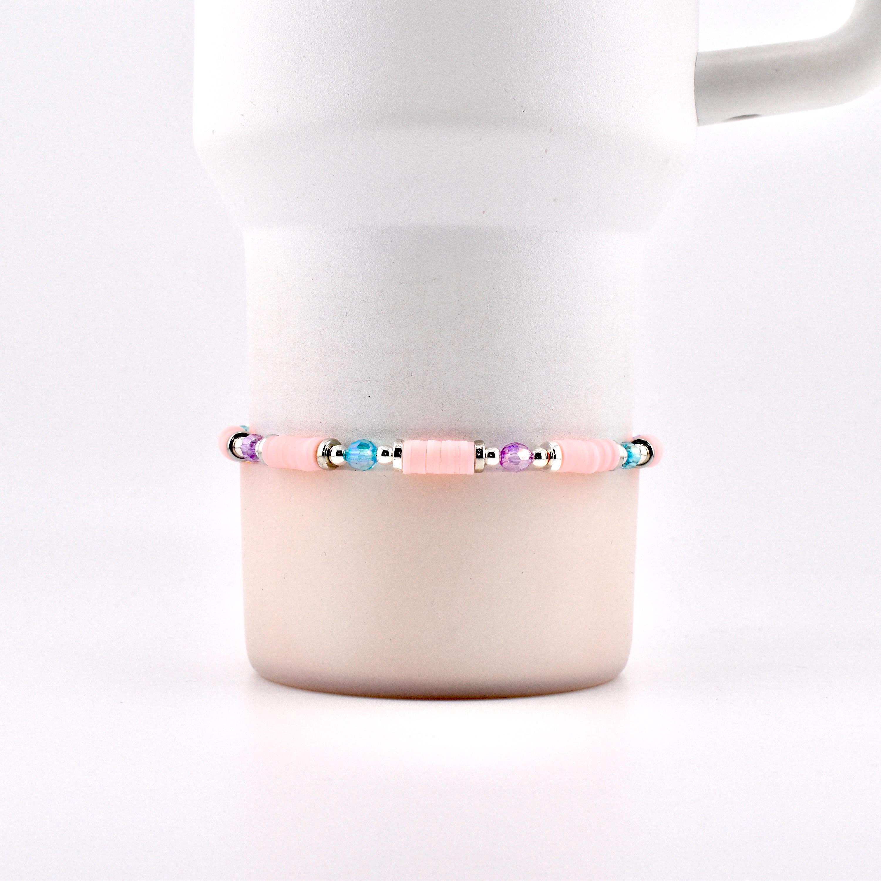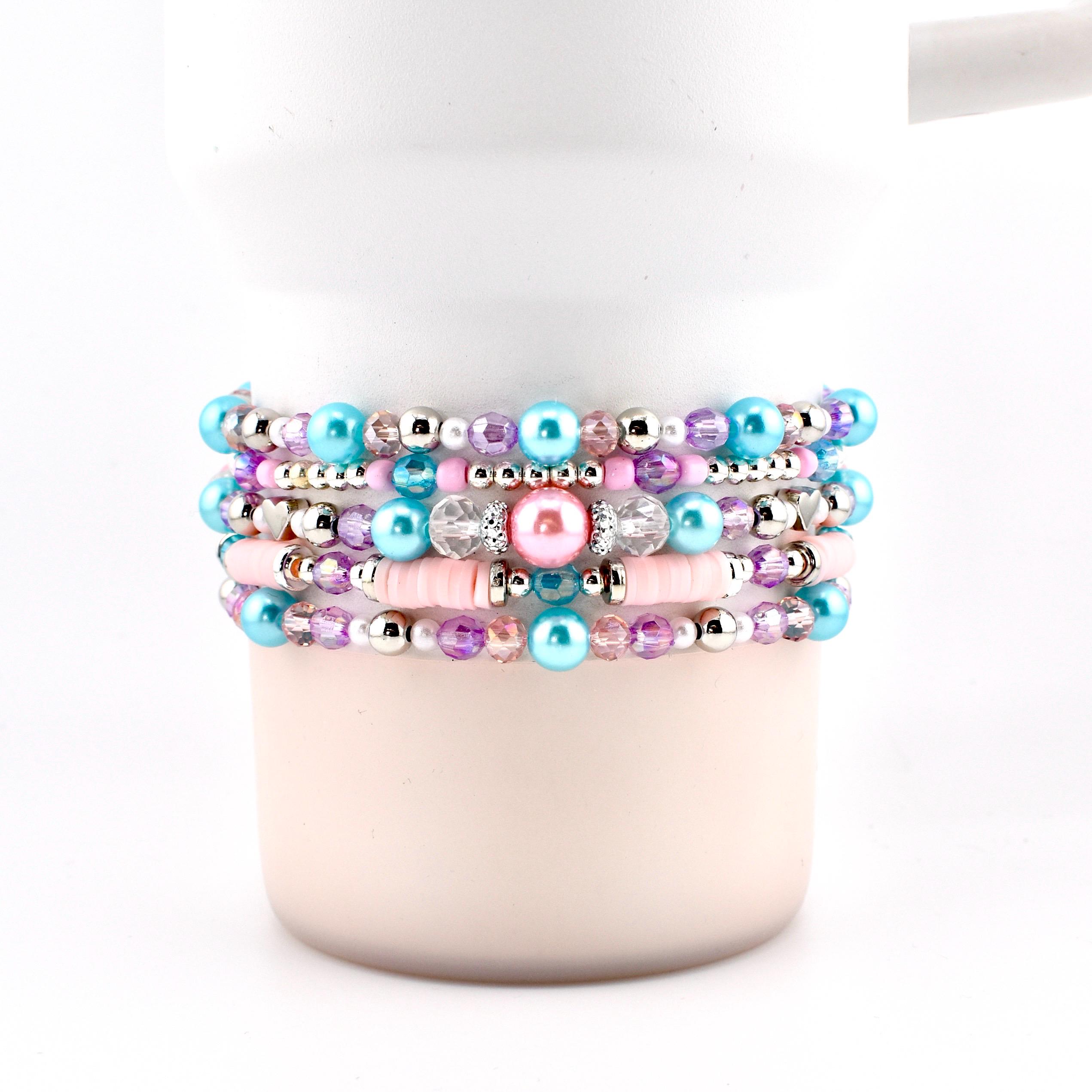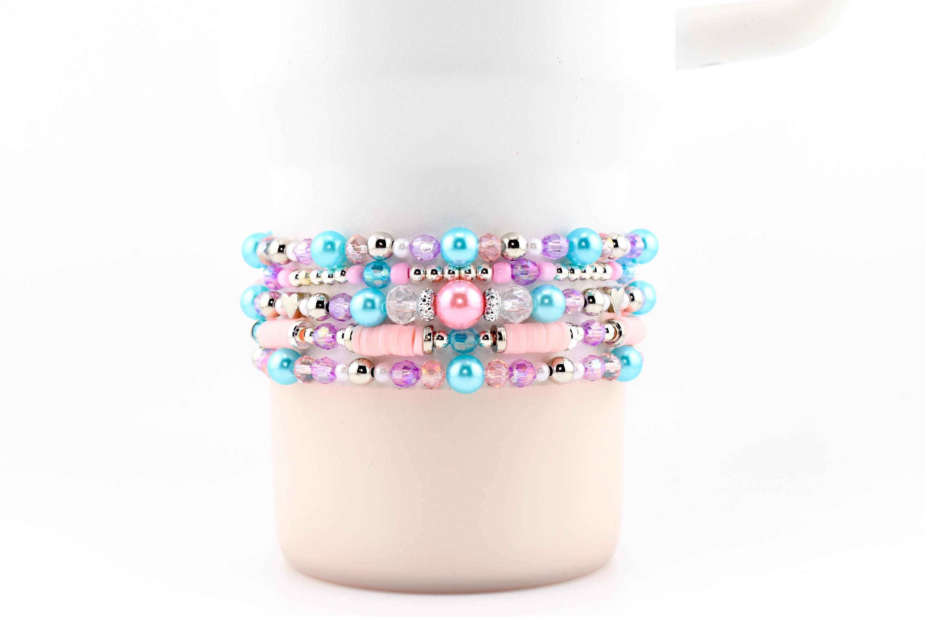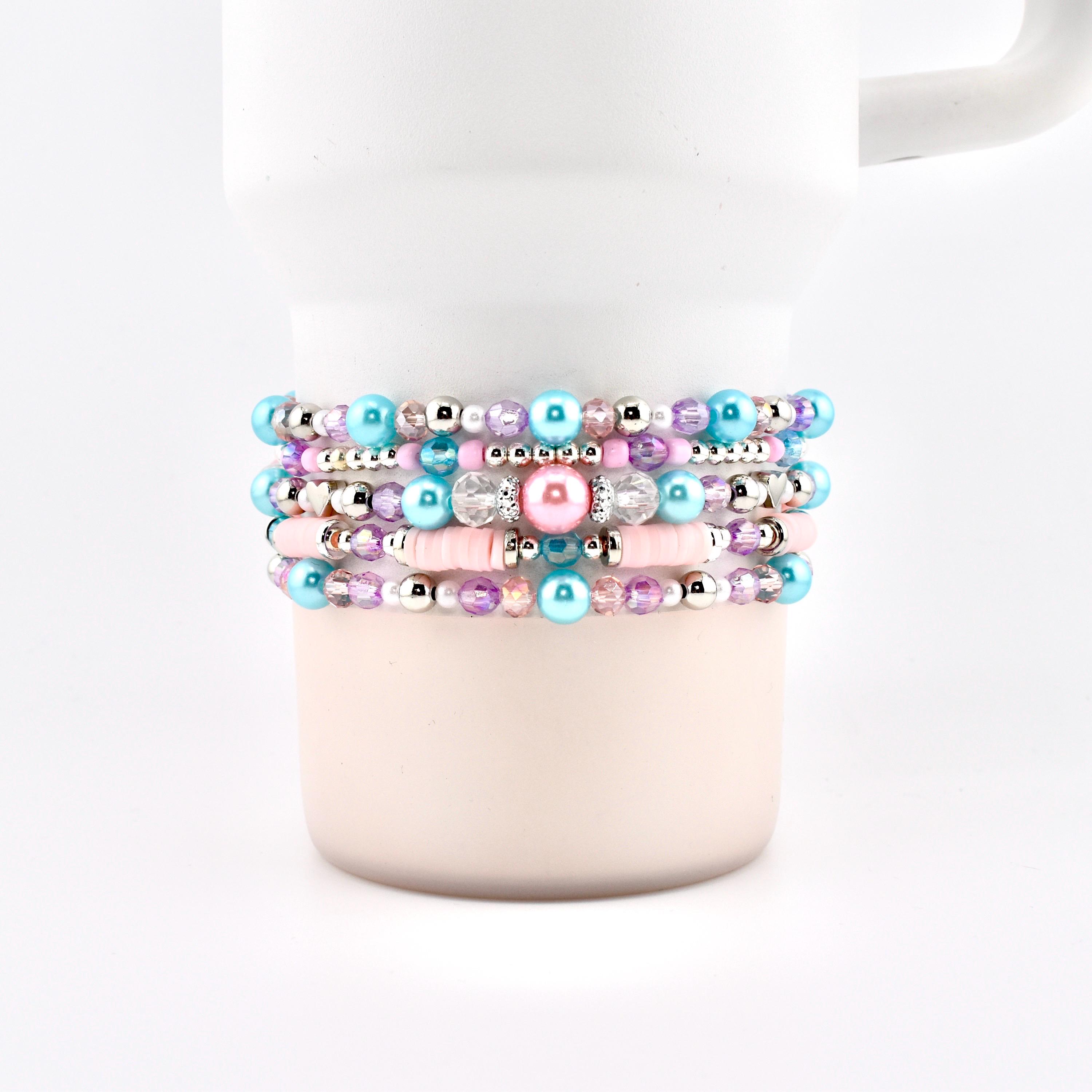 Meet your new favorite wrist or tumbler candy — a pastel-perfect bracelet stack that looks like it was made for golden hour. Featuring sky blue pearls, blush pink heishi discs, lavender crystals, silver accents and a show-stopping sparkling focal centerpiece, this set is pure magic from every angle.