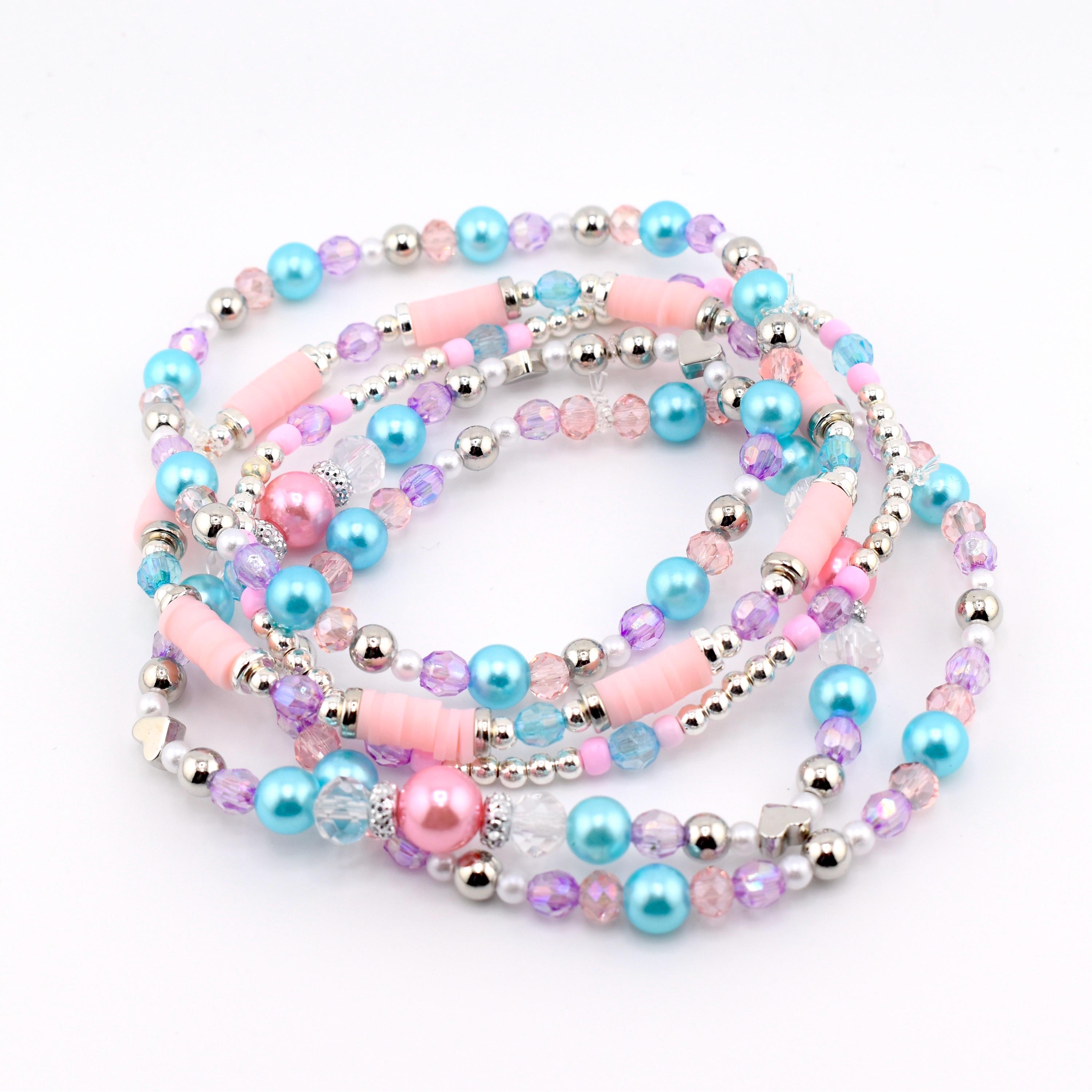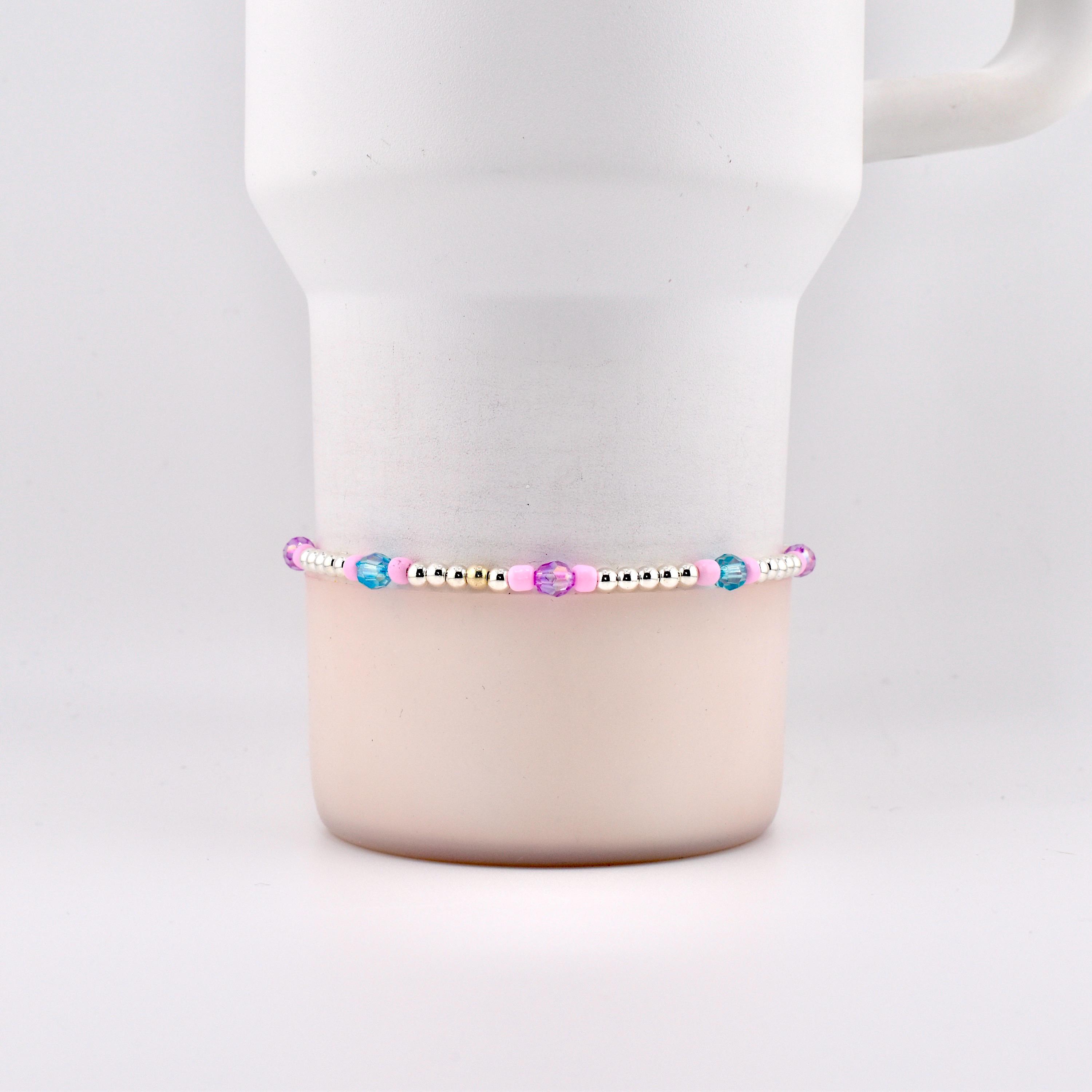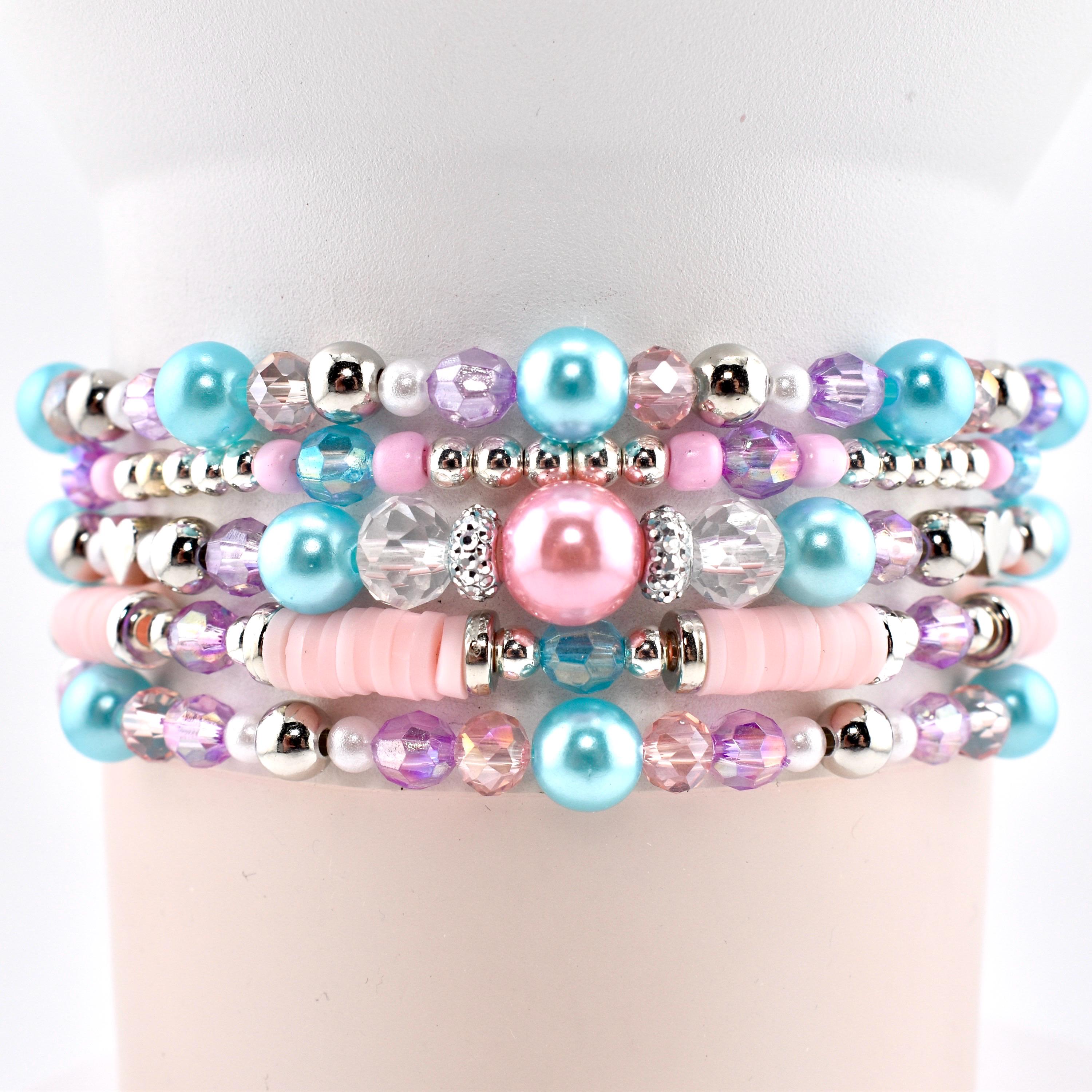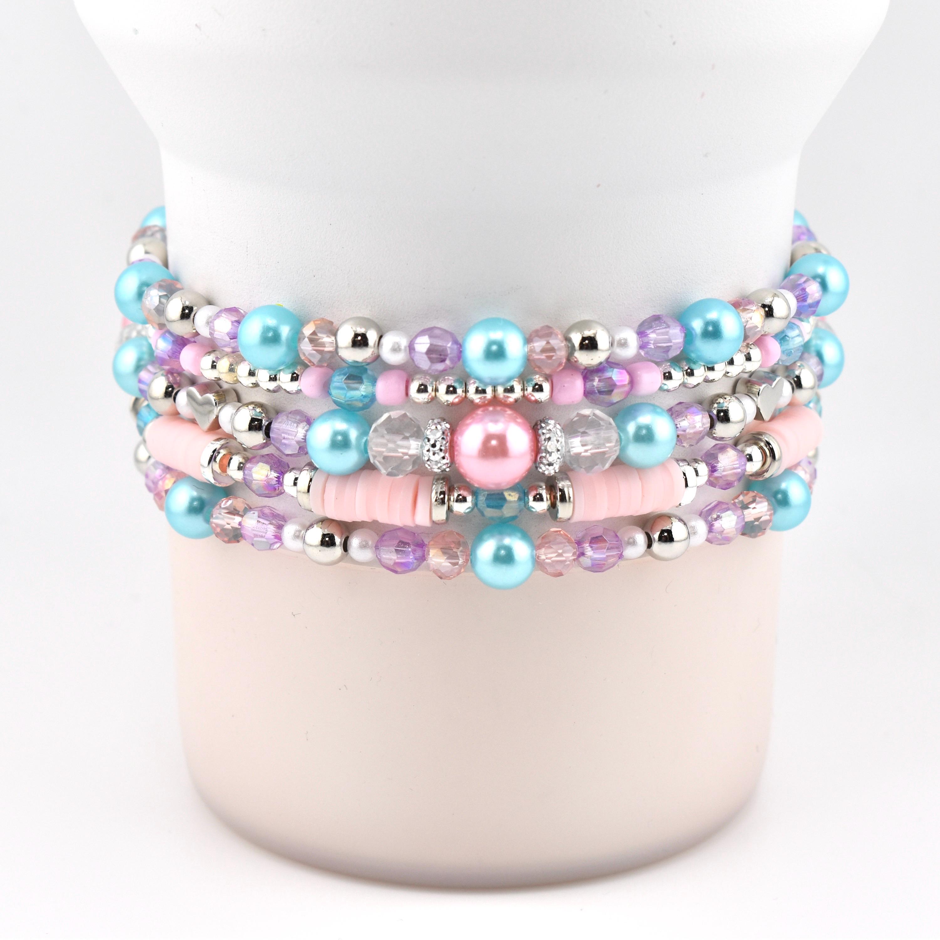 Meet your new favorite wrist or tumbler candy — a pastel-perfect bracelet stack that looks like it was made for golden hour. Featuring sky blue pearls, blush pink heishi discs, lavender crystals, silver accents and a show-stopping sparkling focal centerpiece, this set is pure magic from every angle.