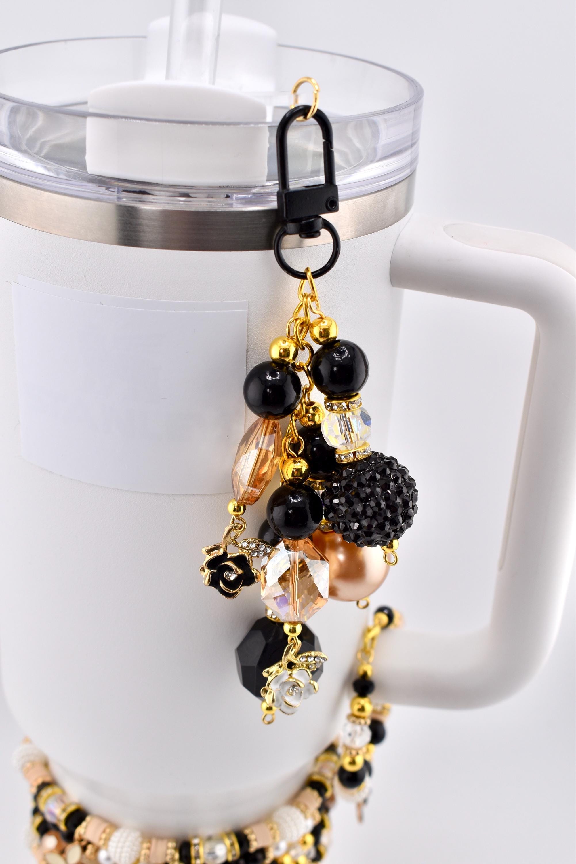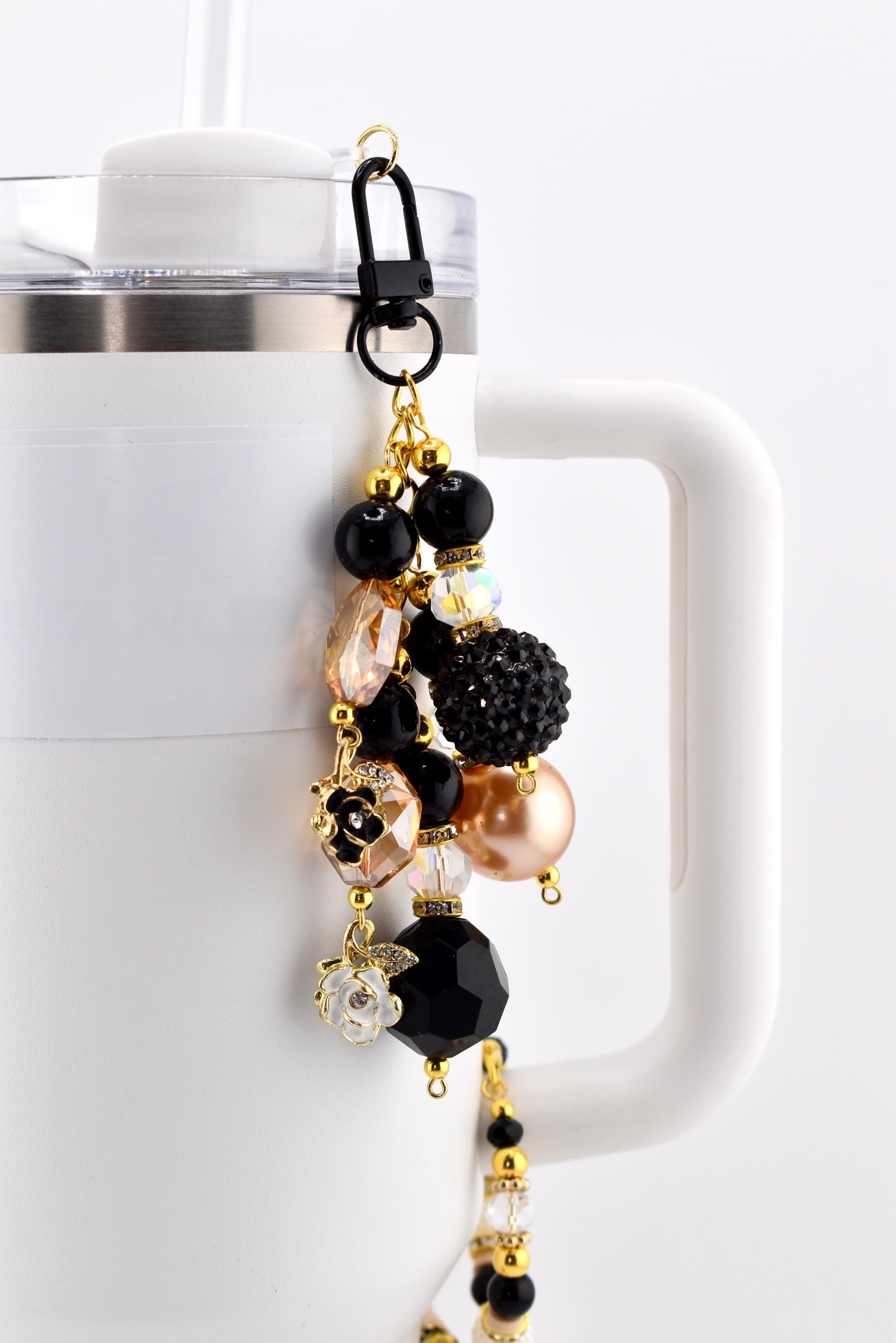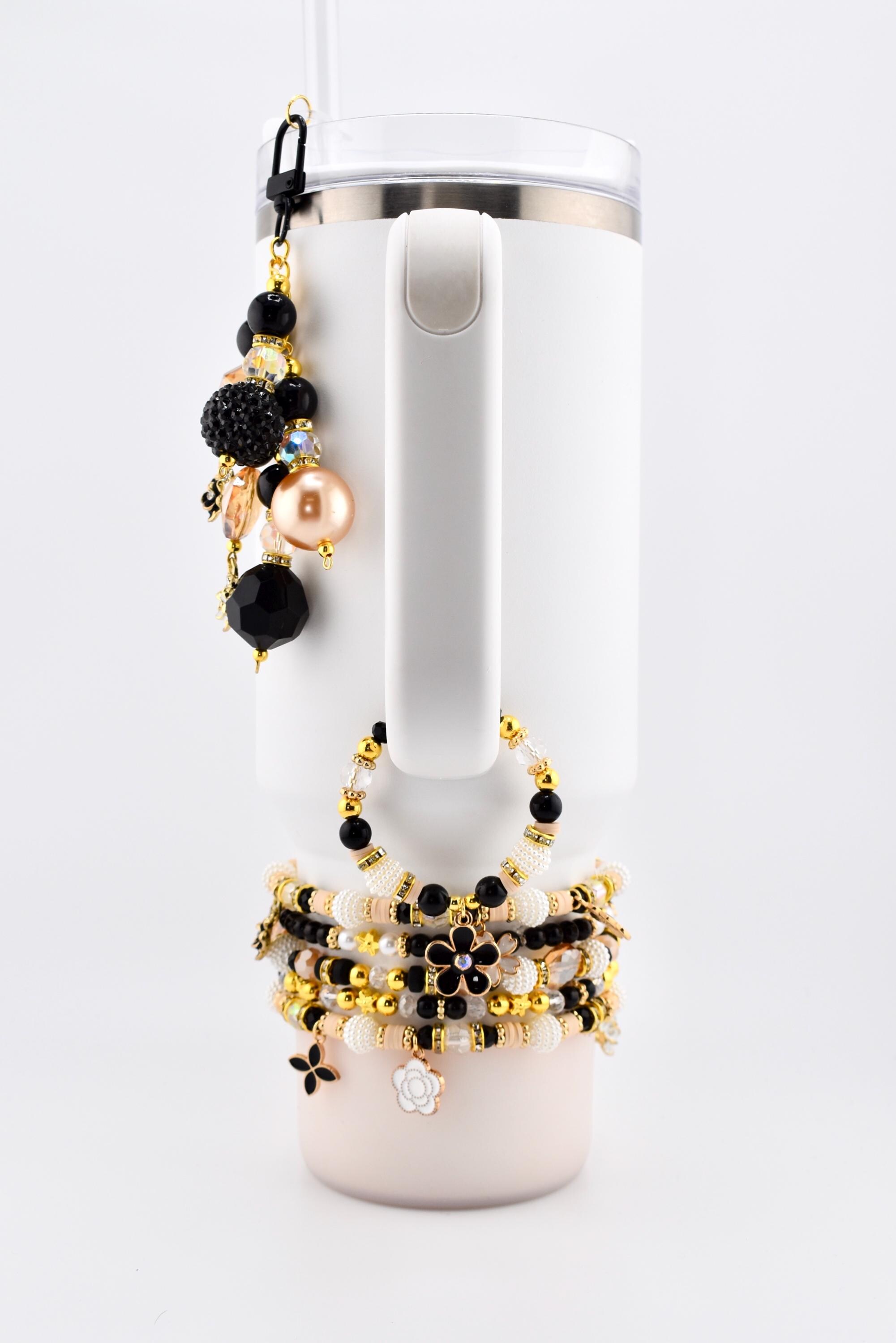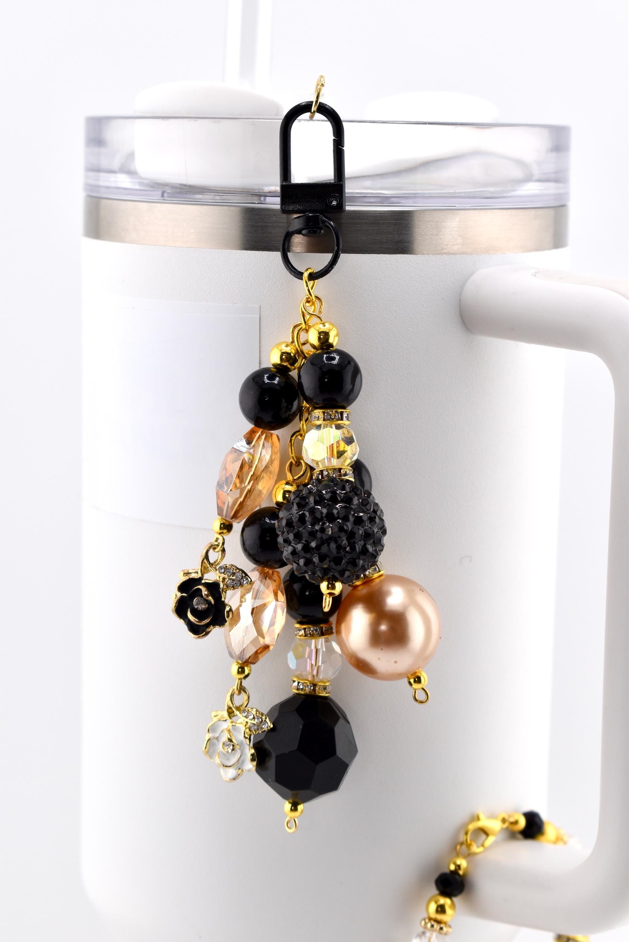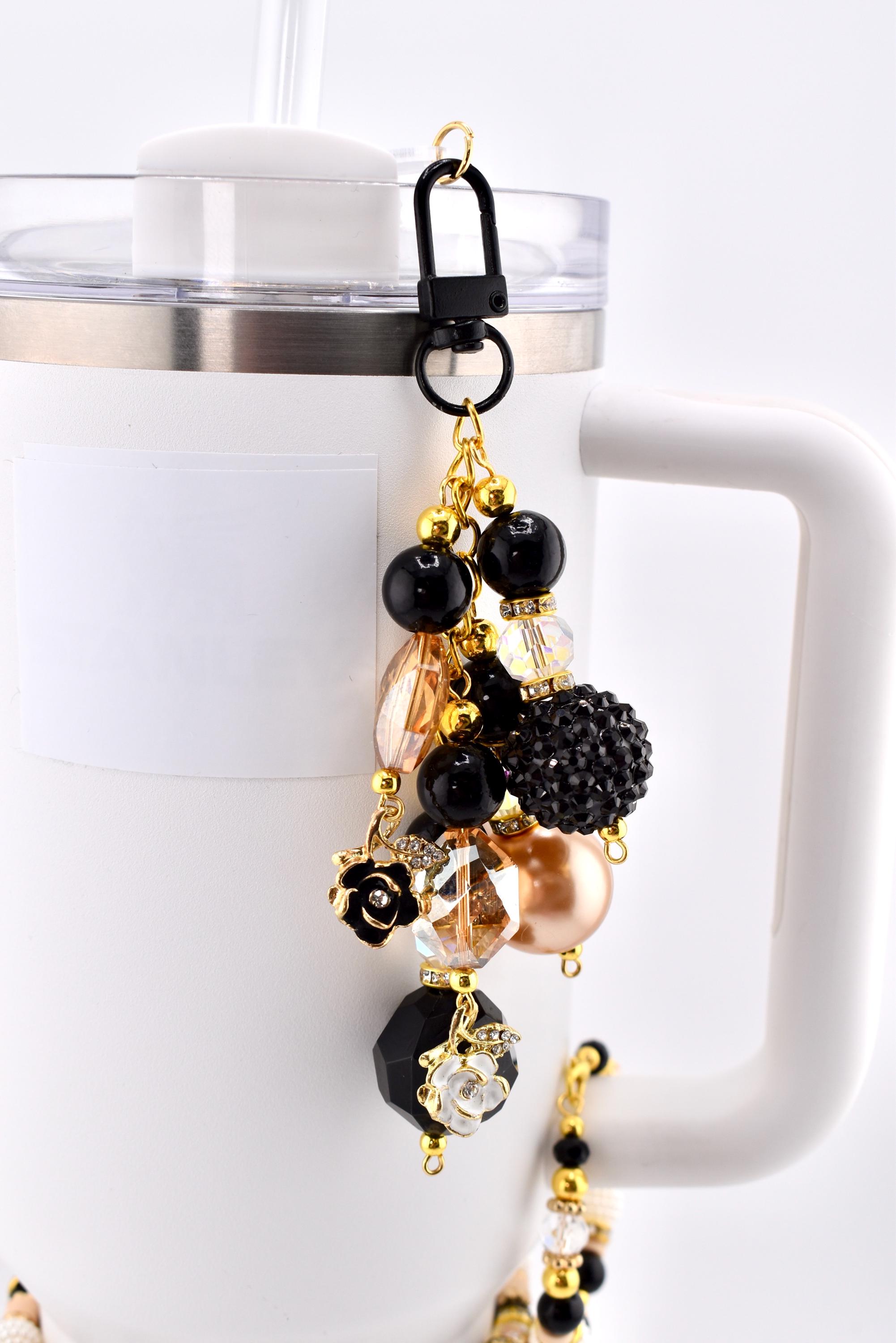 Add a little glam to your everyday carry with this stunning beaded tumbler straw charm in a classic black, gold and cream color palette. Featuring bold black beads, shiny gold accent beads, faceted crystal-clear beads, pearl-textured barrel beads and cream clay discs — all anchored by flower charms in black and gold.