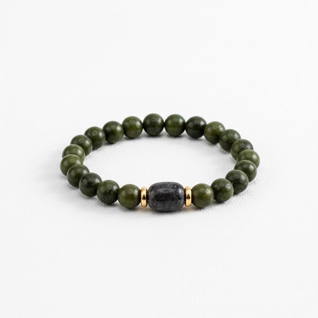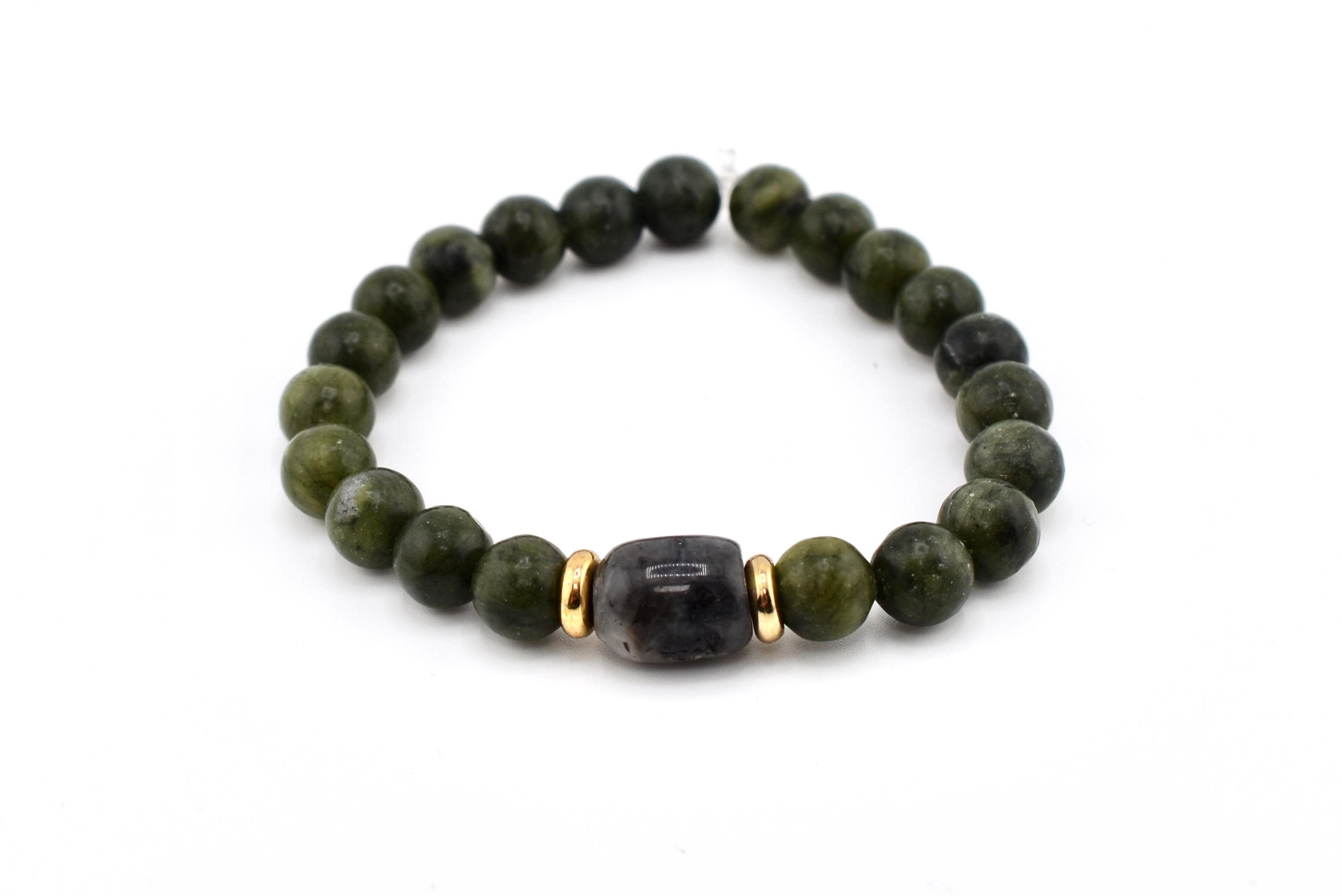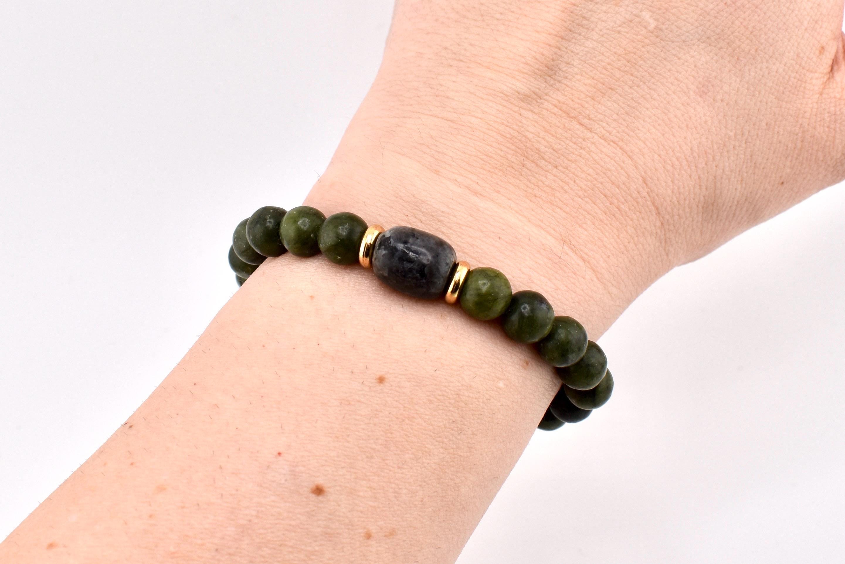 Bring a touch of natural elegance to your wrist with this handmade green nephrite jade bracelet. Smooth, polished jade beads in a rich forest green are accented by a darker jade tumble stone at the center, framed by gold-tone spacer beads for a subtle pop of warmth.
