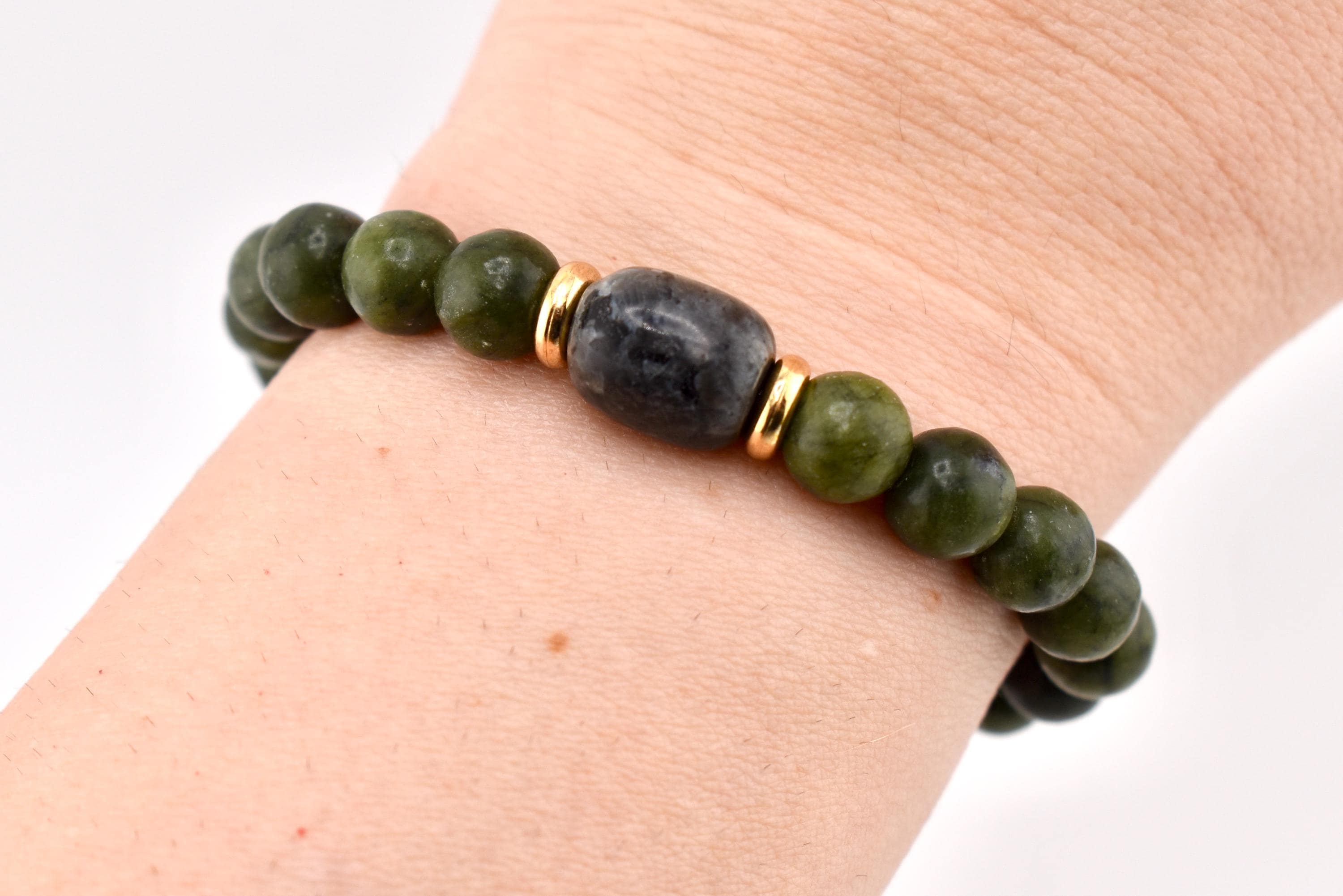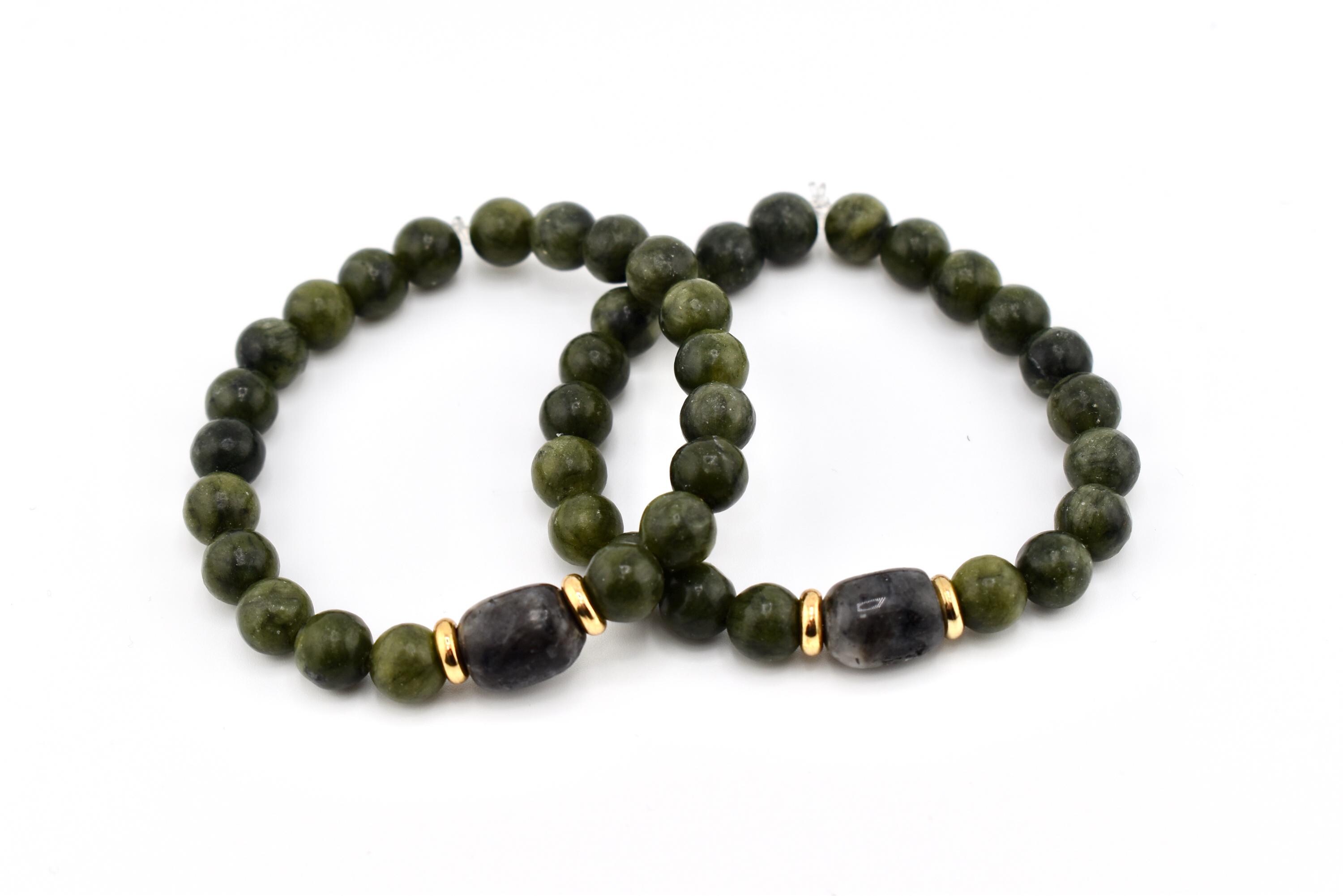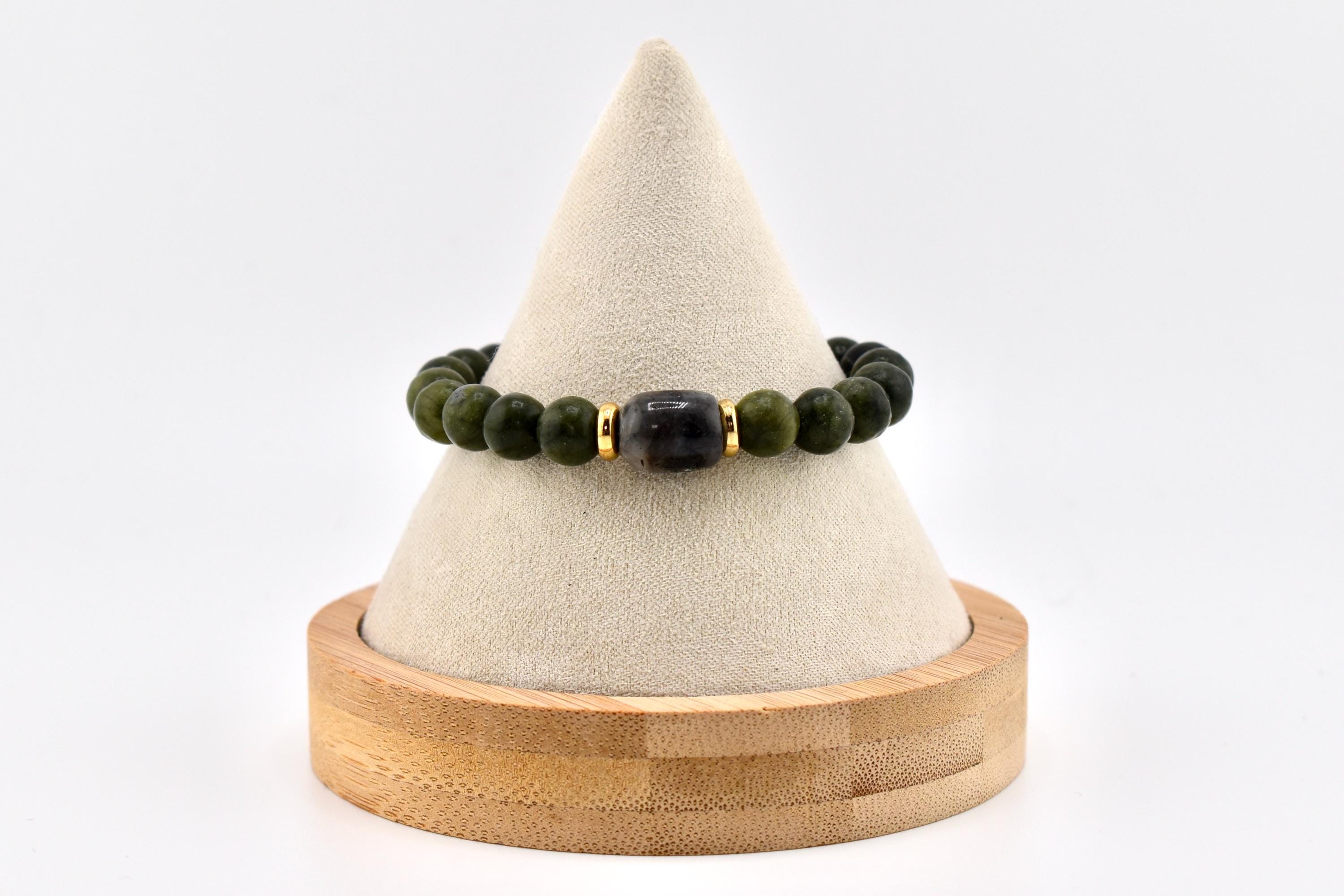 Bring a touch of natural elegance to your wrist with this handmade green nephrite jade bracelet. Smooth, polished jade beads in a rich forest green are accented by a darker jade tumble stone at the center, framed by gold-tone spacer beads for a subtle pop of warmth.