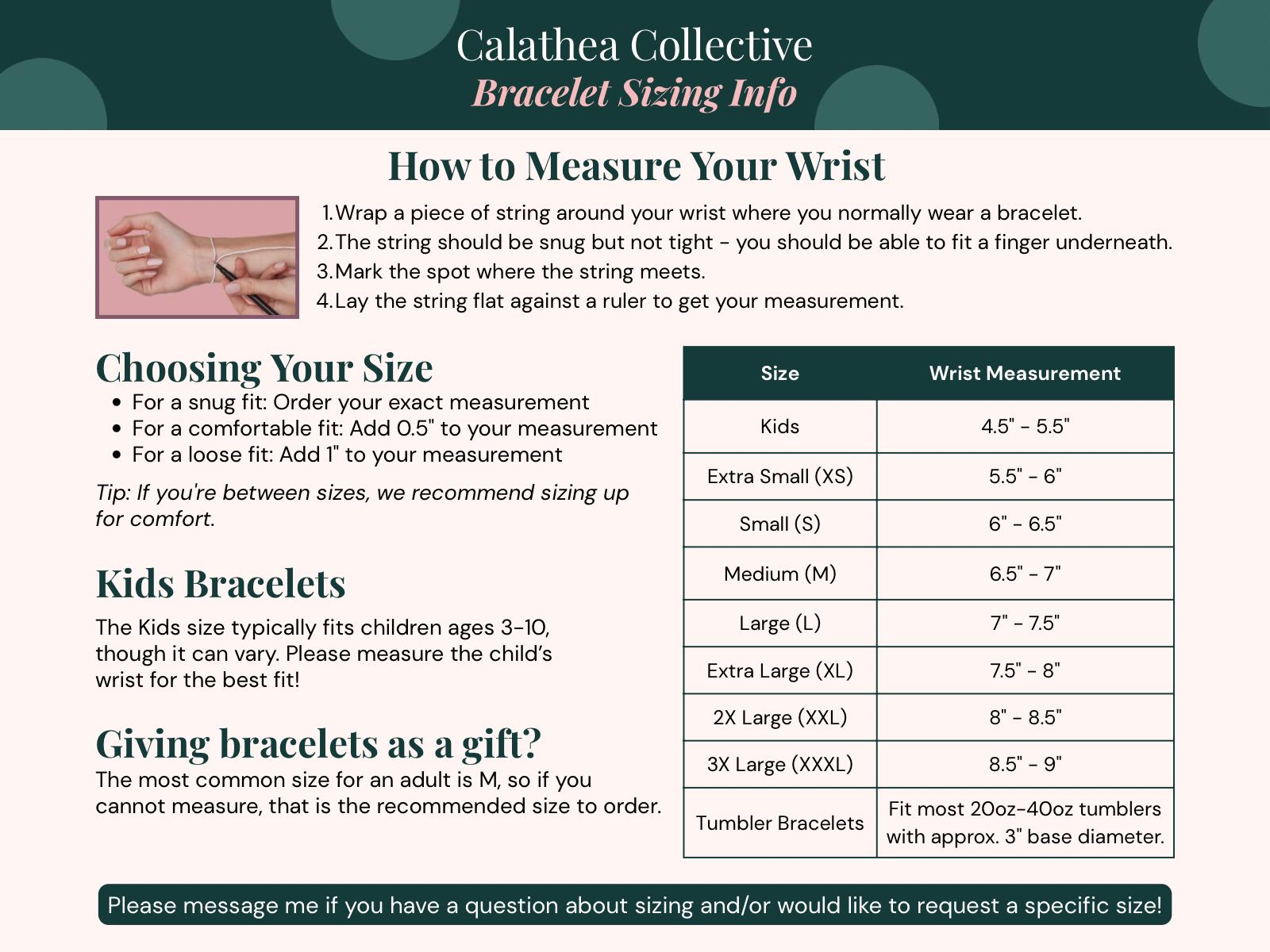 Calathea Collectiveβs tumbler bracelets are designed to fit the base of cup holder-friendly tumblers with a 3 inch base. If you're unsure about sizing or want to request a custom size, just send me a messageβIβm happy to help!